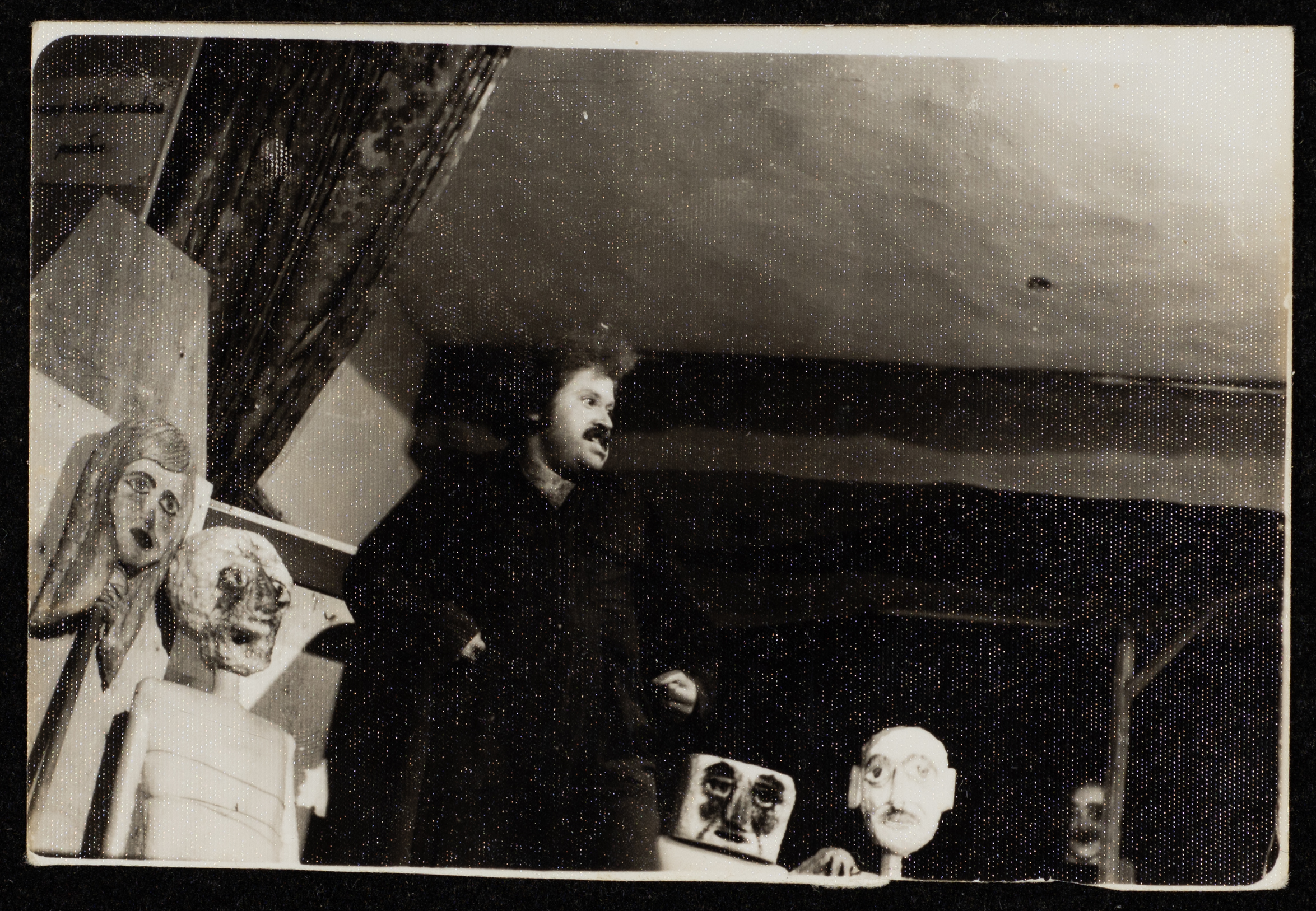 Taken at the Teachers' Training Centres at al-Masyoun Neighbourhood in Ramallah in 1981, according to Adel Tartir, this photograph shows Adel Tartir during a performance of the "Ras Roos (Head of Heads)" play. It is mentioned that this play is the first "monodrama" in the history of the Palestinian theatre movement, made by "The Wonder Box Theatre" and written, acted and directed by Adel Tartir in June 1980, while its name is derived from an Arabic curriculum by Khalil Sakakini. The play embodies realistic stories in a fictional world about nameless marginalized people in their communities, its first showing was on the playground of Sareyyat Ramallah in 1980 for three hours amidst a grand audience.