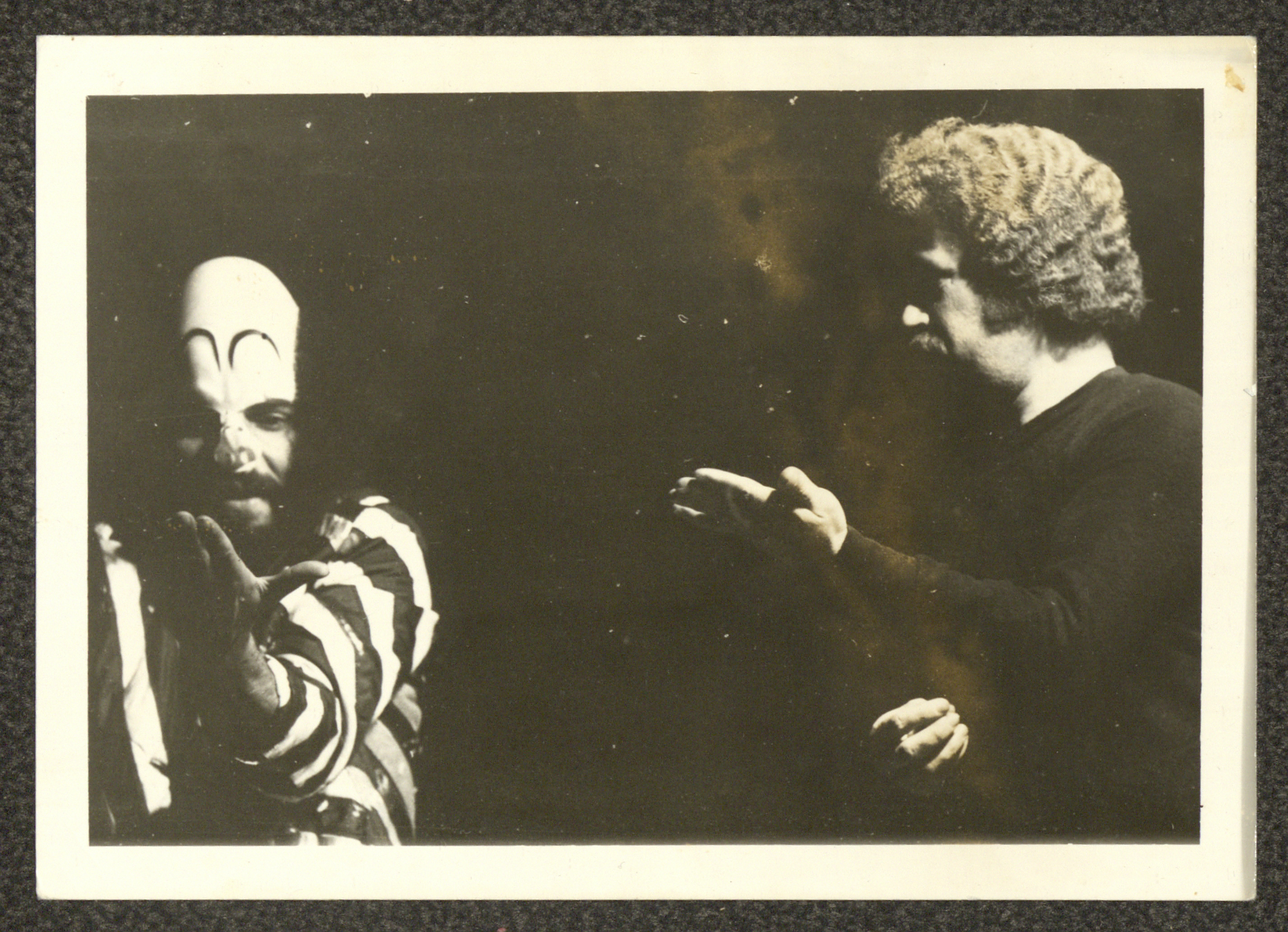 صورة التقطت لأحد المشاهد من مسرحية "تغريبة سعيد ابن فضل الله" ويظهر فيها على الترتيب؛ ومن اليمين "عادل الترتير" مخاطباً "خلف أمير طه" وذلك على خشبة مسرح قاعة بلدية رام الله. ويذكرُ أن هذه المسرحية تم تأليفها وإنتاجها بشكلٍ جماعي بواسطة "فرقة صندوق العجب" في عام 1979، ولم يكن مسرح البلدية آنذاك جاهزاً بالكامل، وعليه قام الفريق باستصلاحه؛ حيث كان عبارة عن كومة من التراب دون أي بلاطٍ وحتى شبابيك وأصبح إبان ذلك صالحاً لاستقبال أكثر من 500 مقعد.