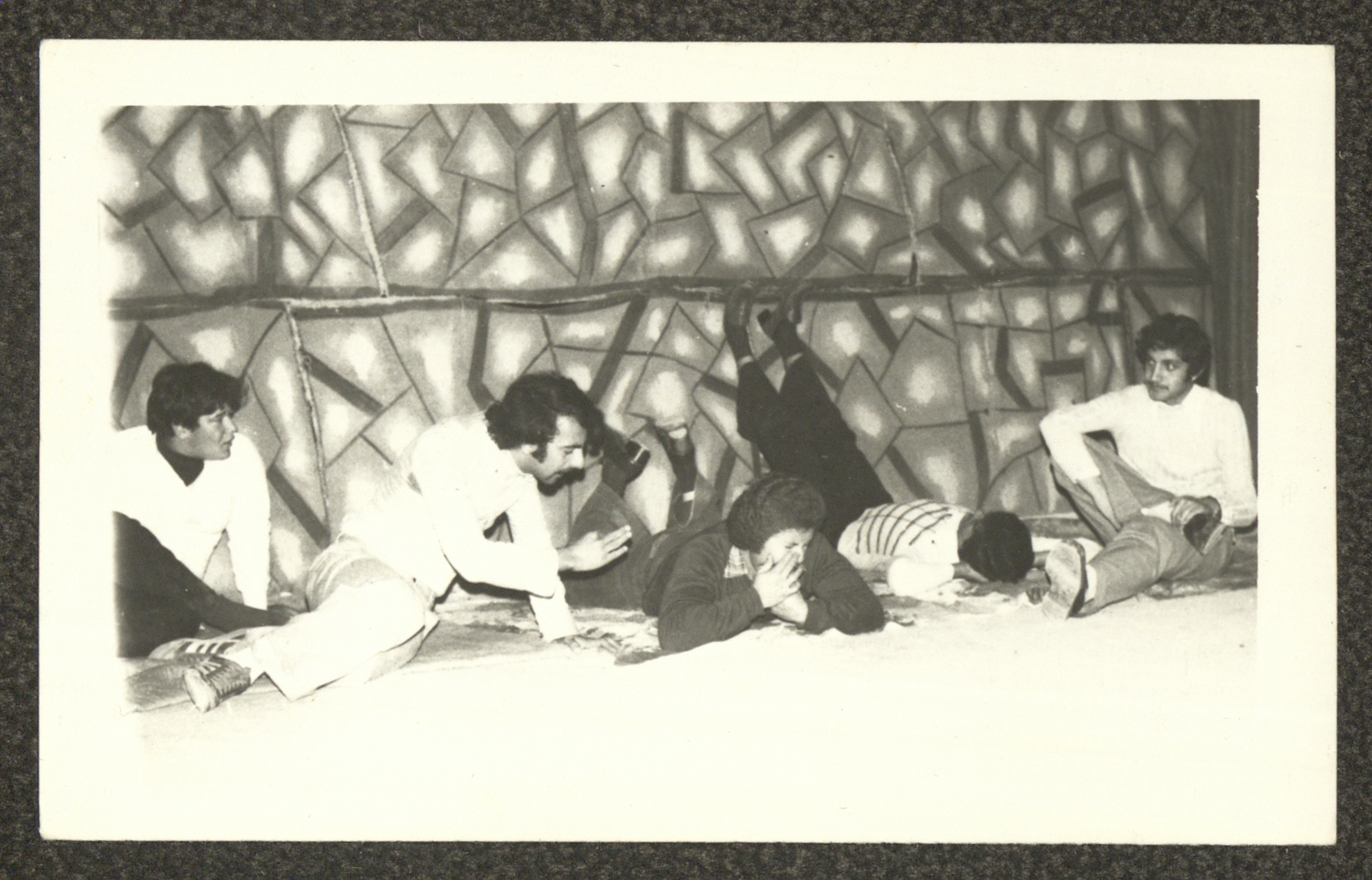 Undated, this photograph shows the rehearsals for the play "Taghreebet Saeed ibn Fadlallah (The Exile of Saeed ibn Fadlallah)" at Sareyyat Ramallah, including -from the right- Majdi al-Malki, an unknown person, Adel Tartir, Isam Nassar and Najeh abu Shamseyyeh. It is worth mentioning that the play was collectively written and directed by the "the Wonder Box" troupe in 1979.
