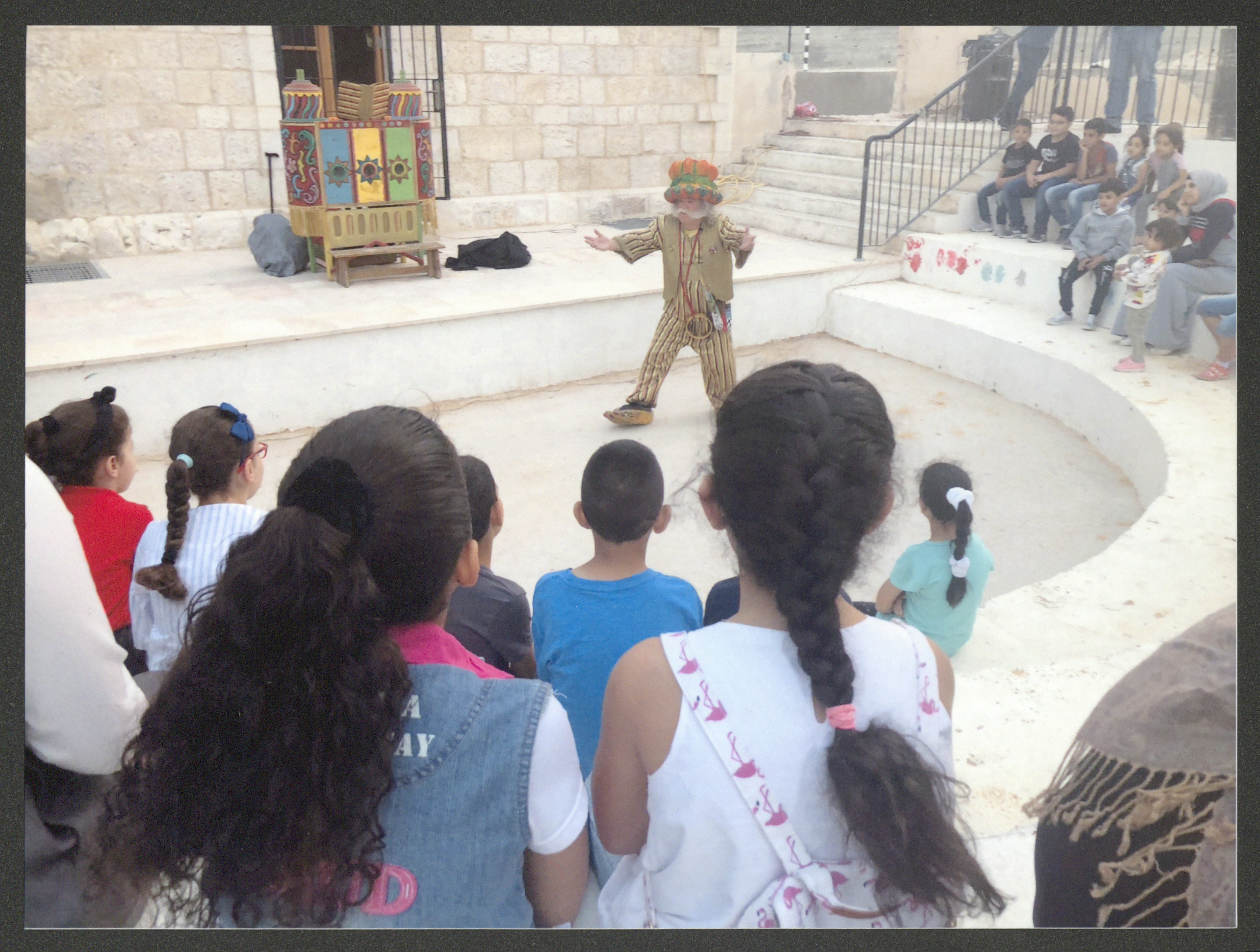 صورة التقطت لعادل الترتير المعروف بشخصية "أبو العجب" أثناء تقديمه عرضاً من "حكايات أبو العجب" في حديقة البيارة في مدينة العيزرية الواقعة إلى الشرق من مدينة القدس بتاريخ 13 أيلول 2018، وكان هذا العرض موجهاً إلى كافة أفراد الأسرة.