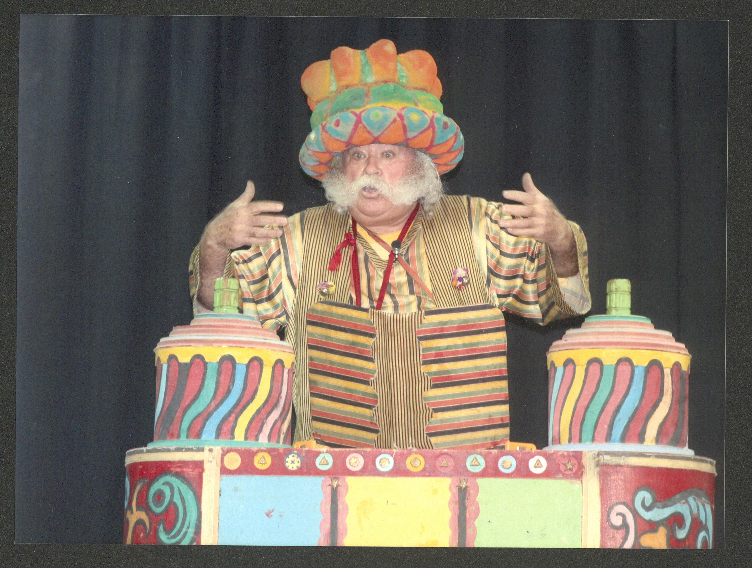Taken on the International Day of Disabled Persons, this photograph shows Adel Tartir (aka Abu al-Ajab) performing the "Hikayat Abu al-Ajab" show on the stage of "Hamdi Mango" in Nablus on 4 December 2018, in cooperation with the "Art from the Heart" initiative, the Nablus municipality and A. M. Qattan Foundation.