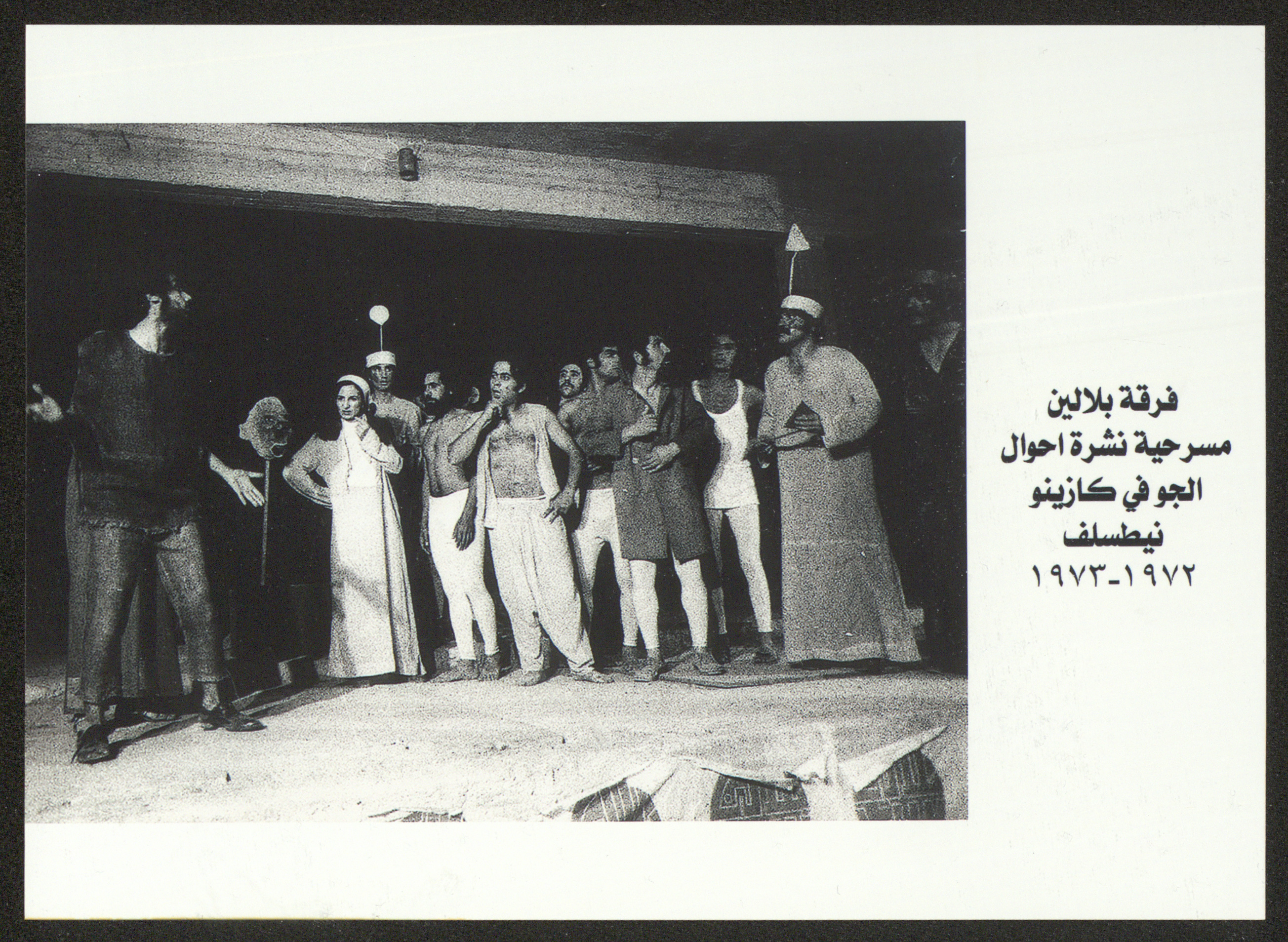صورة التقطت لفرقة "بلالين" من أحد عروض مسرحية "نشرة أحوال الجو في كازينو نيطلسف"، حيث أنتجت وأخرجت الأخيرة من قبل فرقة "بلالين" ما بين عامي 1972-1973.