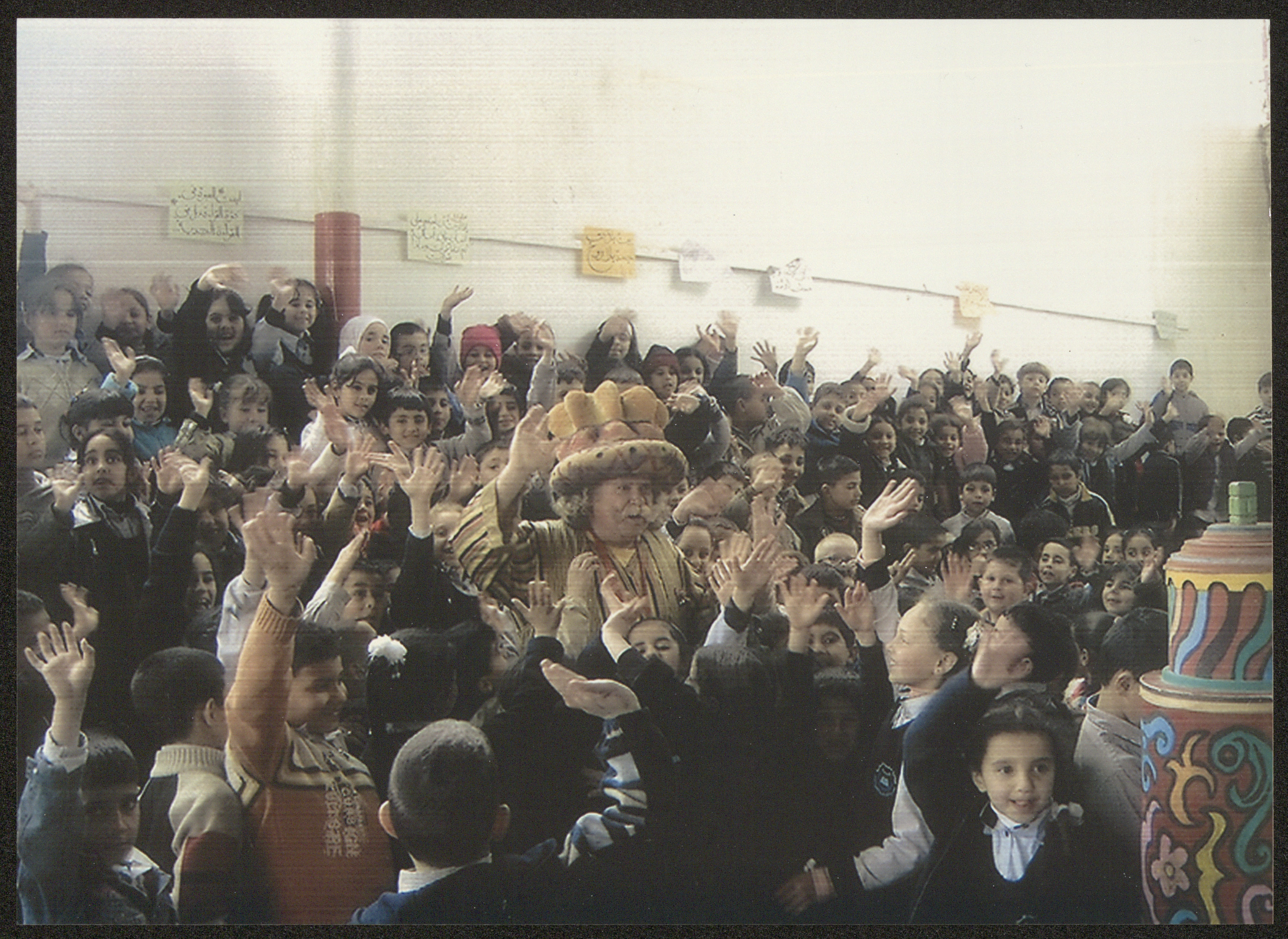 Taken between 2004-2005, this photograph shows Adel Tartir (aka Abu al-Ajab) surrounded by children while performing one of "Hikayat abu al-Ajab Series" shows at the Islamic Secondary School for girls in al-Bireh.