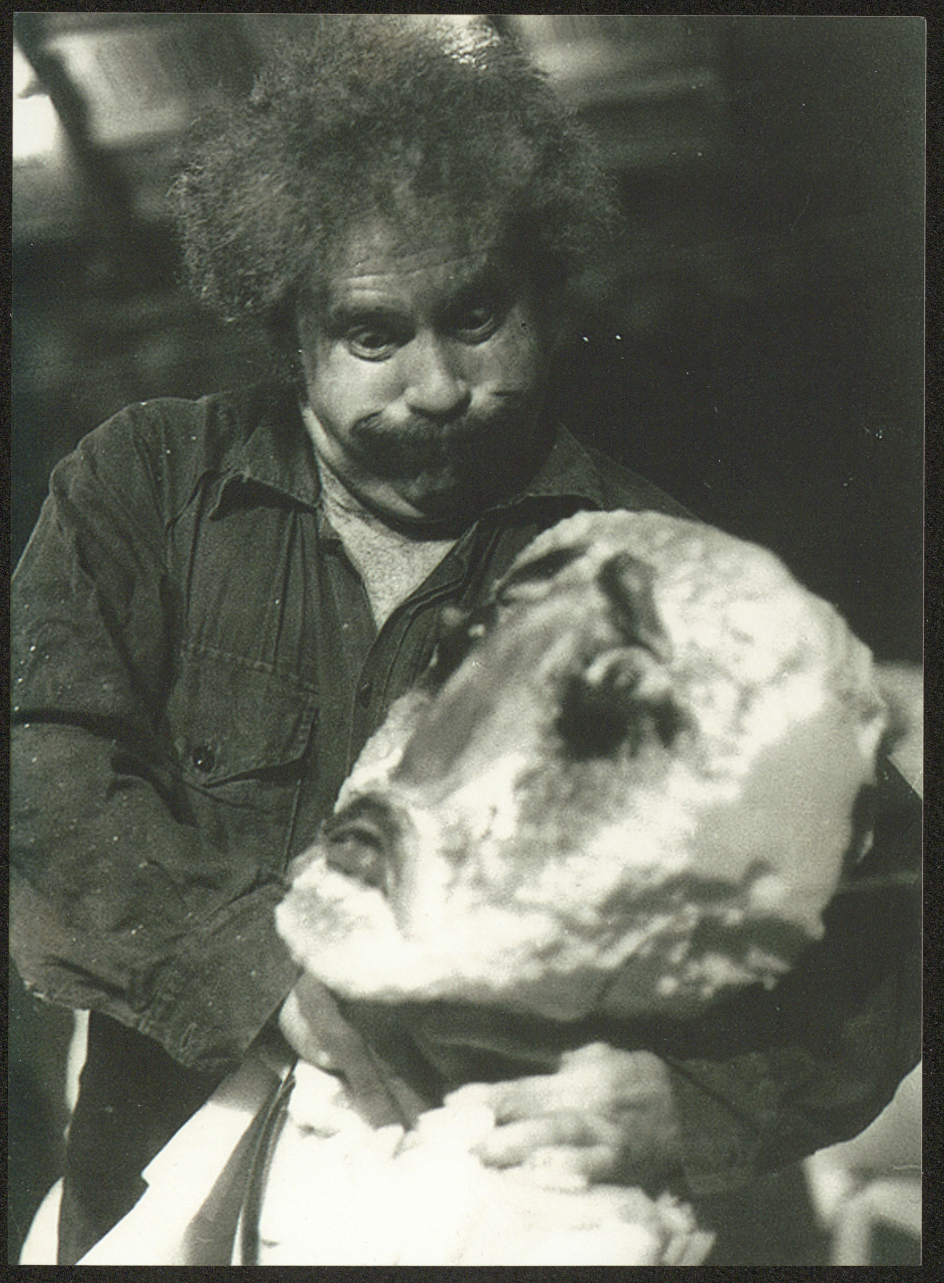 Undated, this photograph shows Adel Tartir with the "soldier" character from the "Ras Roos (Head of Heads)" play, which is the first "monodrama" in the history of the Palestinian theatre movement, made by "The the Wonder Box Theatre" and written, acted and directed by Adel Tartir in June 1980, while its name is derived from an Arabic curriculum by Khalil Sakakini. The play embodies realistic stories in a fictional world about nameless marginalized people in their communities, its first showing was on the playground of Sareyyat Ramallah in 1980 for three hours amidst a grand audience.