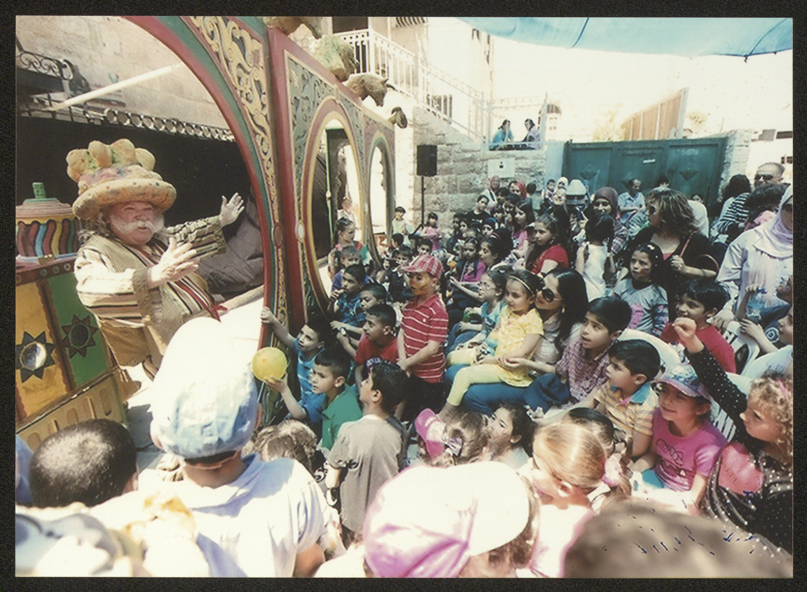 صورة التقطت لعادل الترتير المعروف بشخصية "أبو العجب" ومجموعة من الأطفال من أمام مقر مسرح صندوق العجب في رام الله وذلك على هامش مشاركته في عروض مهرجان نوار نيسان في 26 و27 نيسان 2013.