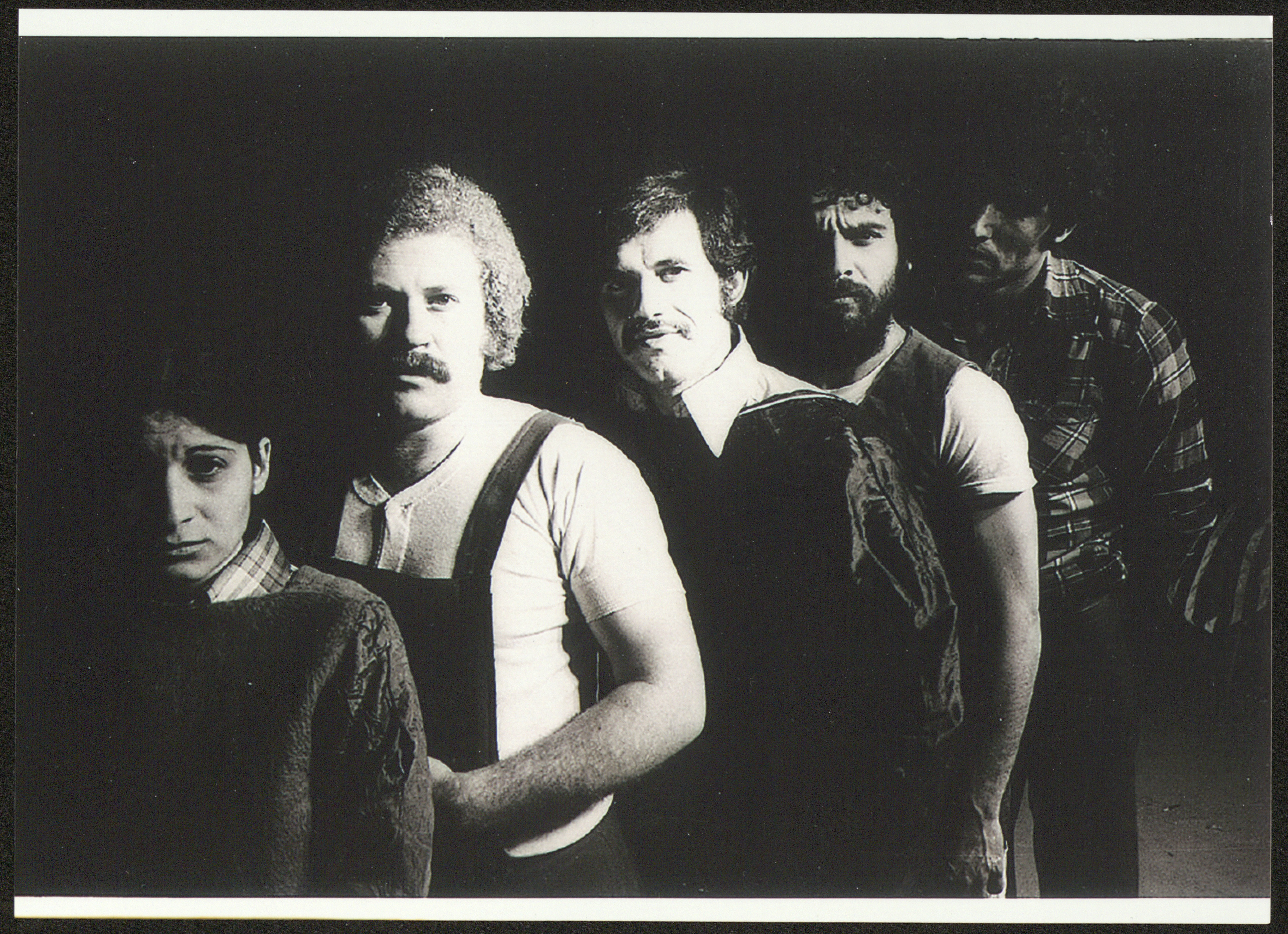 Undated, this photograph shows a scene from the play "Taghreebet Saeed ibn Fadlallah (The Exile of Saeed ibn Fadlallah)", including -from the right- Sonia Nimr, Adel Tartir, Omar Samara, Khalaf Amir Taha and Anis al-Barghouthi. It is worth mentioning that the play was collectively written and directed by the "Wonder Box" troupe.