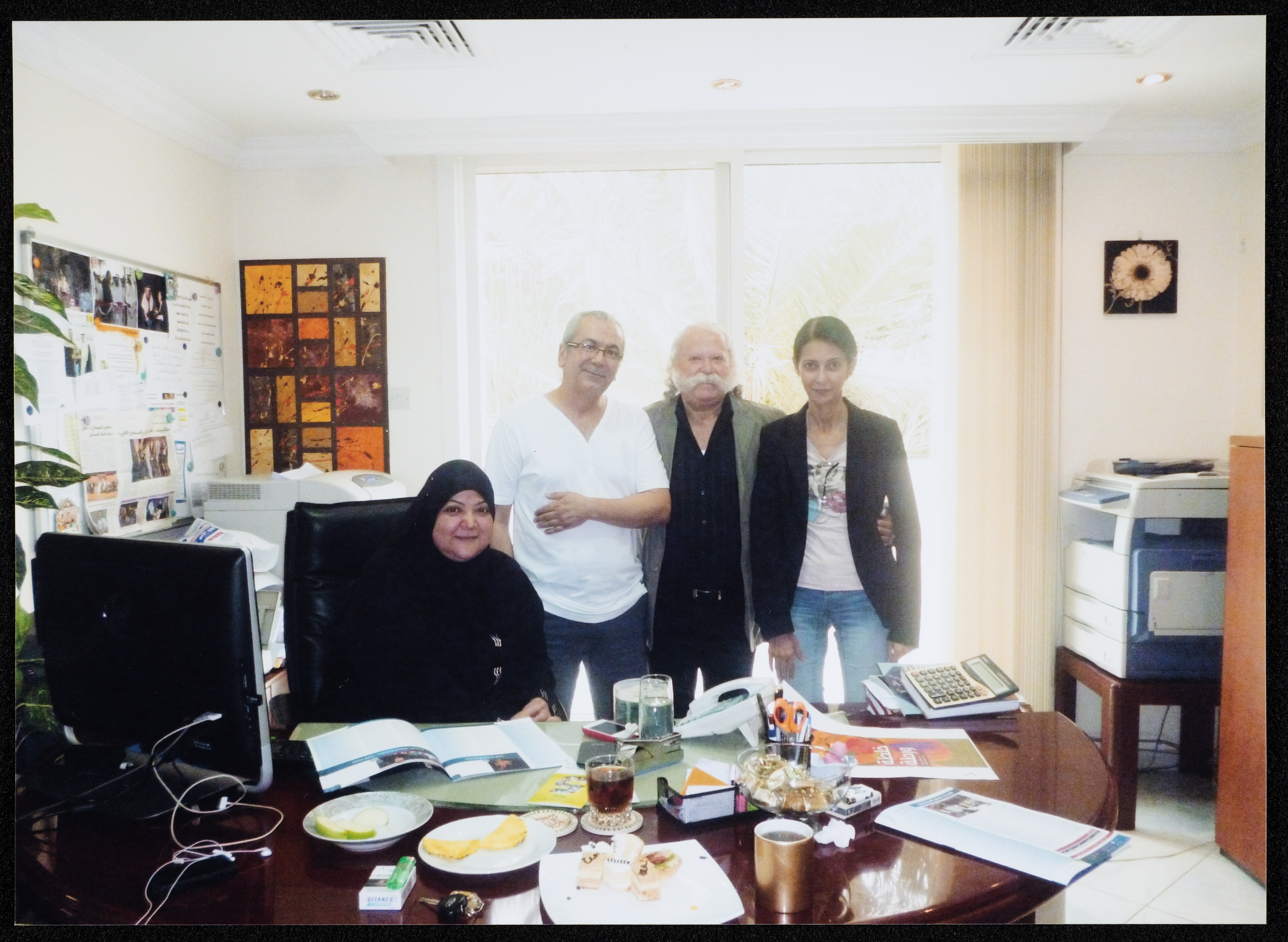 صورة التقطت لعادل الترتير برفقة المؤلف والمخرج "غنام غنام" وامرأتين من عائلة "الغُصين" في مقر "الهيئة العربية للمسرح" في إمارة الشارقة، وذلك على هامش مشاركتهما في الدورة الثالثة والعشرين من مهرجان "أيام الشارقة المسرحية" المنعقد في الفترة ما بين 17-27 آذار.
