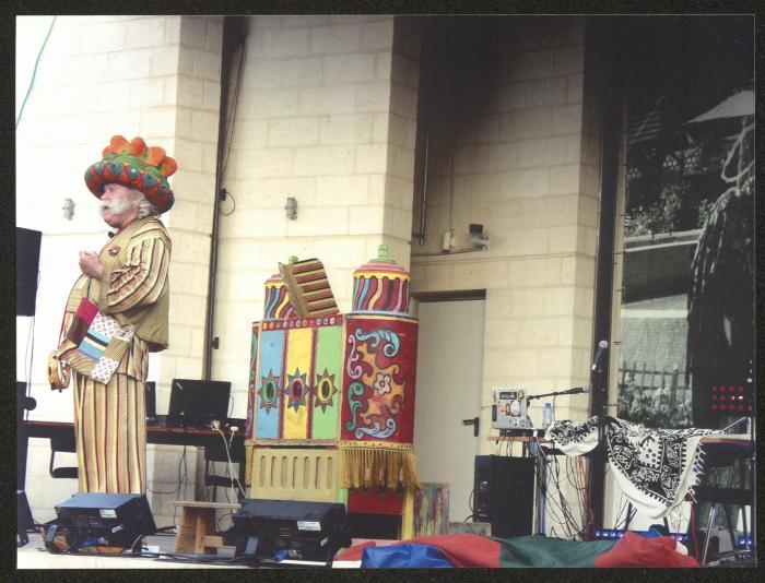 Taken on the municipal stage in Ramallah on 25 August 2017, this photograph shows Adel Tartir (aka Abu al-Ajab) during a performance of the "Hikayat abu al-Ajab Series" Show for the "Sundouq al-Ajab (the Wonder Box)" theatre, as part of his participation in the "Al-Harajeh Market", a popular market organized by the Ramallah Municipality.