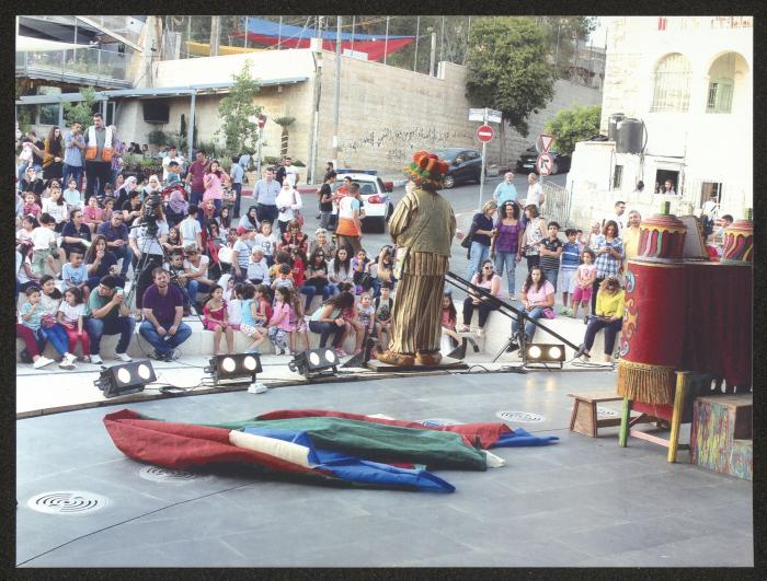 Taken on the municipal stage in Ramallah on 25 August 2017, this photograph shows Adel Tartir (aka Abu al-Ajab) during a performance of the "Hikayat abu al-Ajab Series" Show for the "Sundouq al-Ajab (the Wonder Box)" theatre, as part of his participation in the "Al-Harajeh Market", a popular market organized by the Ramallah Municipality.