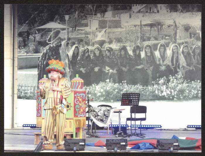 Taken on the municipal stage in Ramallah on 25 August 2017, this photograph shows Adel Tartir (aka Abu al-Ajab) during a performance of the "Hikayat abu al-Ajab Series" Show for the "Sundouq al-Ajab (the Wonder Box)" theatre, as part of his participation in the "Al-Harajeh Market", a popular market organized by the Ramallah Municipality.