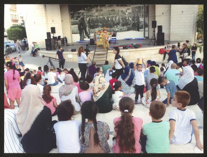 Taken on the municipal stage in Ramallah on 25 August 2017, this photograph shows Adel Tartir (aka Abu al-Ajab) during a performance of the "Hikayat abu al-Ajab Series" Show for the "Sundouq al-Ajab (the Wonder Box)" theatre, as part of his participation in the "Al-Harajeh Market", a popular market organized by the Ramallah Municipality.
