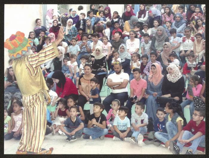 Taken at the Ottoman Court in Ramallah on 21 September 2017, this photograph shows Adel Tartir (aka Abu al-Ajab) performing one of his shows from "Hikayat Abu al-Ajab" for "Sunduq al-Ajab (the Wonder Box)" theatre during the activities of "Yalla Al Hadeeqa" Festival.
