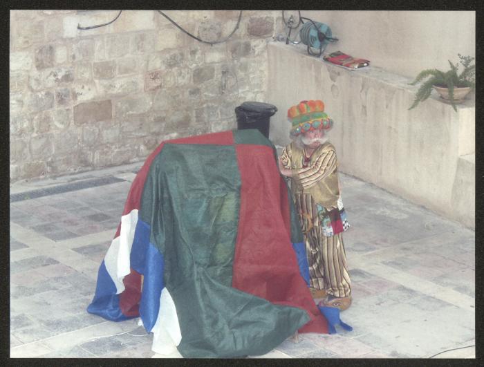 Taken at the Ottoman Court in Ramallah on 21 September 2017, this photograph shows Adel Tartir (aka Abu al-Ajab) and some of the audience while performing one of his shows from "Hikayat Abu al-Ajab" for "Sunduq al-Ajab (the Wonder Box)" theatre during the activities of "Yalla Al Hadeeqa" Festival.