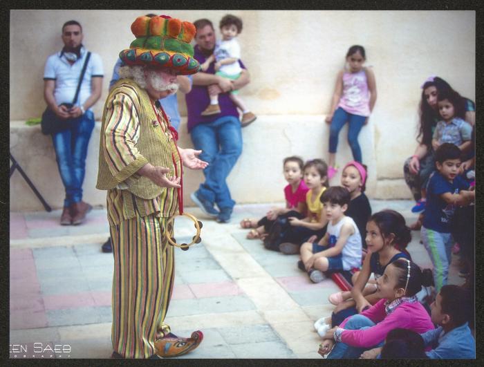 Taken by Amin Sa'eb at the Ottoman Court in Ramallah on 21 September 2017, this photograph shows Adel Tartir (aka Abu al-Ajab) performing one of his shows from "Hikayat Abu al-Ajab" for "Sunduq al-Ajab (the Wonder Box)" theatre during the activities of "Yalla Al Hadeeqa" Festival.