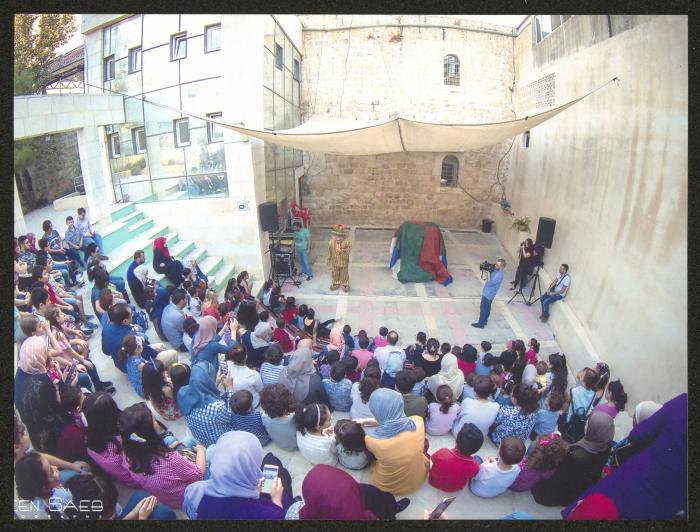 Taken by Amin Sa'eb at the Ottoman Court in Ramallah on 21 September 2017, this photograph shows Adel Tartir (aka Abu al-Ajab) performing one of his shows from "Hikayat Abu al-Ajab" for "Sunduq al-Ajab (the Wonder Box)" theatre during the activities of "Yalla Al Hadeeqa" Festival.
