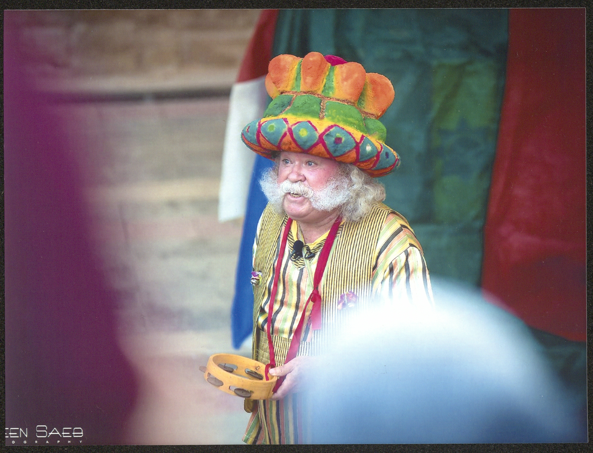 صورة التقطت لعادل الترتير المعروف بشخصية "أبو العجب"، من عدسة "أمين صائب"، أثناء تأدية أحد عروضه من "حكايات أبو العجب" لمسرح "صندوق العجب" في المحكمة العثمانية في مدينة رام الله بتاريخ 21 أيلول 2017، وذلك على هامش مشاركته في فعاليات مهرجان "يلا عَ الحديقة".