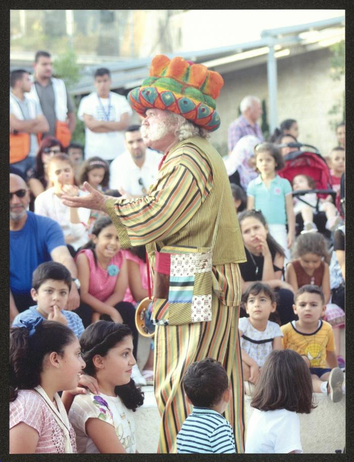 Taken on the municipal stage in Ramallah on 25 August 2017, this photograph shows Adel Tartir (aka Abu al-Ajab) in the middle of the audience during a performance of the "Hikayat abu al-Ajab Series" Show for the "Sundouq al-Ajab (the Wonder Box)" theatre, as part of his participation in the "Al-Harajeh Market", a popular market organized by the Ramallah Municipality.
