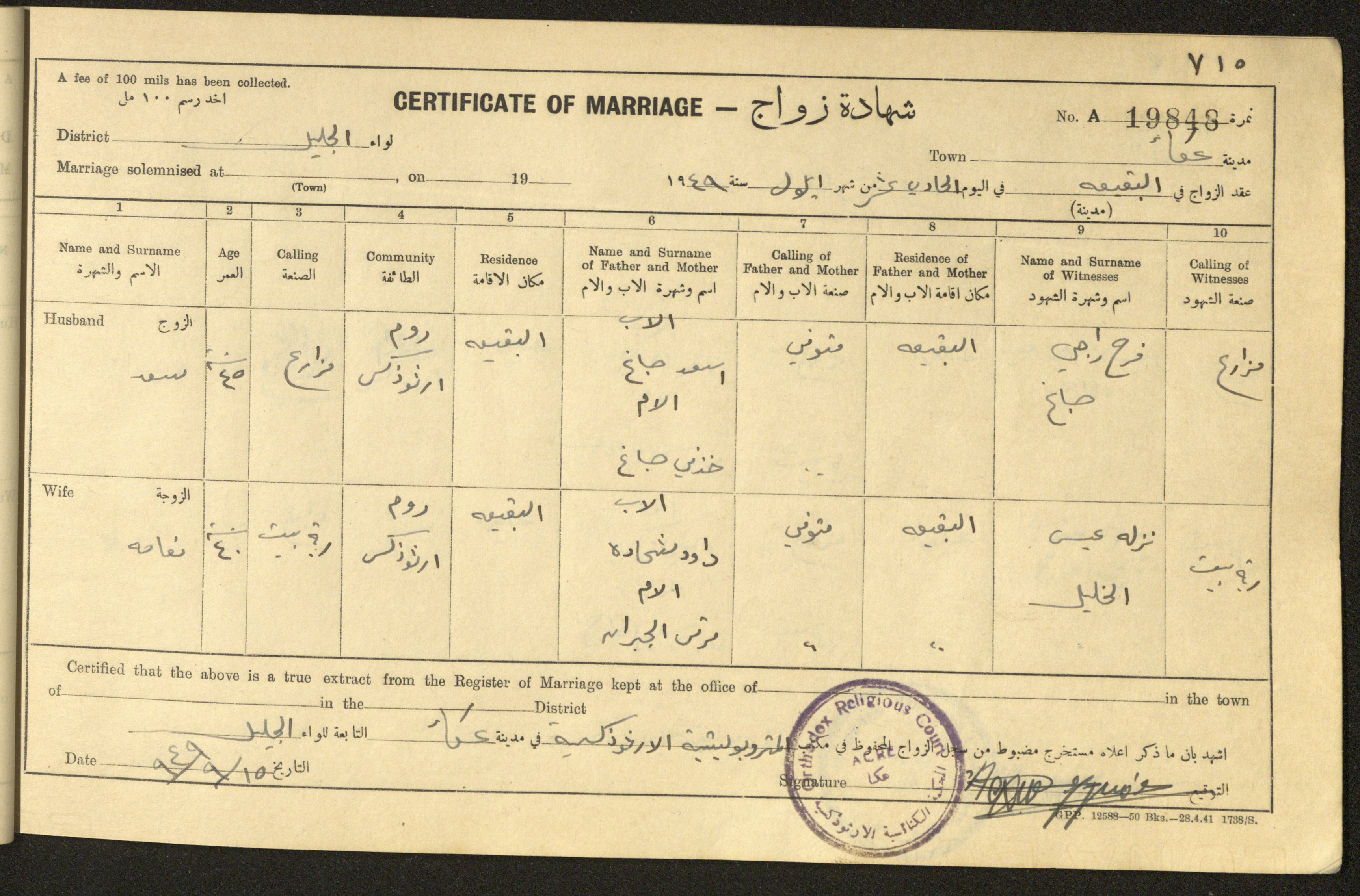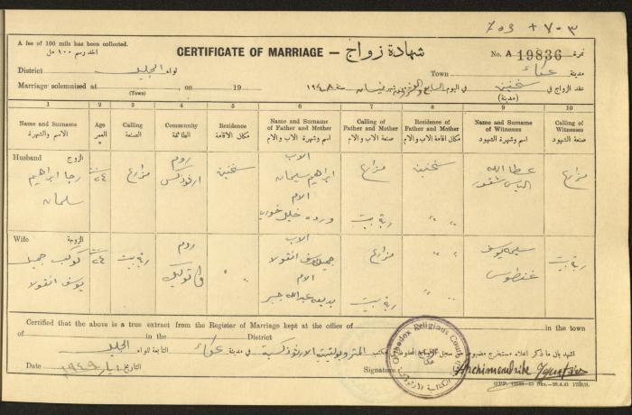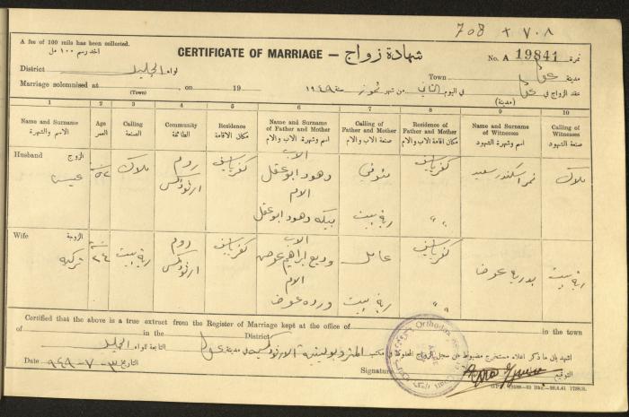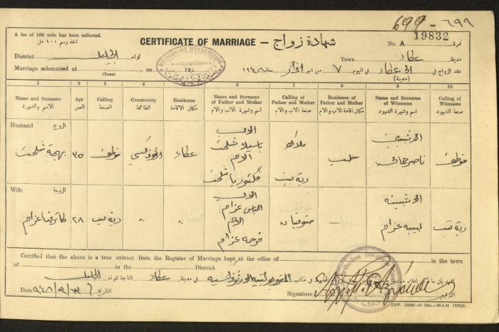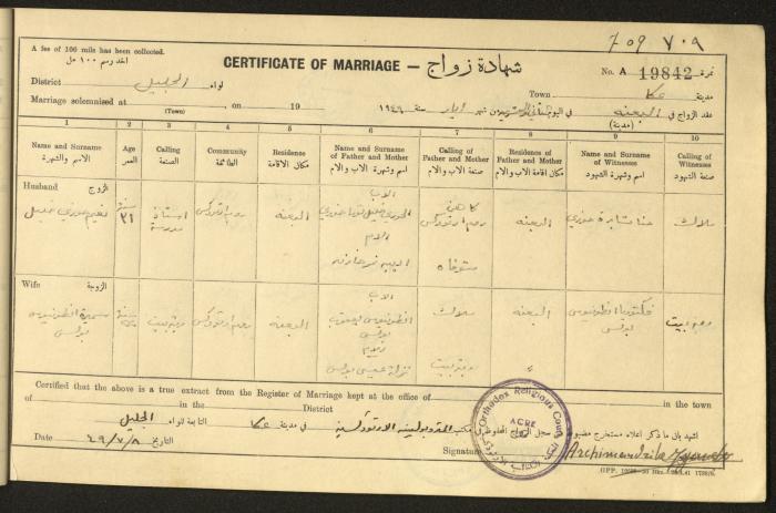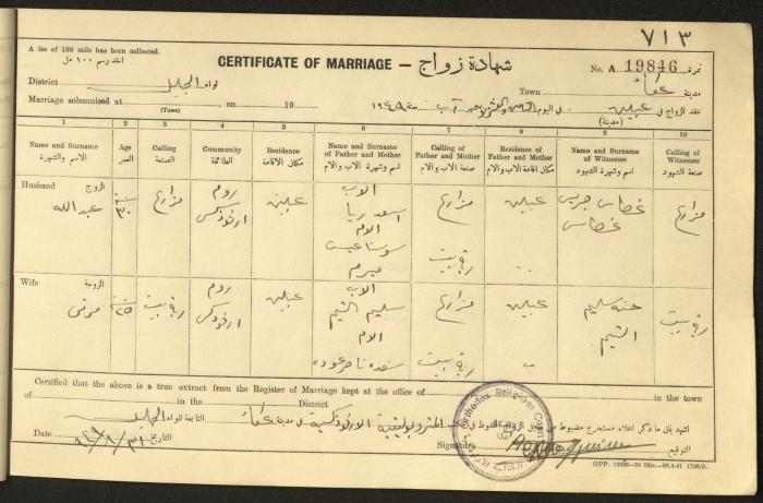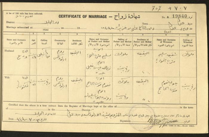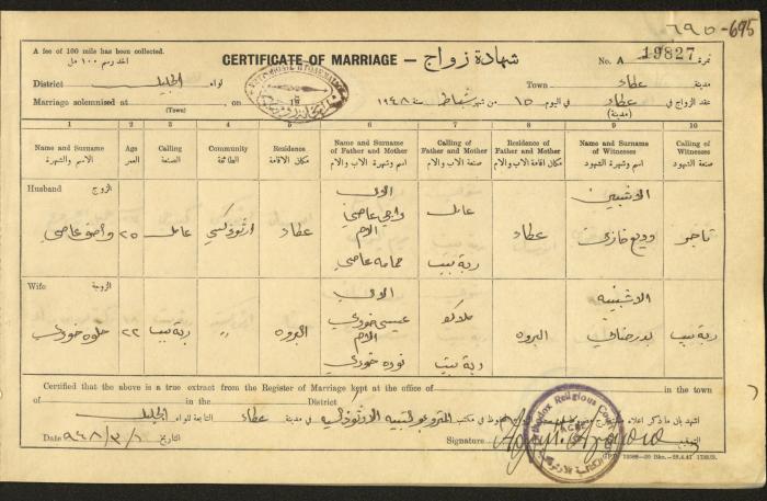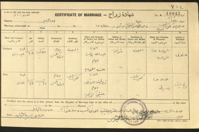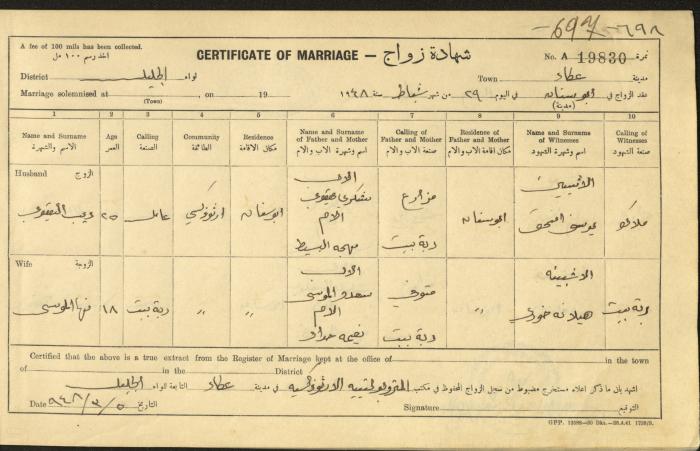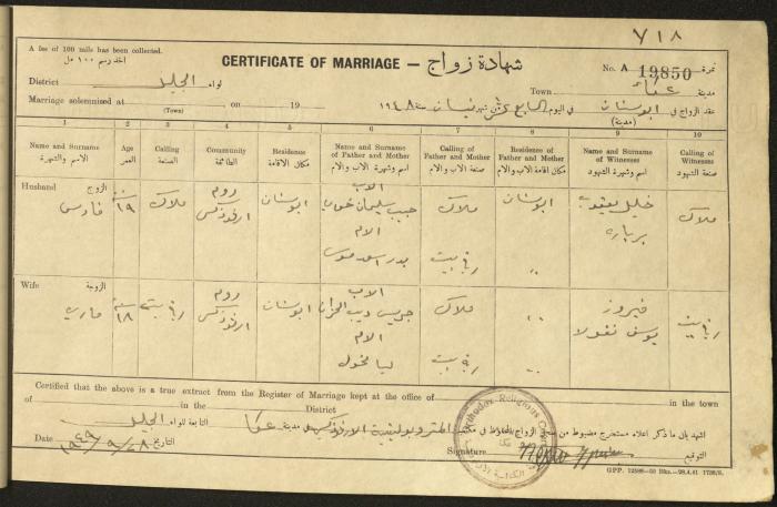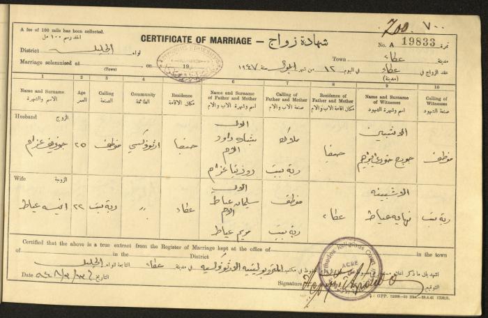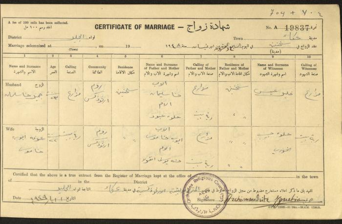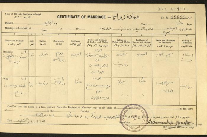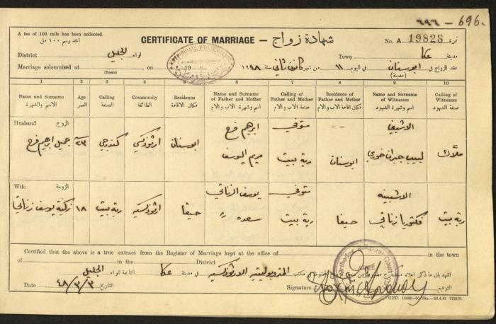 "شهادات زواج"، حيفا، 1948
