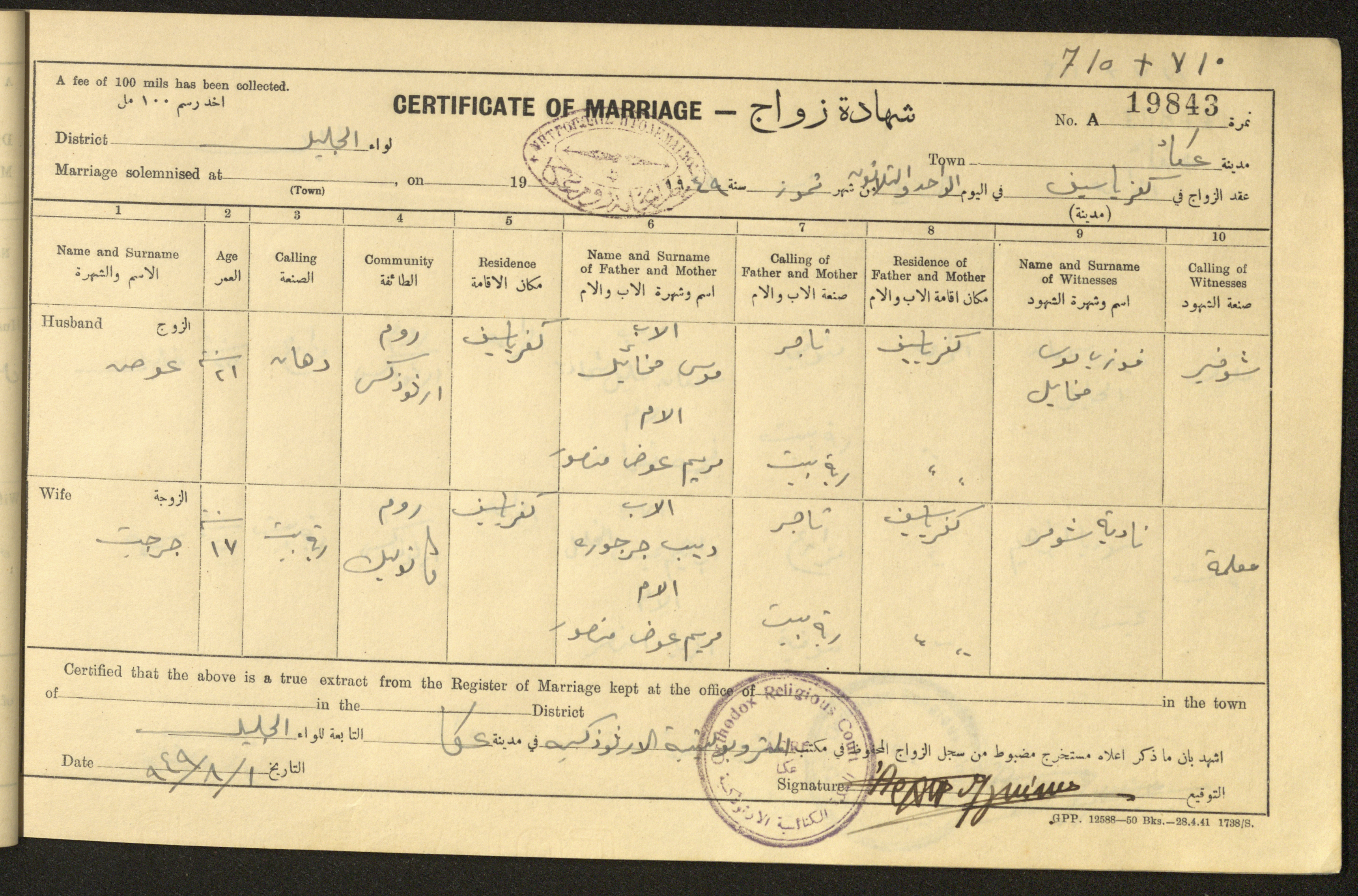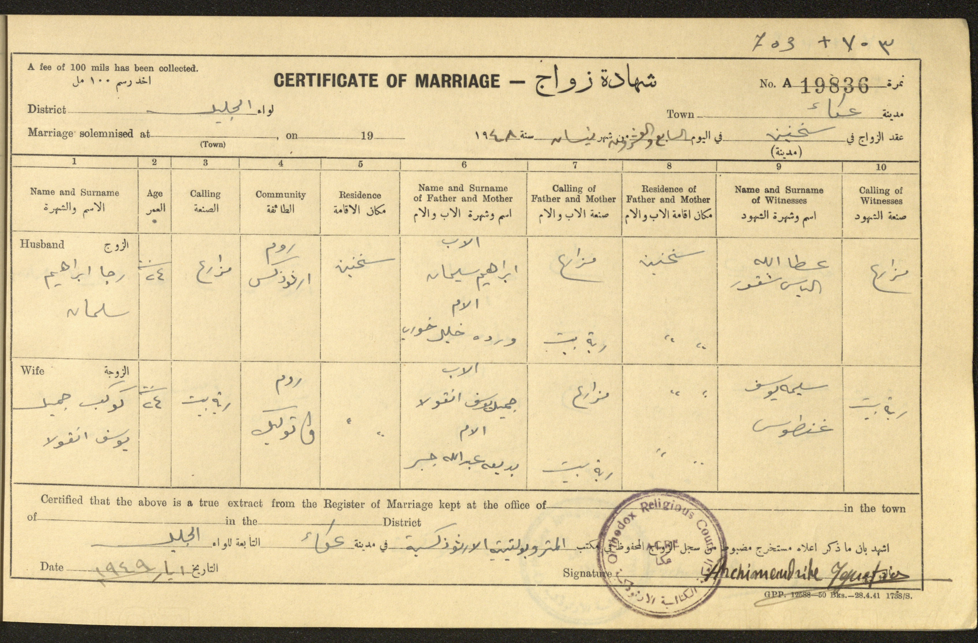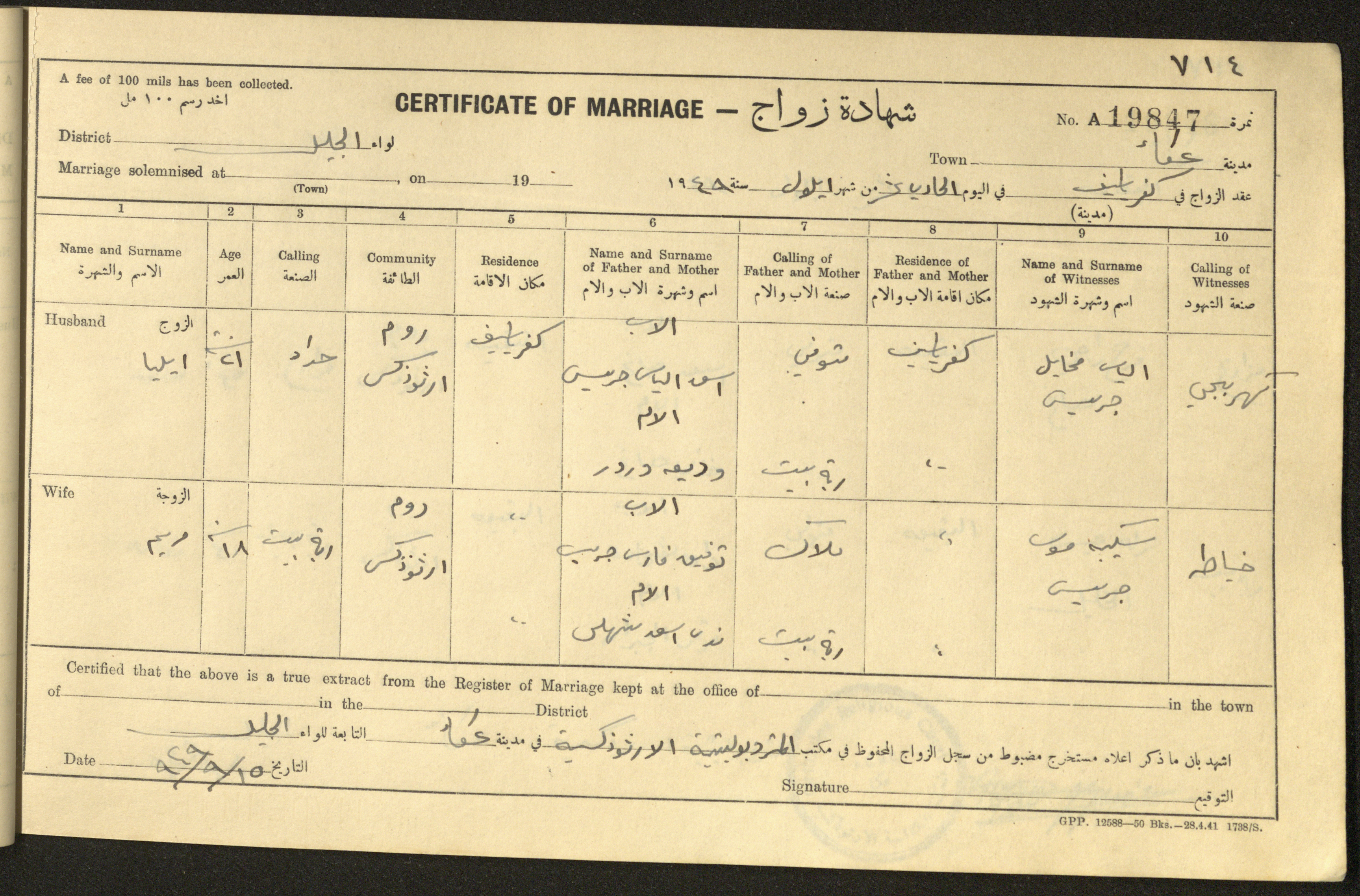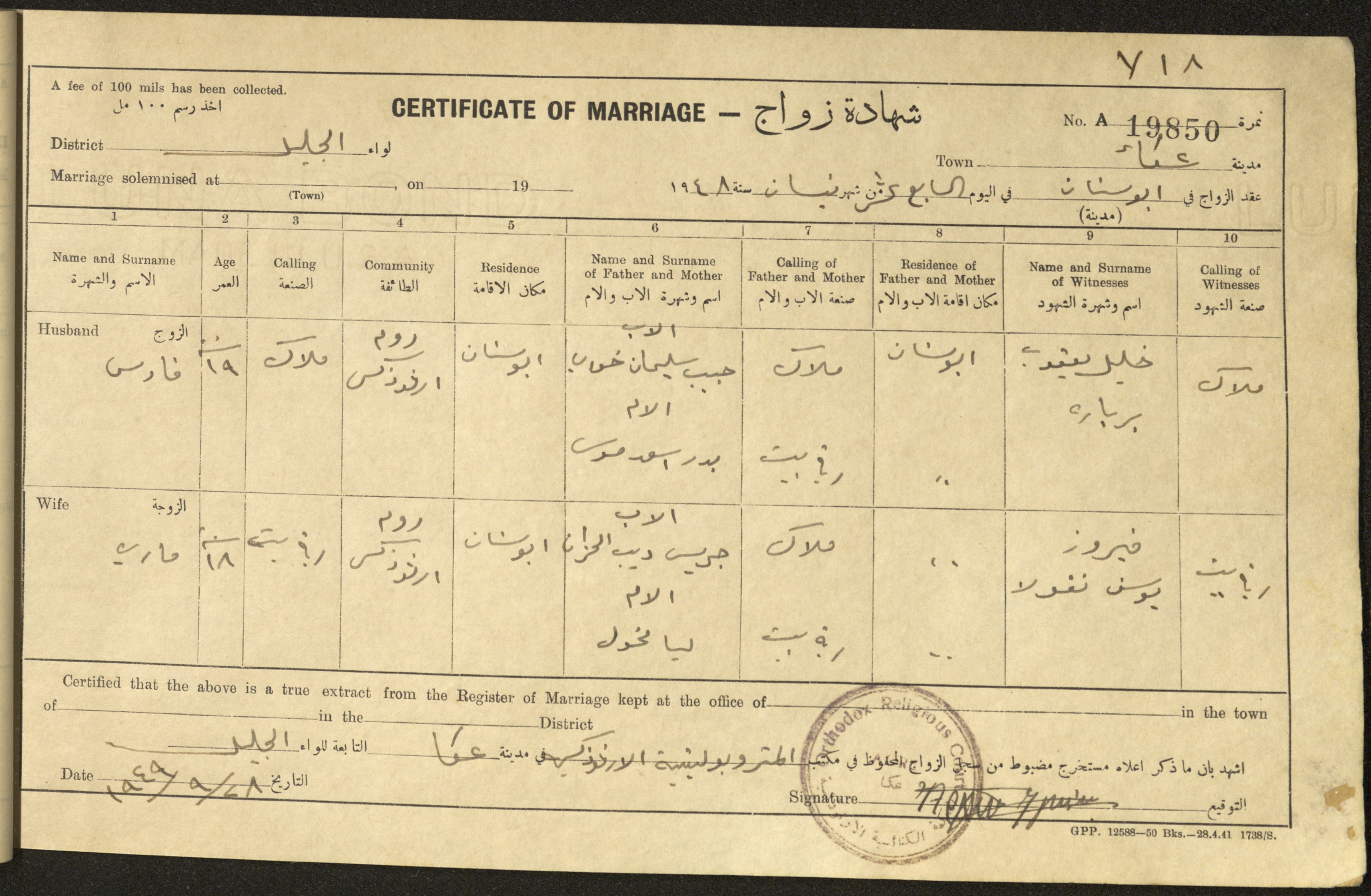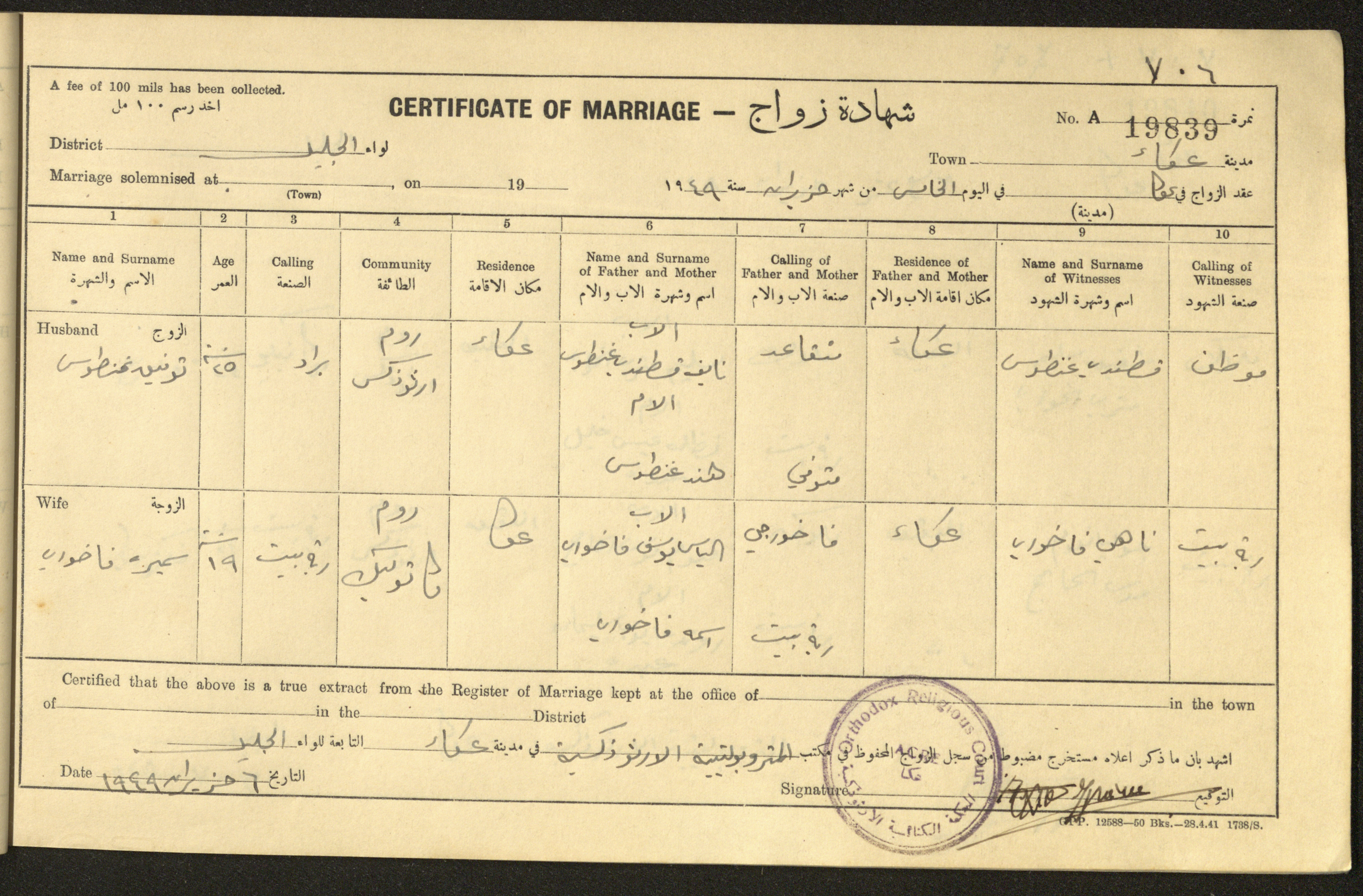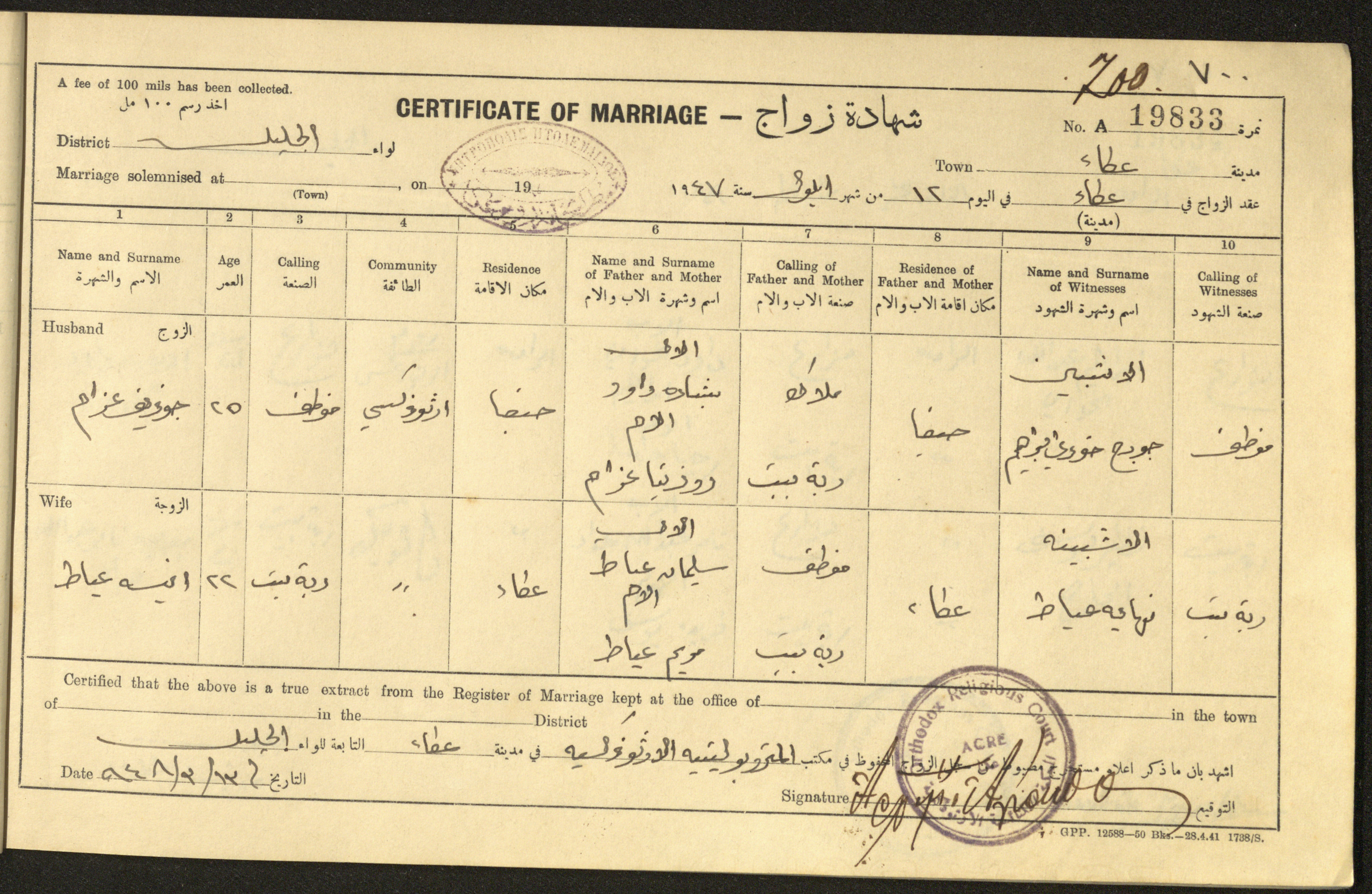 "شهادات زواج"، حيفا، 1948