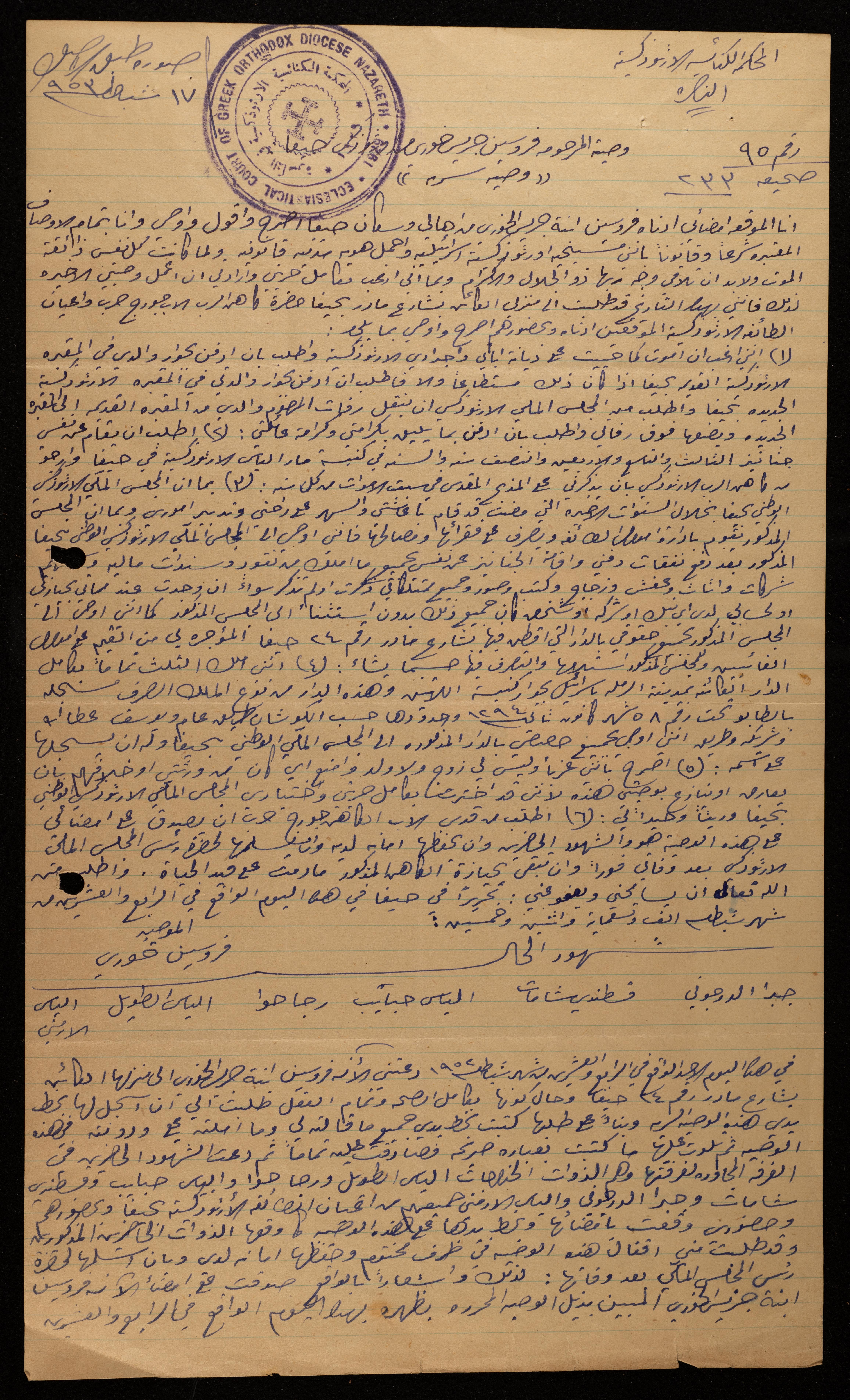 وصية فروسين جريس الخوري من حيفا، صادرة عن المحكمة الكنائسية الأرثوذكسية بتاريخ 24 شباط 1952، توصي فيها بأن تدفن بجانب والدتها في المقبرة الأرثوذكسية في حيفا، وتوصي للمجلس الملي الأرثوذكسي الوطني في حيفا بجميع ممتلكاتها وأموالها.