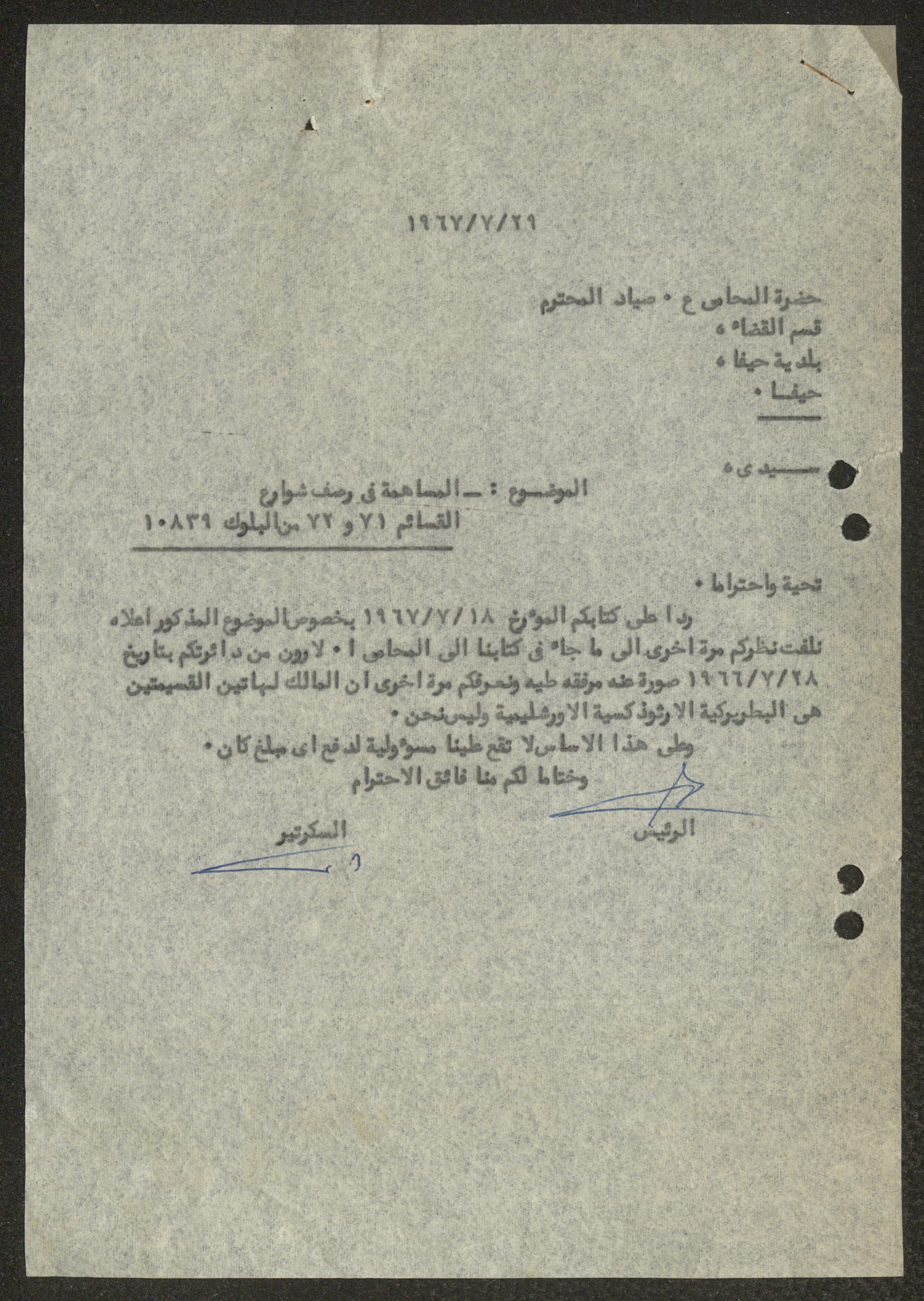 Issued on 29 July 1967, this document shows a letter that was addressed from the National Orthodox Communal Council to Haifa Municipality regarding making a contribution to the paving of the roads.