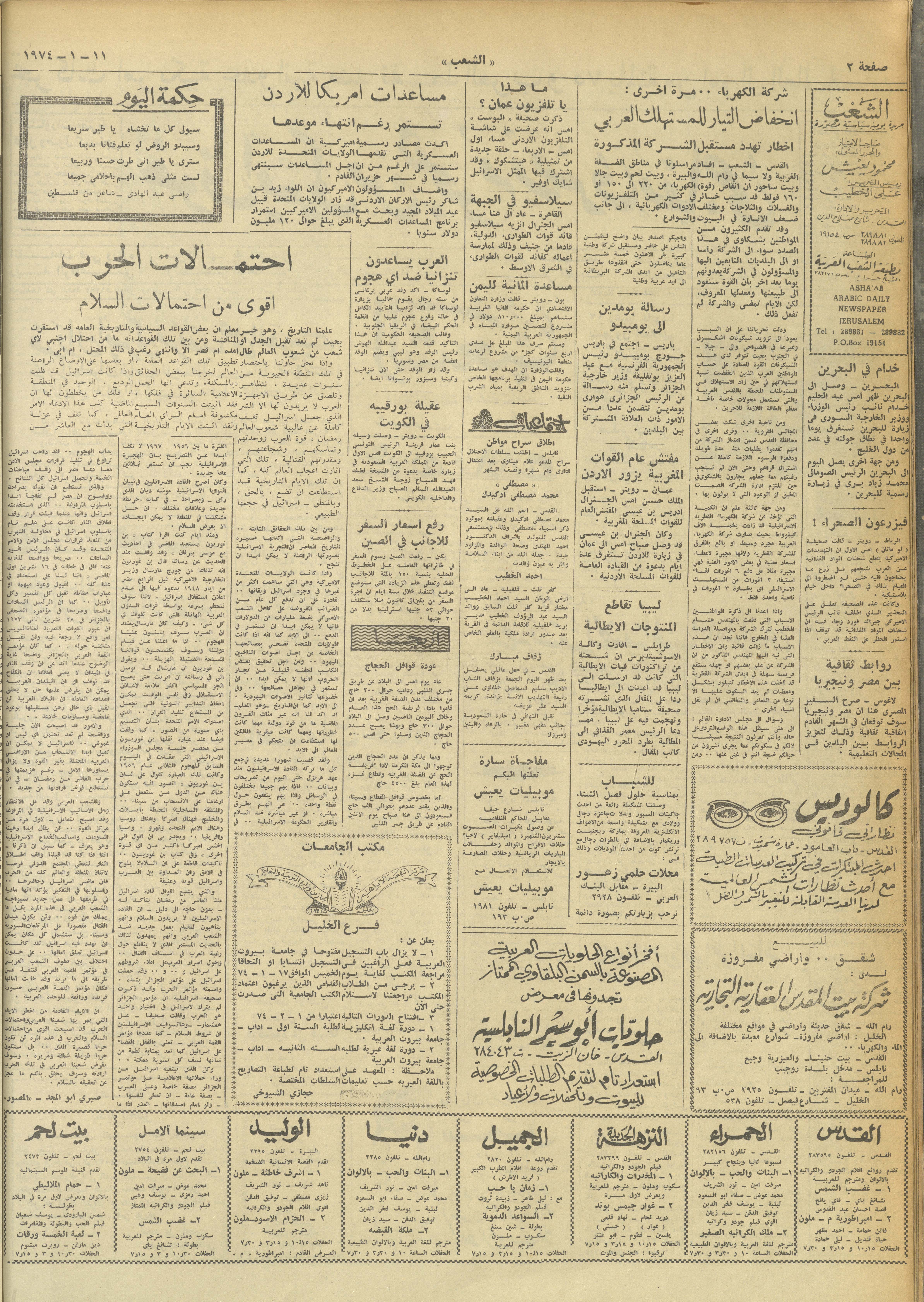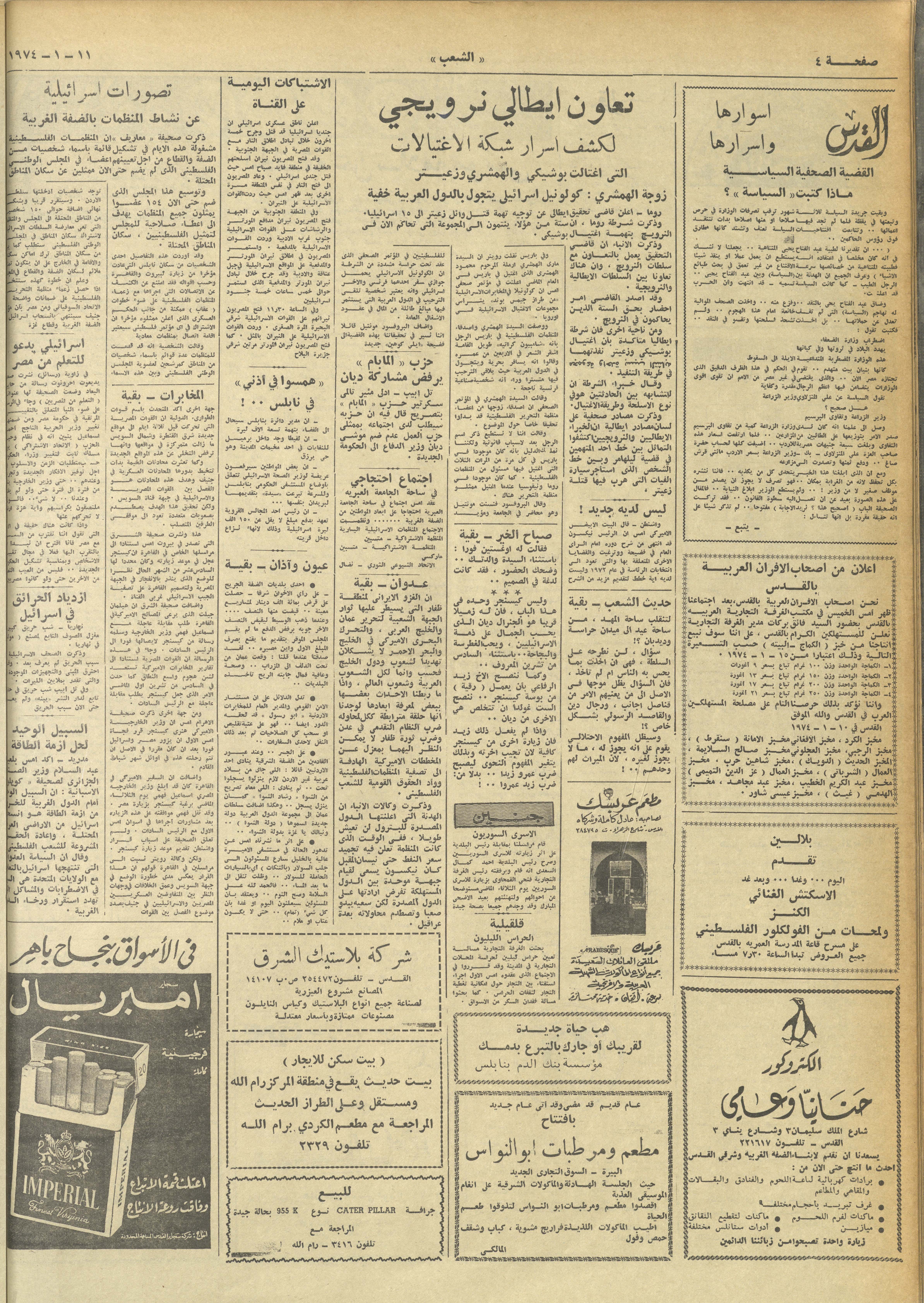 Printed in Arabic, this includes issue number 433 of Asha'b Newspaper issued on 11 January 1974, which is a 4-paged daily, political and illustrated newspaper. The issue cost 40 agoras and included a collection of statements, announcements, advertisements and political and sports news including: - Quoting the Lebanese newspaper al-Yawm, US special forces are conducting manoeuvres to train to occupy Arab oil wells. - The Israeli occupation authorities warn Nablus against demonstrating against settler colonialism. - Increased tension prevails in the Sinai region due to the advance of the Egyptian forces to new positions. - "The New Saturn", an article by Abu Ghassan. - “The possibilities of war are stronger than the possibilities of peace,” an article by Sabri Abul-Magd. - "The conscience is not dead", an article by Muhammad Youssef al-Khatib. - Quoting from the Israeli newspaper Maariv, Israeli perceptions of the activities of Palestinian organizations in the occupied West Bank. - Italian-Norwegian cooperation to reveal the secrets of the network of assassinations against the Palestinians in Europe.