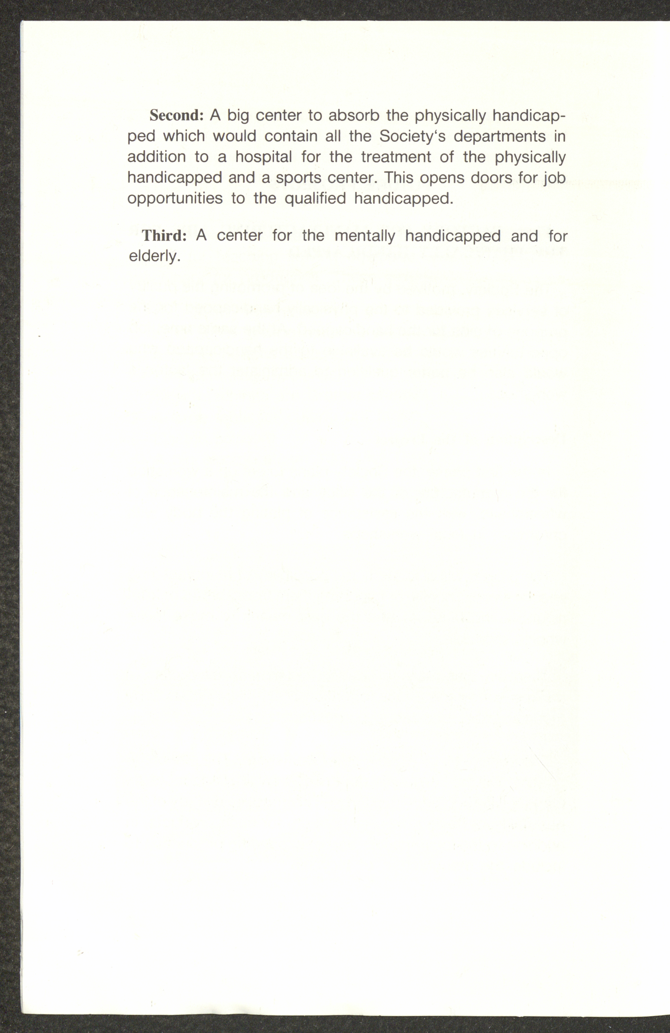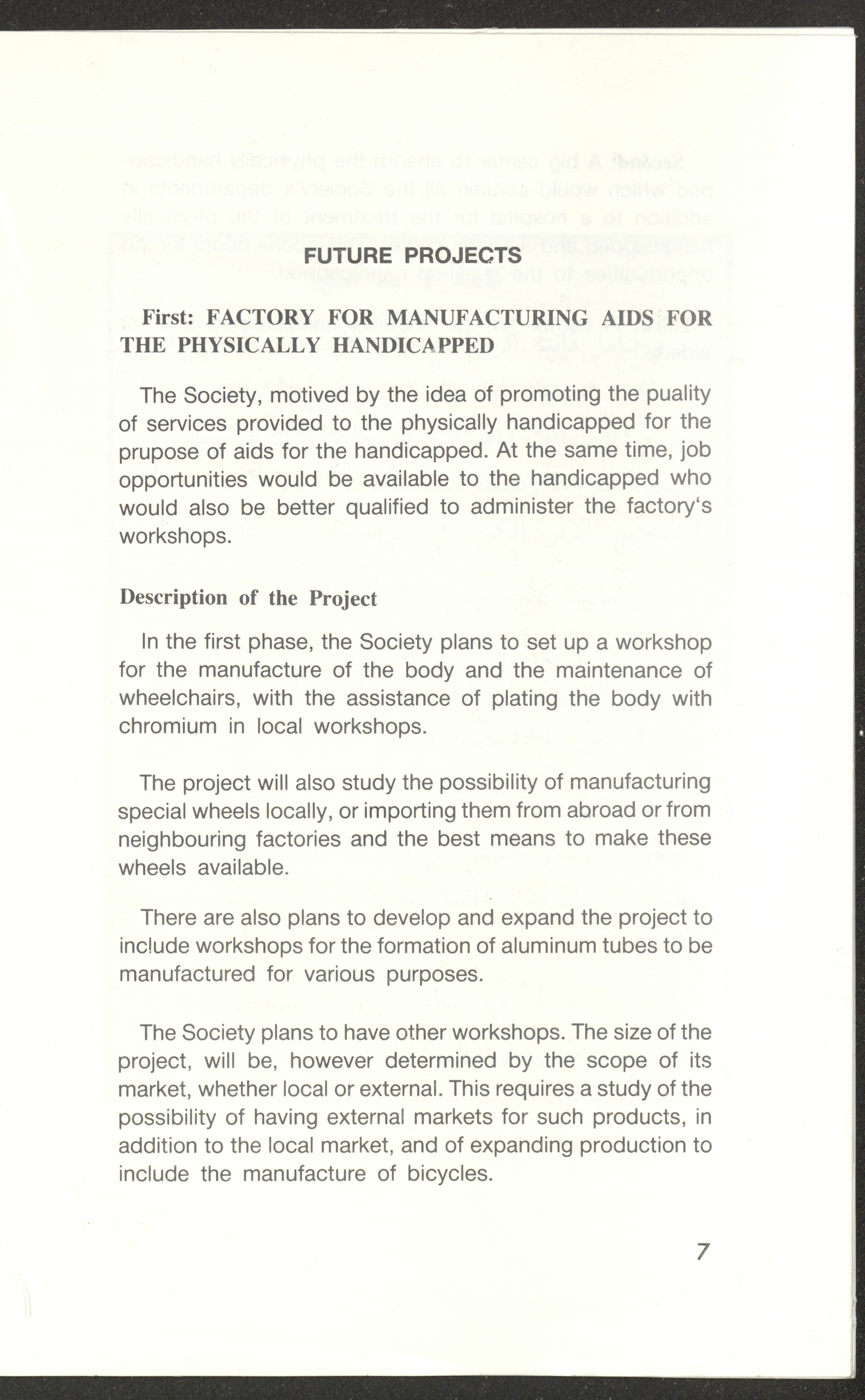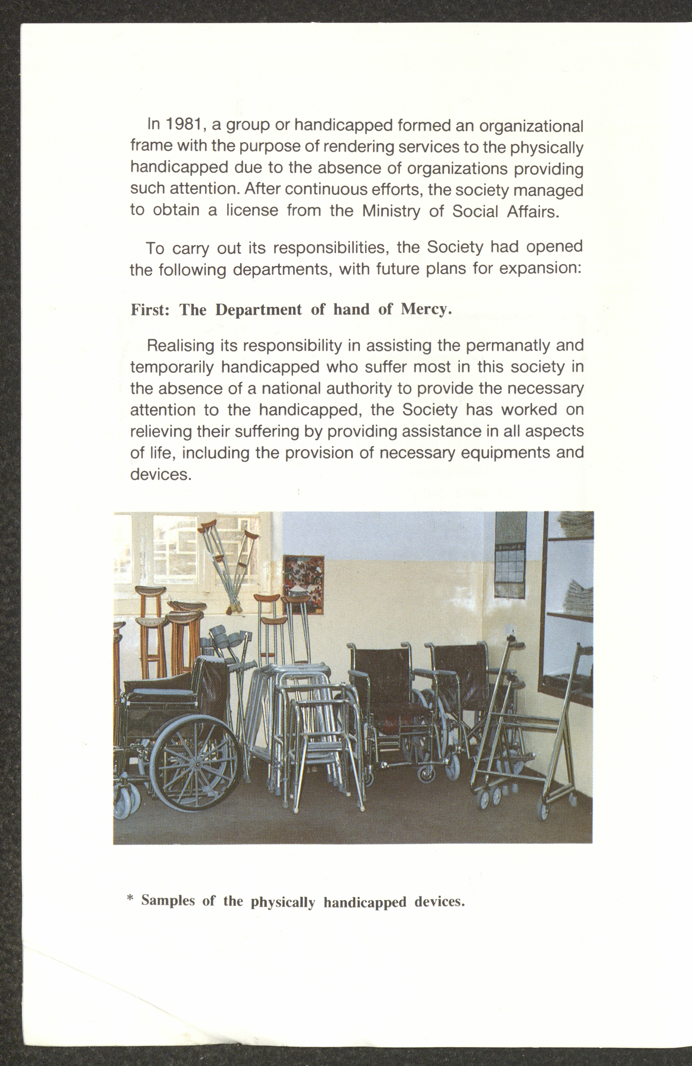 تتضمن هذه الوثيقة المطبوعة باللغتين العربية والإنجليزية الدليل الخاص بالجمعية العربية للمعاقين حركياً والتي تأسست عام 1981 في القدس بمبادرة من الشباب المعاقين حركياً من الذين آمنوا بقدرة الإنسان الفلسطيني المعاق على العطاء لمجتمعه وشعبه وذاته وحصلت على شهادة تسجيل من وزارة التنمية الاجتماعية في الأردن عام 1982 وذلك لخدمة المعاقين حركياً في الأراضي المحتلة وباتت عضواً في اتحاد الجمعيات الخيرية في الضفة الغربية. وأولى صفحات هذا الدليل كانت مخصصة لكلمة افتتاحية كتبها رئيس الجمعية الحاج حسن فطين طهبوب الذي أكد فيها على أن الجمعية تأسست لرعاية فئة صالحة من أبناء هذا الوطن والأخذ بيده وإذ تعتبر تجربة رائدة في مجال الخدمة العامة لتثبت بالعمل الدائب المتصل أن المعوق جزء صالح من المجتمع وتليها قائمة أعضاء الجمعية ومنهم الحاجة نزهة أنور نسيبة بصفتها نائبةً للرئيس والمهندس مصطفى توفيق أبو زهرة بصفته أميناً للسر والحاج كمال عبدالقادر محمود بصفته أميناً للصندوق وعضوية آخرين ومن ثم يستعرض الدليل أهداف الجمعية ومنها العمل على تأهيل المعاق جسدياً وثقافياً ومهنياً ومحاولة إيجاد العمل لهم ويتضح ذلك من خلال مجموعة من الصور الملونة التي تبين بعضًا من منتجات الجمعية والأنشطة الثقافية والاجتماعية التي يقوم بها الأعضاء بغية قضاء وقت الفراغ مع بعضهم البعض، ويلي ذلك نبذة عن دوائر الجمعية ومنها دائرتي الرحمة والتأهيل، بينما الصفحات الأخيرة من الدليل ترصد ذات المحتوى ولكن باللغة الإنجليزية.