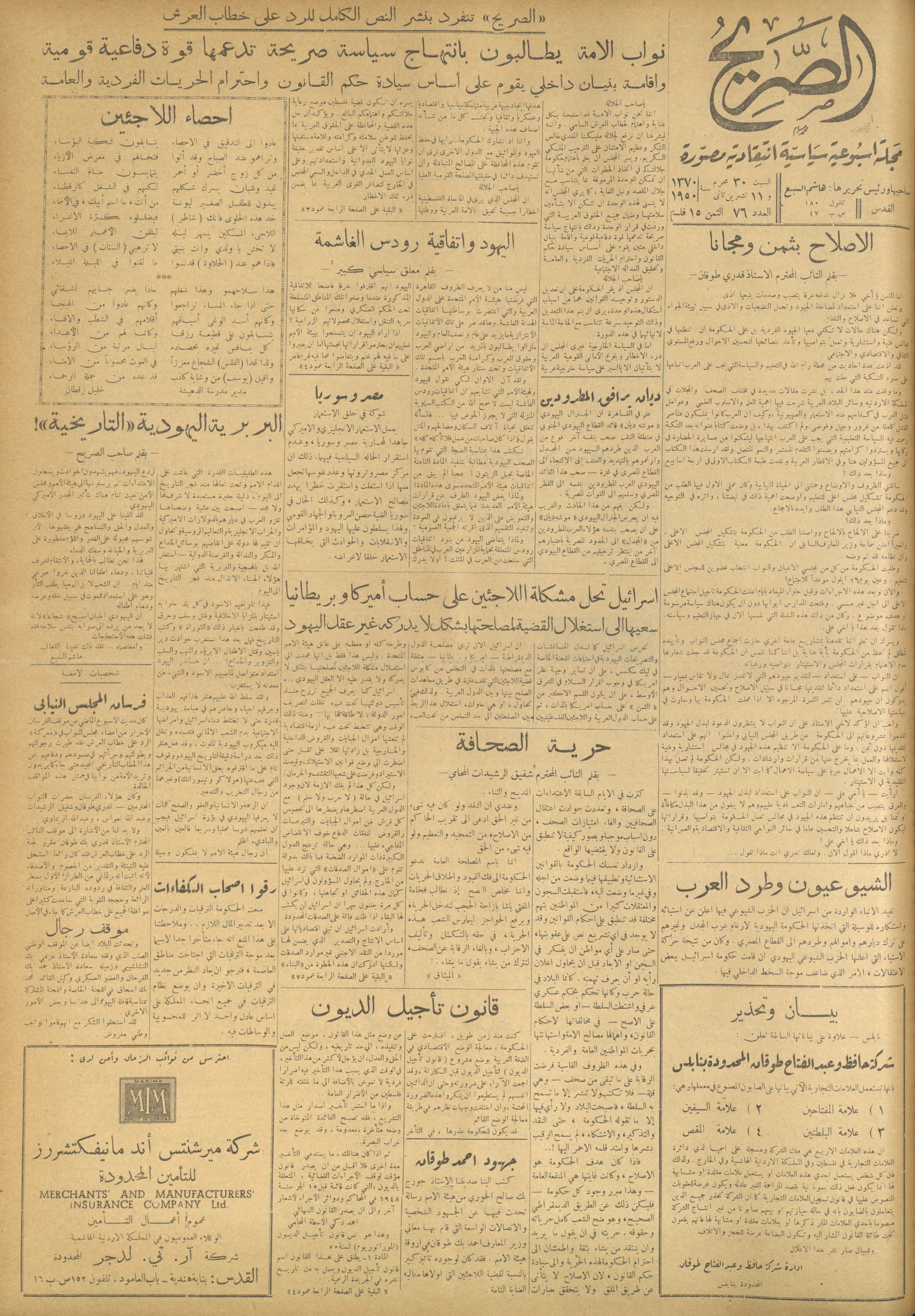 وثيقة مطبوعة باللغة العربية تتضمن العدد 76 من مجلة الصريح، وهي مجلة أسبوعية سياسية نقدية لصاحبها ورئيس تحريرها هاشم السبع. صدر العدد في 11 تشرين الثاني 1950، وثمنه 15 ملّا، واحتوى على العديد من المقالات النقدية التي تتناول الأحداث السياسية في تلك الفترة، من أبرزها: - الإسرائيليين واتفاقية رودس. - مشكلة اللاجئين الفلسطينيين وحلّها من قبل دولة "إسرائيل" على حساب أمريكا وبريطانيا. - استياء الحزب الشيوعي الإسرائيلي من طرد فلسطينيي المجدل. - قانون تأجيل الديون في الضفة الغربية.
