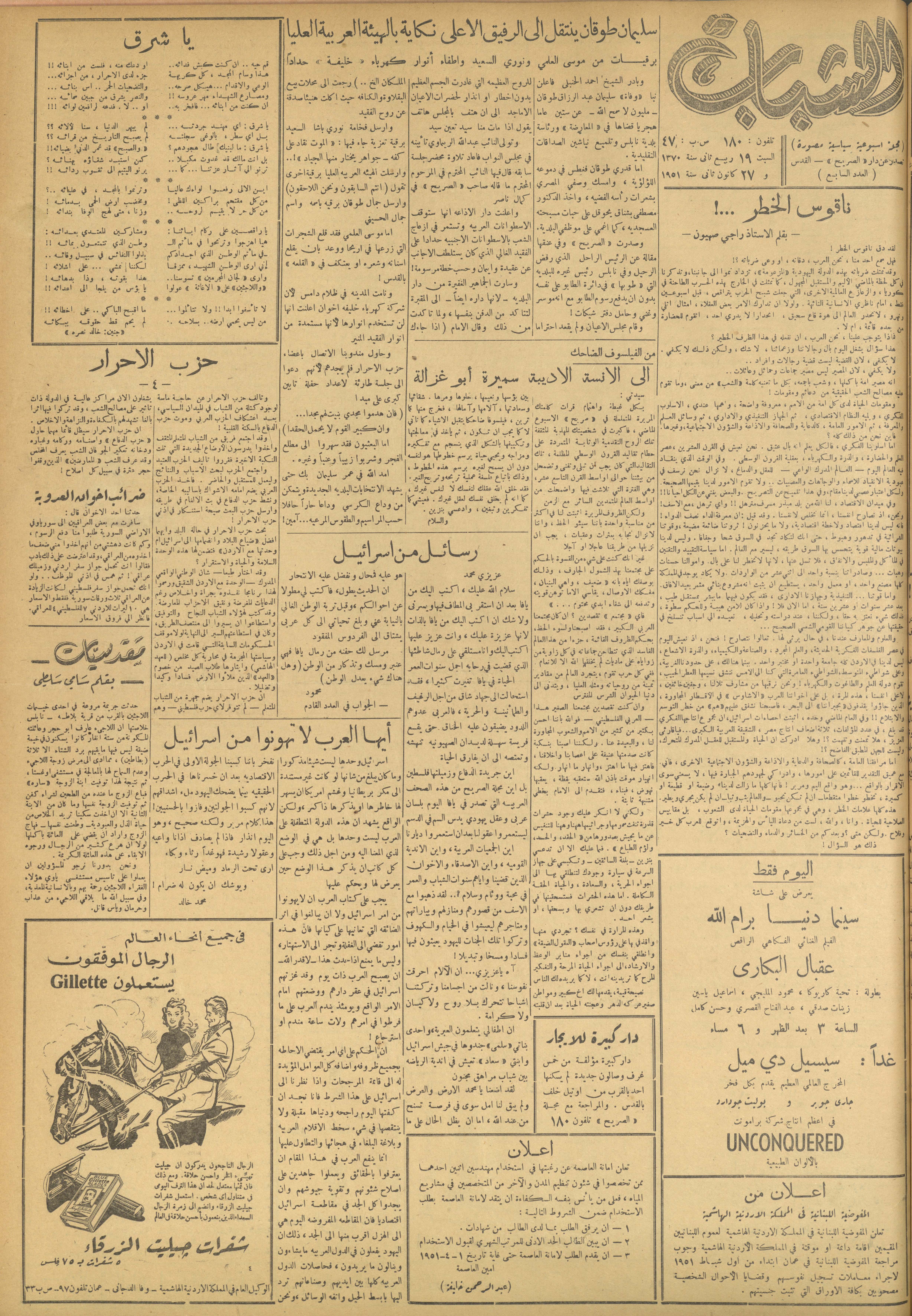 مجلة الصريح، العدد 87، 27 كانون الثاني 1951
