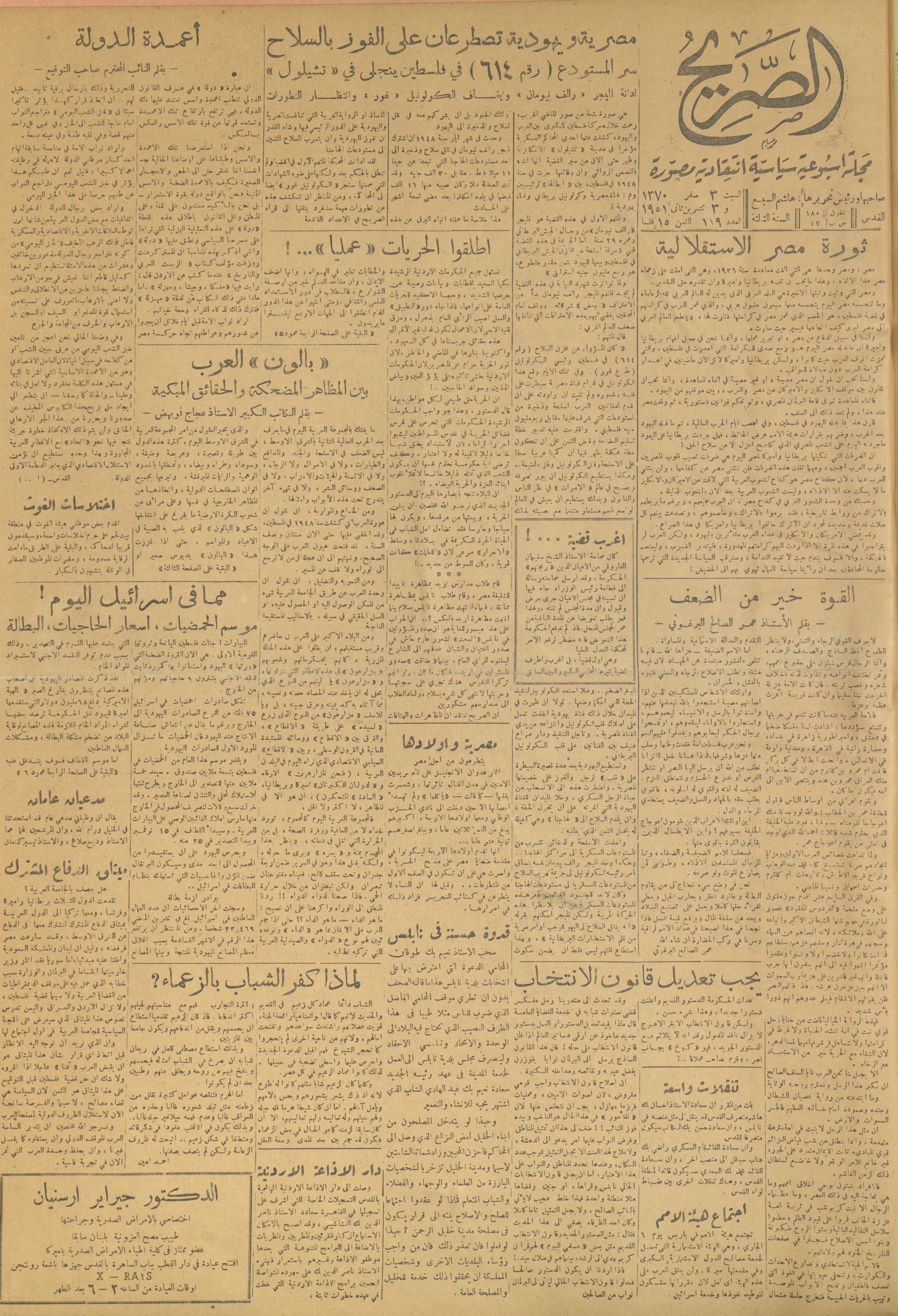 وثيقة مطبوعة باللغة العربية تتضمن العدد 119 من مجلة الصريح، وهي مجلة أسبوعية سياسية نقدية لصاحبها ورئيس تحريرها هاشم السبع. صدر العدد في 3 تشرين الثاني 1951، وثمنه 15 ملّا، واحتوى على العديد من المقالات النقدية التي تتناول الأحداث السياسية في تلك الفترة، من أبرزها: - "ثورة مصر الاستقلالية"، مقال حول ثورة مصر ضد معاهدة 1936 مع بريطانيا. - موسم الحمضيات واستغلال دولة الاحتلال الإسرائيلي للبيارات الفلسطينية المنهوبة لانعاش اقتصادها. - طلب الصريح تحسين العلاقات مع حكومة عموم فلسطين.