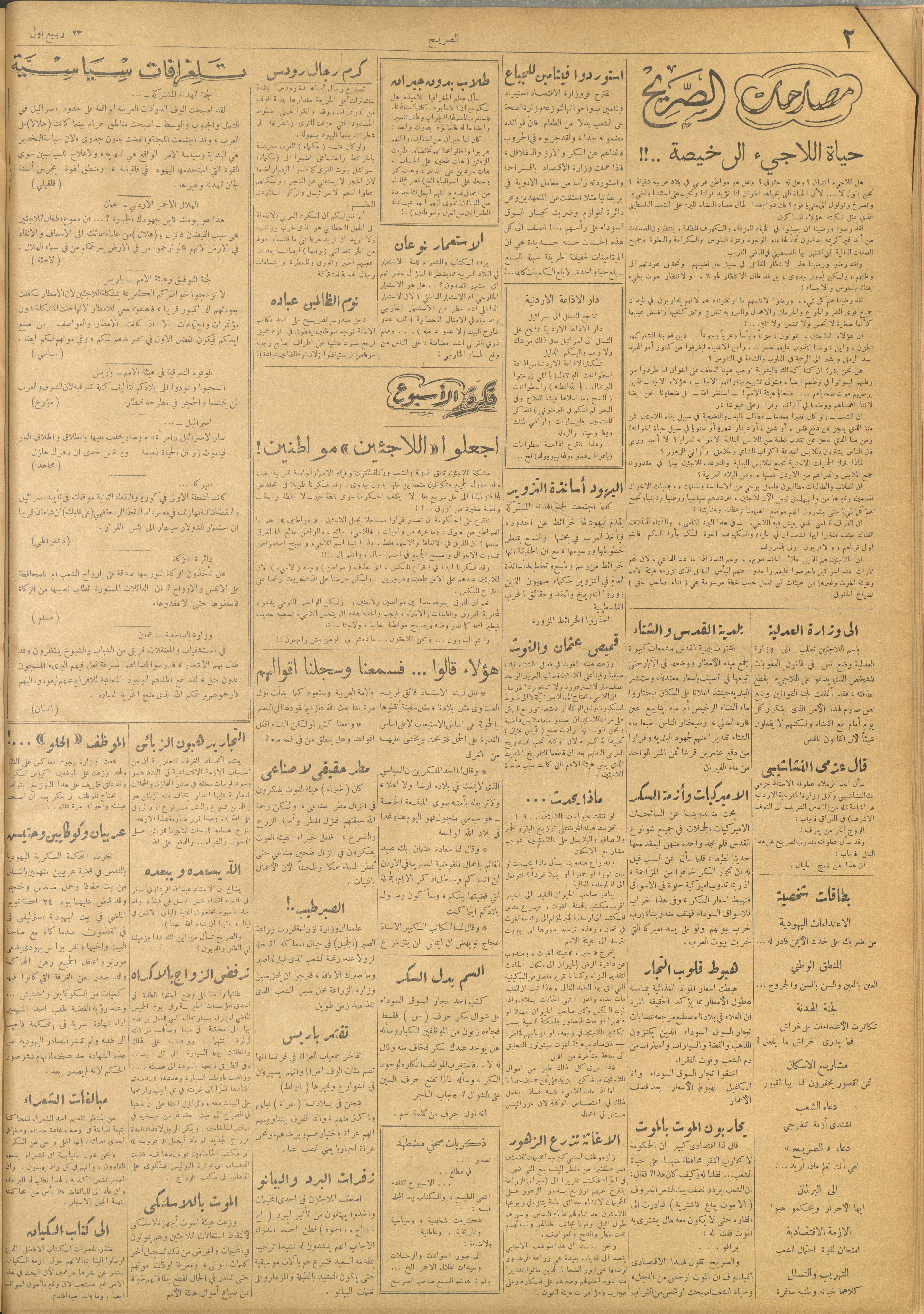 وثيقة مطبوعة باللغة العربية تتضمن العدد 126 من مجلة الصريح، وهي مجلة أسبوعية سياسية نقدية لصاحبها ورئيس تحريرها هاشم السبع. صدر العدد في 22 كانون الأول 1951، وثمنه 15 ملّا، واحتوى على العديد من المقالات النقدية التي تتناول الأحداث السياسية في تلك الفترة، من أبرزها: - تخطيط لجان إسرائيلية لوضع مخططات مواصلات بين البحر الأبيض والأحمر والميت، وتحويل النقب لقاعدة عسكرية. - حول مقال موشيه سملانسكي، كاتب إسرائيلي يوضح خسارة الفلاحيين الفلسطيين بنزوحهم حيث كان يمكن لدولة الاحتلال الإستفادة منهم. - اليهود الهنود في دولة الاحتلال الإسرائيلي يشكون التفرقة الطبقية بحقهم. - "حياة اللاجئ رخيصة"، مقال حول صعوبة ظروف اللاجئ الفلسطيني في البلدان العربية.