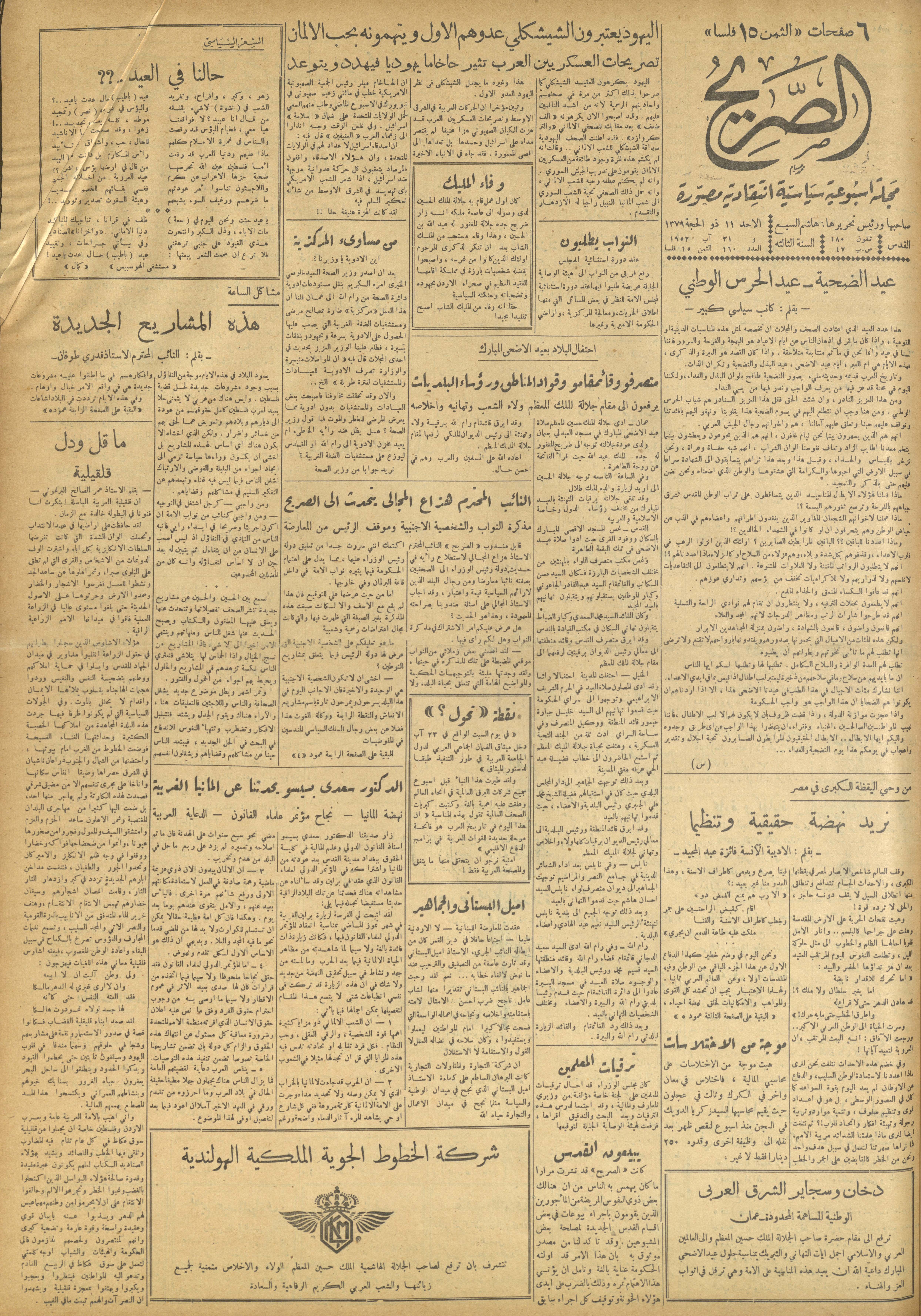 مجلة الصريح، العدد 160، 31 آب 1952