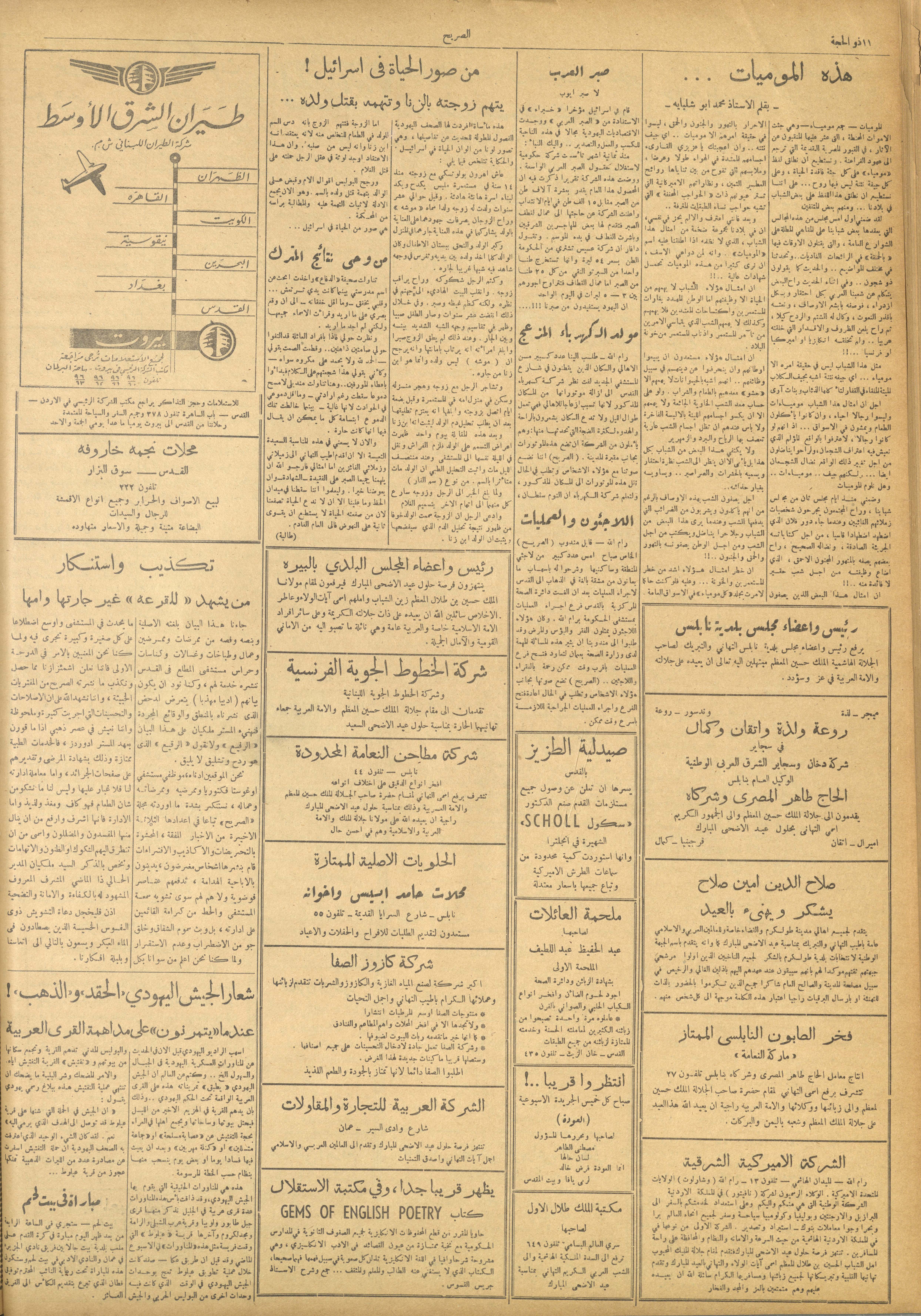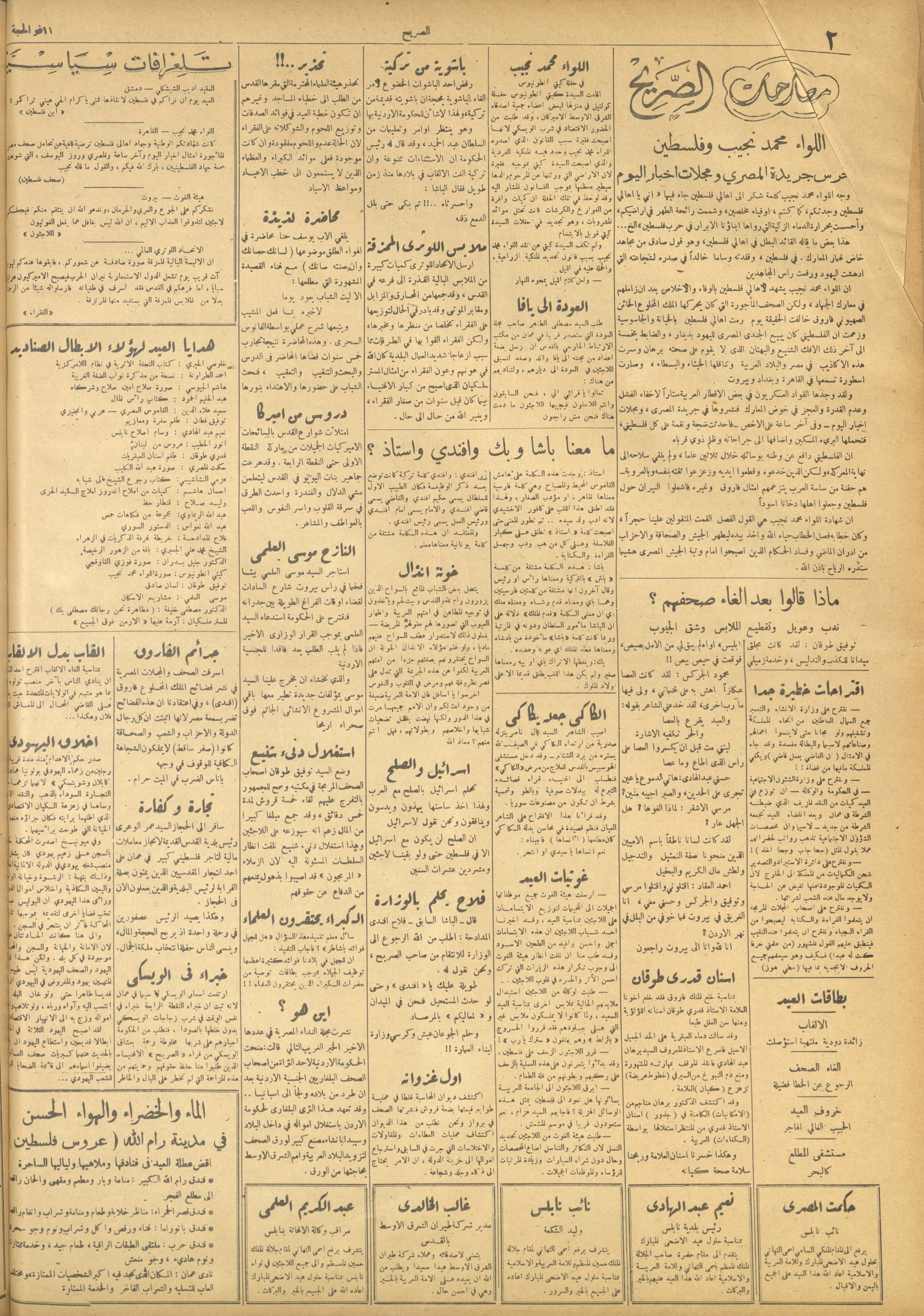 وثيقة مطبوعة باللغة العربية تتضمن العدد 160 من مجلة الصريح، وهي مجلة أسبوعية سياسية نقدية لصاحبها ورئيس تحريرها هاشم السبع. صدر العدد في 31 آب 1952، وثمنه 15 ملّا، واحتوى على العديد من المقالات النقدية التي تتناول الأحداث السياسية في تلك الفترة، من أبرزها: - خطاب الشيشلي يثير غضب الإسرائيليين ويعتبرونه حليف للألمان. - دخول ميثاق الضمان الجماعي العربي للدول العربية طور التنفيذ في 23 آب 1952. - "يبيعون القدس"، حول وجود بعض البيعات المشبوهة لأقسام القدس الجديدة. - إعلان وكالة الغوث عن مراكز توزيع المؤن لشهر أيلول 1952.