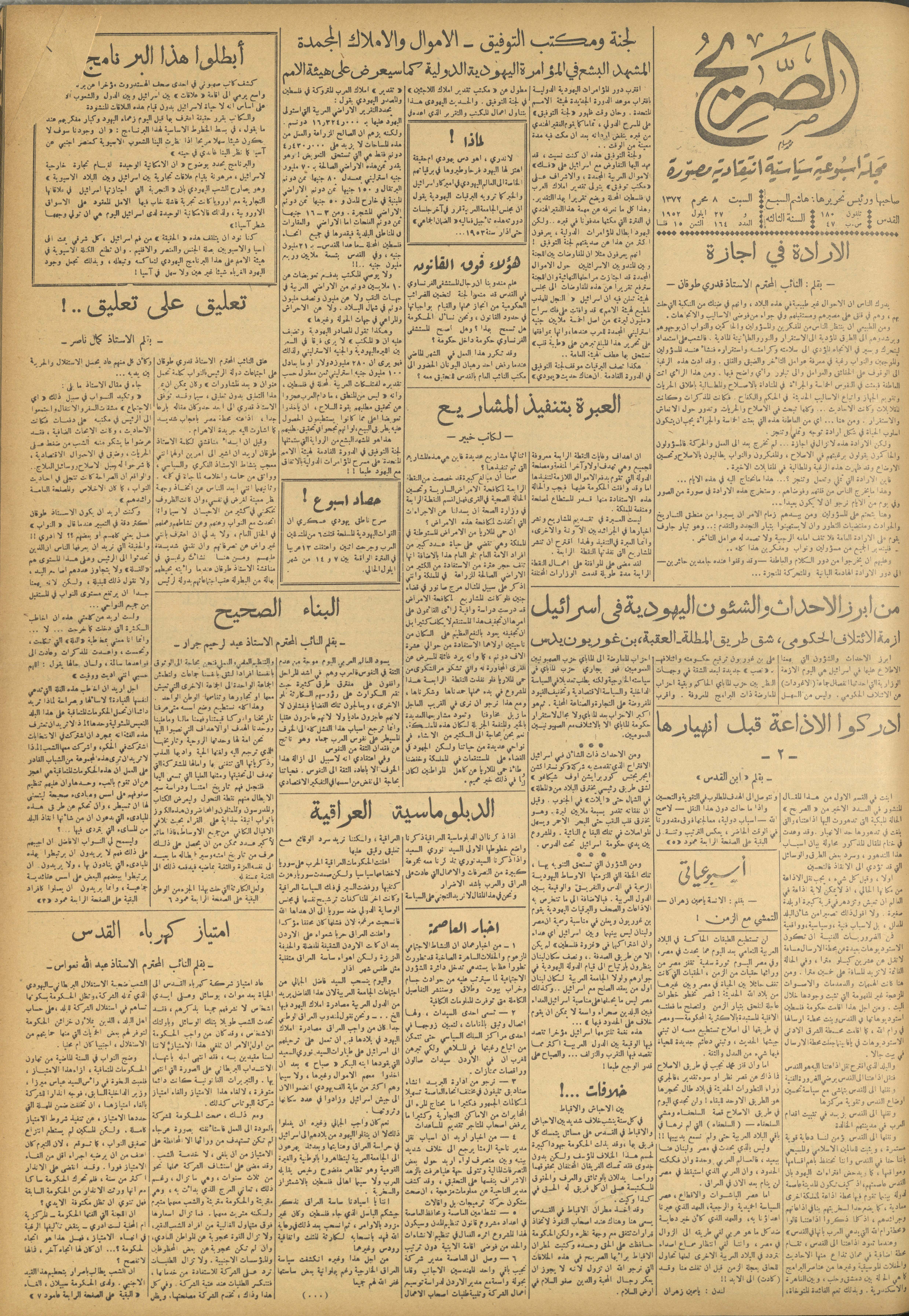 وثيقة مطبوعة باللغة العربية تتضمن العدد 164 من مجلة الصريح، وهي مجلة أسبوعية سياسية نقدية لصاحبها ورئيس تحريرها هاشم السبع. صدر العدد في 27 أيلول 1952، وثمنه 15 ملّا، واحتوى على العديد من المقالات النقدية التي تتناول الأحداث السياسية في تلك الفترة، من أبرزها: - اقتراب انعقاد الدورة الجديدة لهيئة الأمم وصدور تقرير لجنة التوفيق حول أموال الفلسطنيين المجمدة في مناطق الاحتلال. - حول أزمة الائتلاف الحكومية في دولة الاحتلال الإسرائيلي. - "عودة امتياز شركة القدس"، مقال لعبد الله عنواس. - تصريح ناطق إسرائيلي بقتل 6 وجرح 2 وأسر 13 من العائدين الفلسطينيين لأراضيهم المحتلة عام 1948 خلال فترة 7-14 أيلول 1952. - عبثية اتفاقية رودس مع اعتداءات الإسرائيليين المتكررة بحسب الصريح.