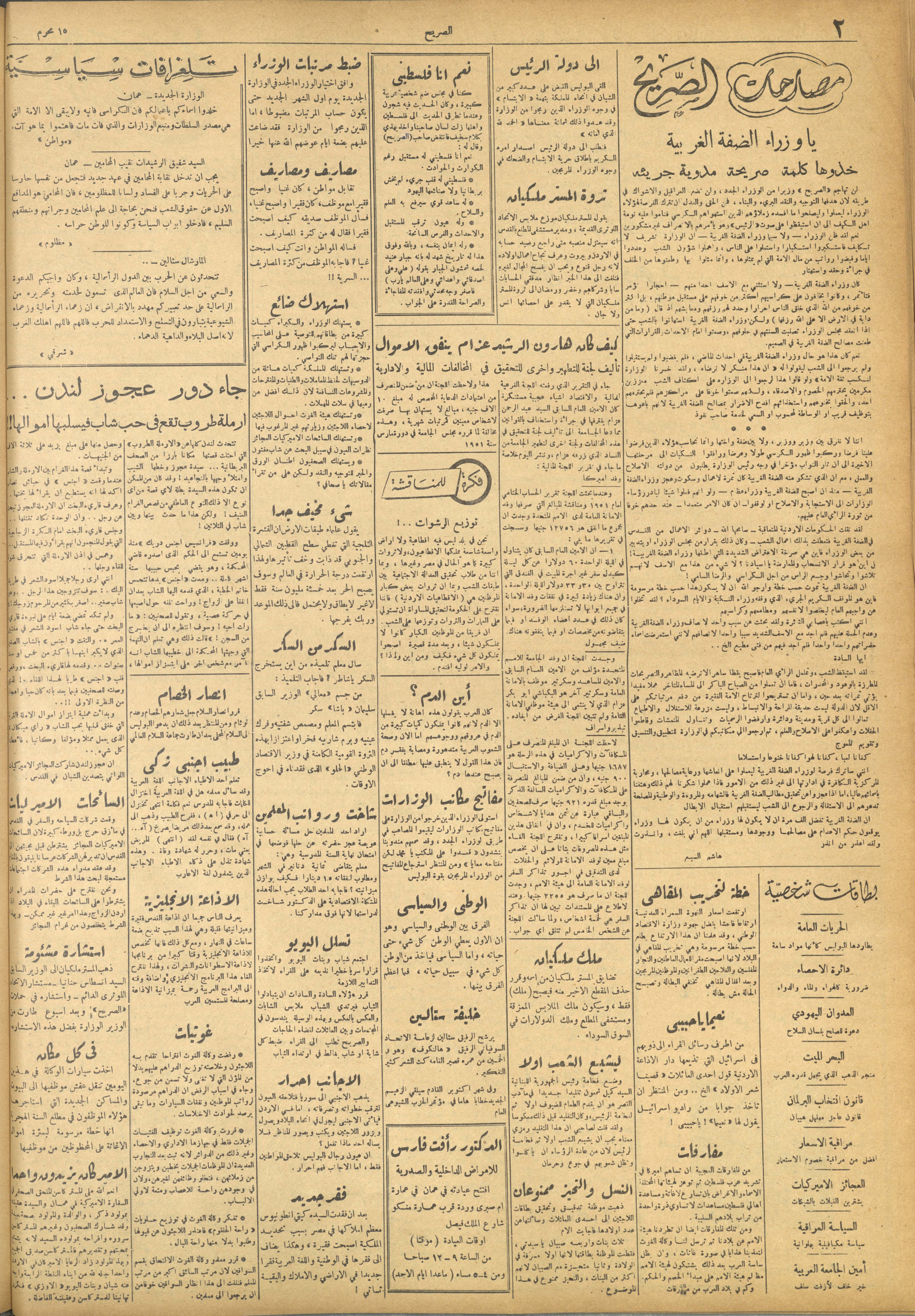 وثيقة مطبوعة باللغة العربية تتضمن العدد 164 من مجلة الصريح، وهي مجلة أسبوعية سياسية نقدية لصاحبها ورئيس تحريرها هاشم السبع. صدر العدد في 4 تشرين الأول 1952، وثمنه 15 ملّا، واحتوى على العديد من المقالات النقدية التي تتناول الأحداث السياسية في تلك الفترة، من أبرزها: - تشكيلة وزارية جديدة بسبب انتشار الفساد في تلك الفترة. - بيع الإسرائيليين أثاث الفلسطينيين وأملاكهم من حديد وخشب أسطح المنازل المستولى عليها عام 1948 قضاء يافا والجليل. - بيان من النواب بخطأ في الرقم المنشور حول المعتقلين إداريّا وسياسيّا في الأردن في جريدة فلسطين. - تشكيل لجنة تحقيق وتطهير في المخالفات المالية والإدارية في الأردن.