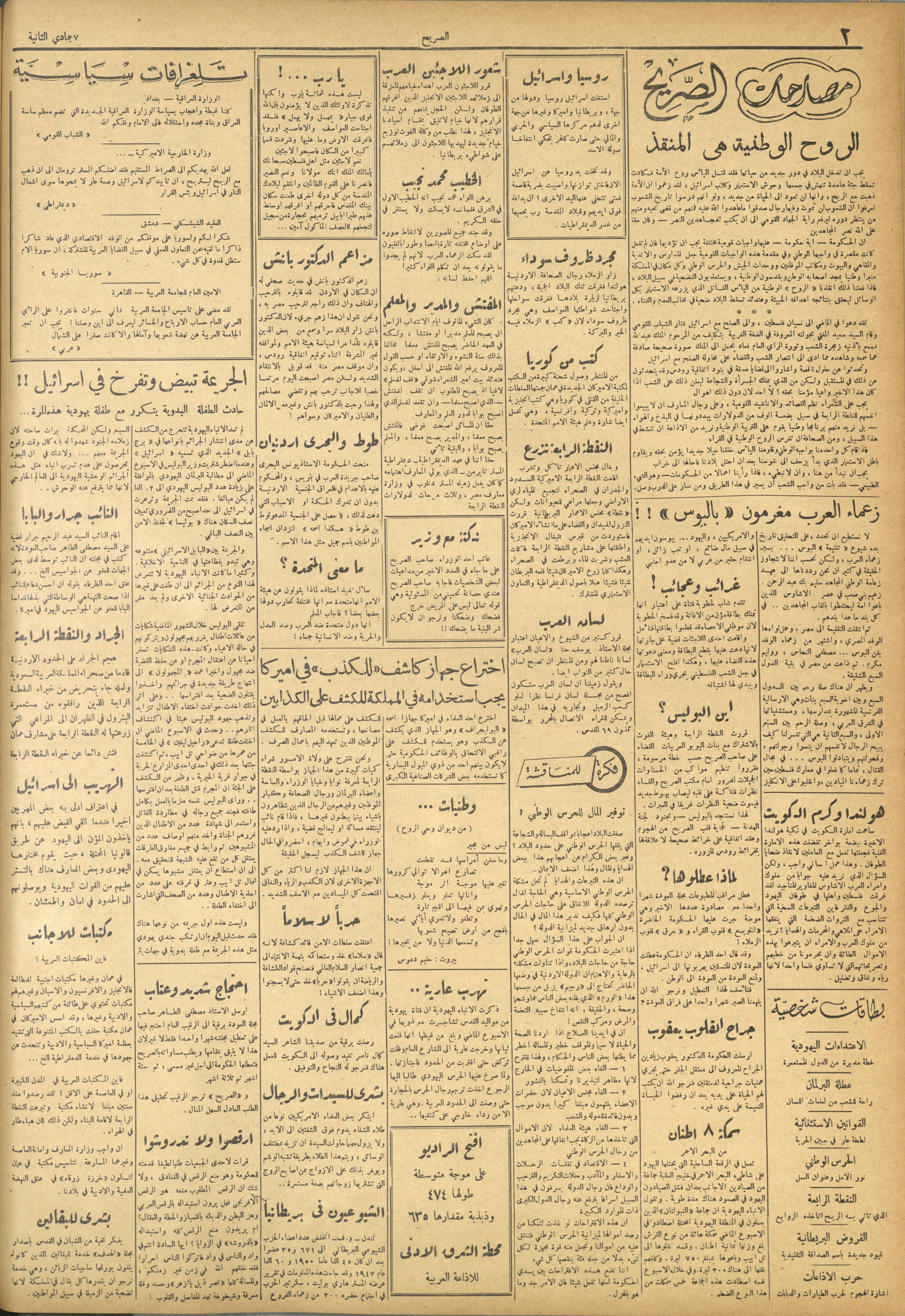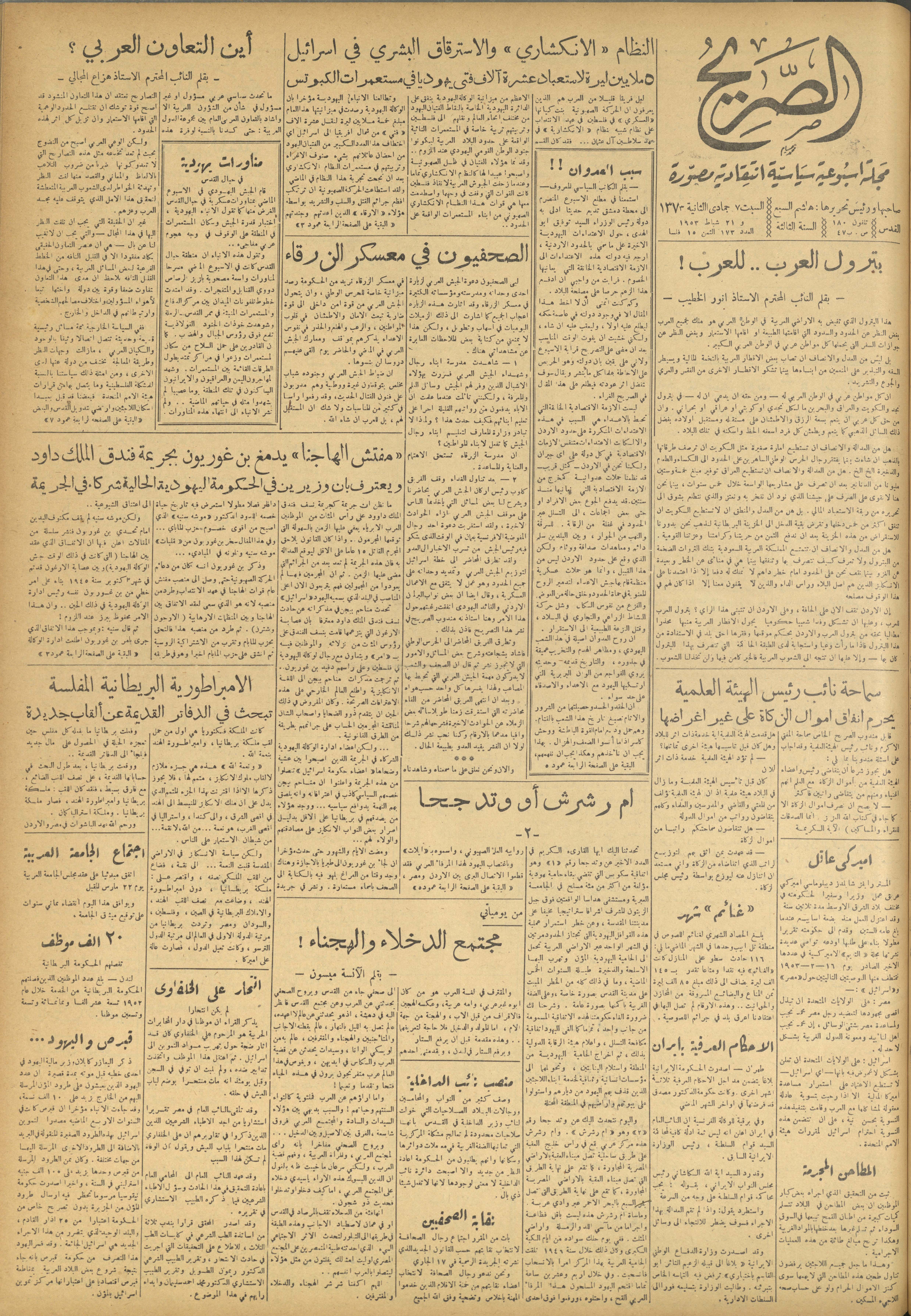 وثيقة مطبوعة باللغة العربية تتضمن العدد 173 من مجلة الصريح، وهي مجلة أسبوعية سياسية نقدية لصاحبها ورئيس تحريرها هاشم السبع. صدر العدد في 21 شباط 1953، وثمنه 15 ملّا، واحتوى على العديد من المقالات النقدية التي تتناول الأحداث السياسية في تلك الفترة، من أبرزها: - "بترول العرب للعرب"، مقال لأنور الخطيب حول ضرورة مساعدة الدول الغنية للدول الفقيرة في الوطن العربي. - رصد "إسرائيل" 5 ملايين ليرة لنقل 10 آلاف شاب من شمال إفريقيا إلى معسكراتهم. - مفتش الهاجنا يتهم بن غوريون بجريمة فندق الملك داود. - اتفاقية سكوبس، والتي تفي بوجود أكثر من 100 مسلح إسرائيلي في الجامعة العبرية ومستشفى هداسا فوق جبل الزيتون المطل على مدينة القدس. - التعدي على منطقة أم رشرش "مستوطنة إيلات" ورفع علم إسرائيل عليها. - حول دعم يهود قبرص لدولة الاحتلال الإسرائيلي من خلال طرود المؤن على مدى 4 سنوات.