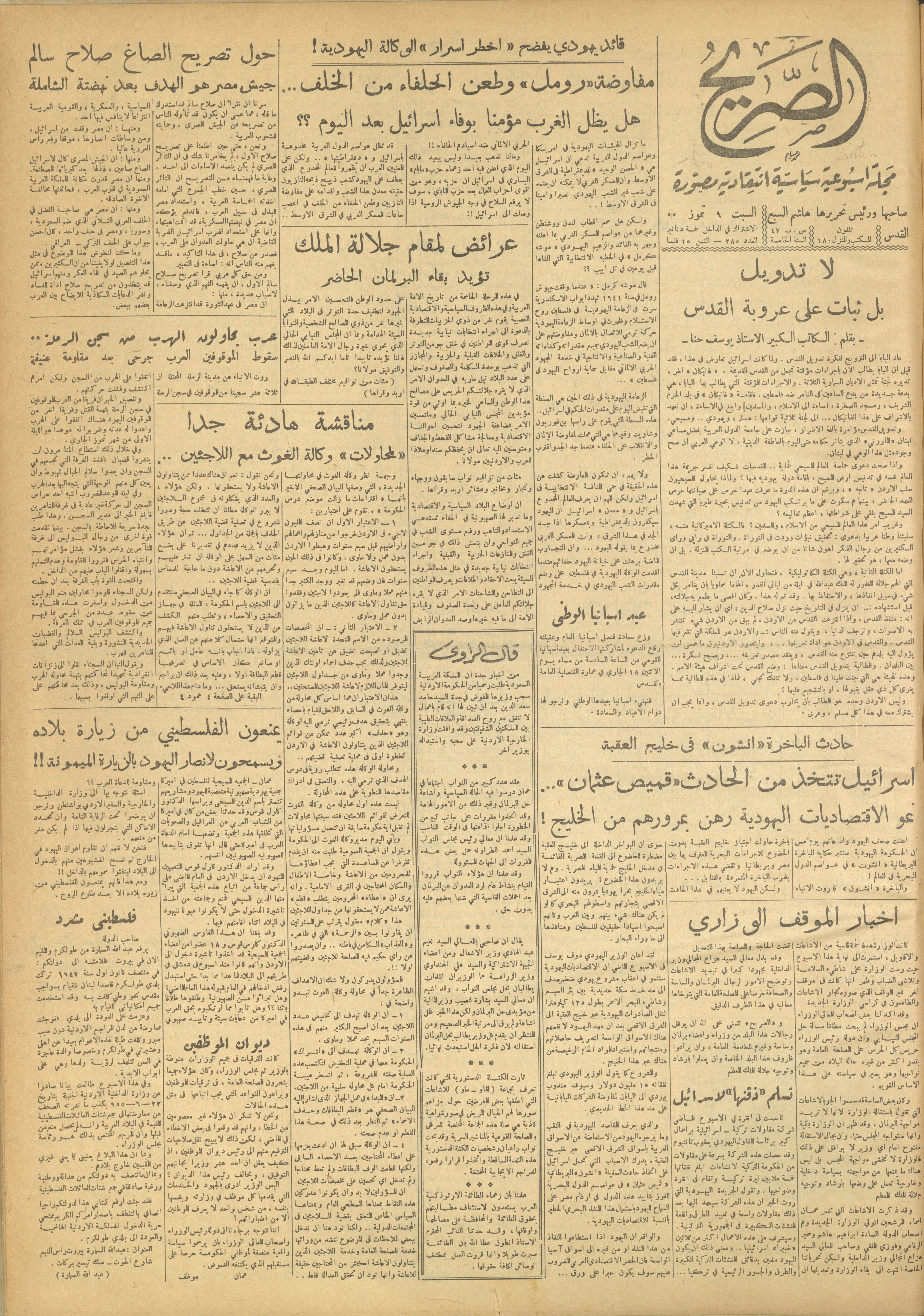 وثيقة مطبوعة باللغة العربية تتضمن العدد 285 من مجلة الصريح، وهي مجلة أسبوعية سياسية نقدية لصاحبها ورئيس تحريرها هاشم السبع. صدر العدد في 9 تموز 1955، وثمنه 15 ملّا، واحتوى على العديد من المقالات النقدية التي تتناول الأحداث السياسية في تلك الفترة، من أبرزها: - مسألة تدويل القدس، كتب حولها يوسف حنا. - حادث الباخرة أنشون في خليج العقبة. - البيان الصحفي الأخير لوكالة الغوث مع اللاجئين الفلسطينيين. - مفاوضة رومل وعلاقة "إسرائيل" مع المعسكر الغربي.