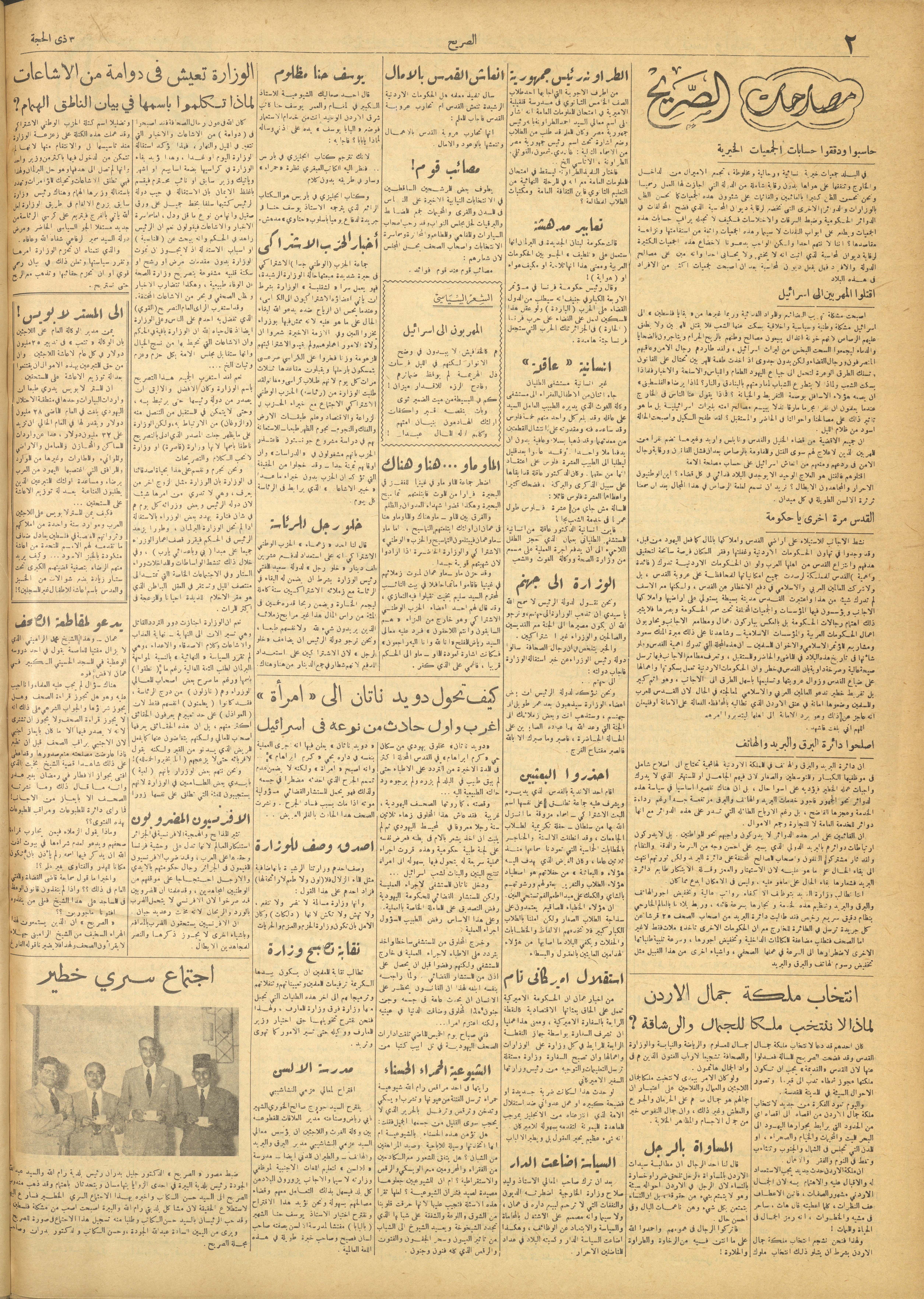 وثيقة مطبوعة باللغة العربية تتضمن العدد 287 من مجلة الصريح، وهي مجلة أسبوعية سياسية نقدية لصاحبها ورئيس تحريرها هاشم السبع. صدر العدد في 23 تموز 1955، وثمنه 15ملّا، واحتوى على العديد من المقالات النقدية التي تتناول الأحداث السياسية في تلك الفترة، من أبرزها: - ذكرى الثورة المصرية بعد 3 سنوات. - المطالبة بدستور جديد في الأردن. - مشروع النقطة الرابعة وتقديمه 45 مليون ليرة و400 ألف يوم عمل لمشروع اليركون لدولة الاحتلال الإسرائيلي. - الانتخابات الداخلية في "إسرائيل" والتمييز ضد الفلسطينيين.
