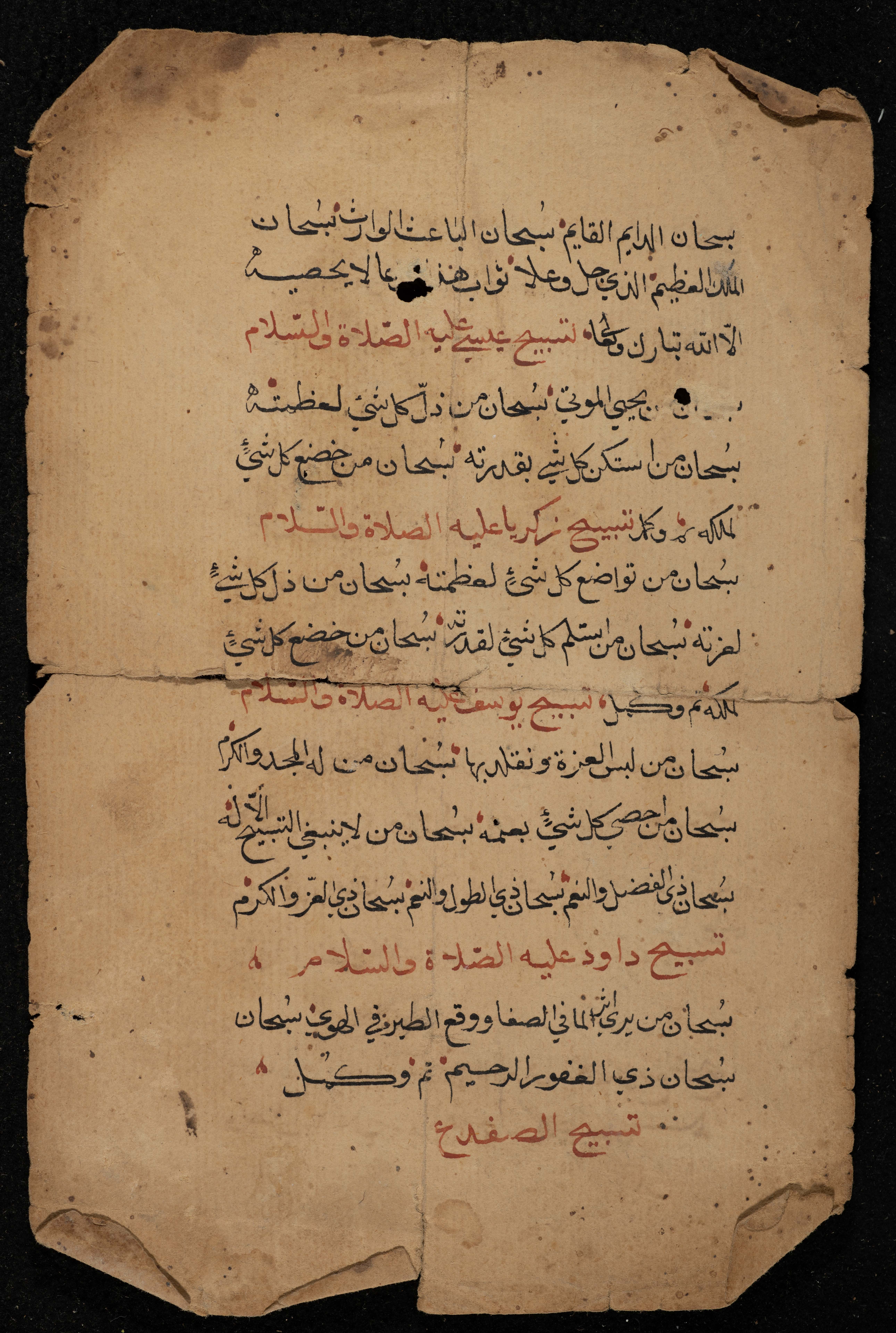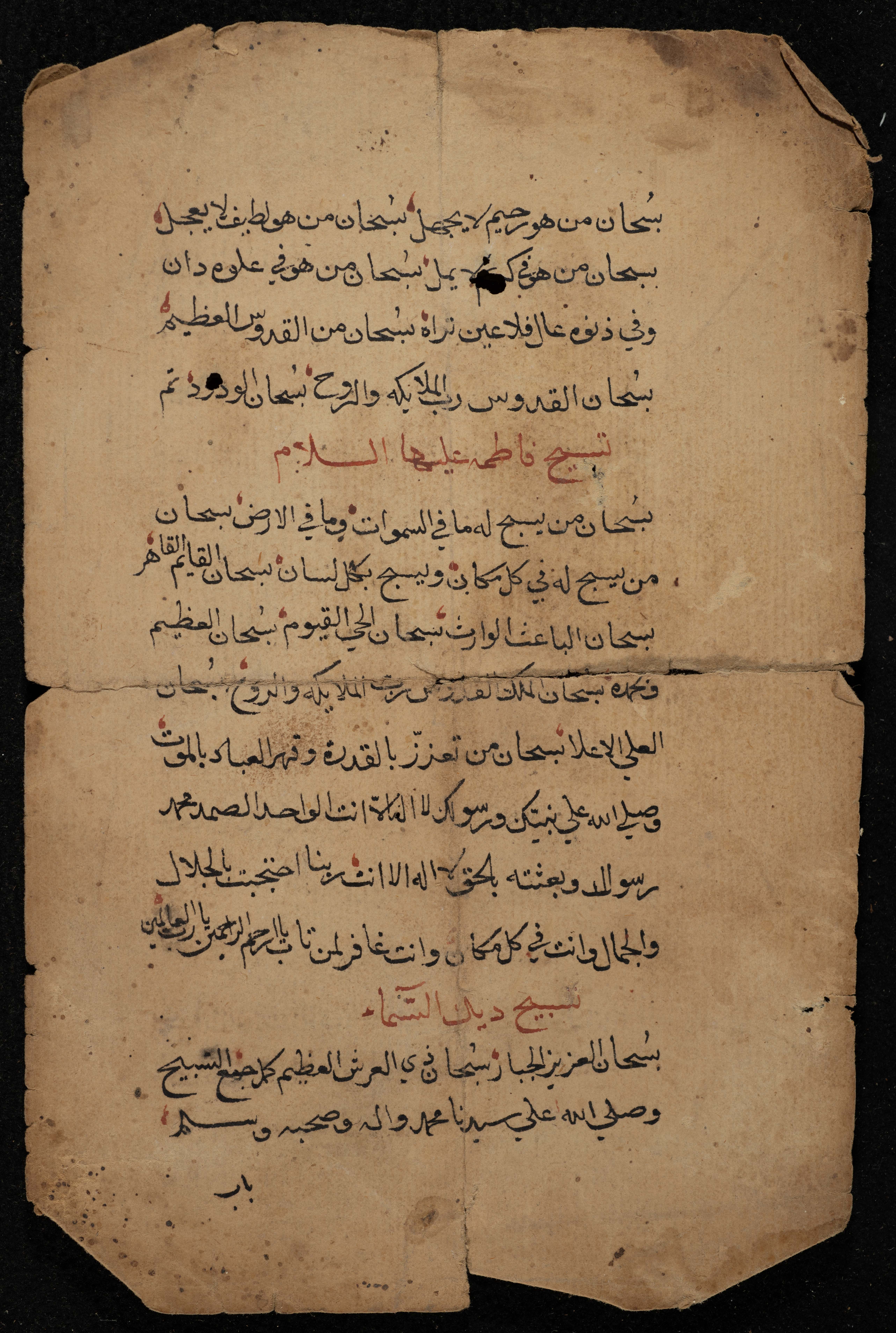 صفحتان من مخطوطة تحتوي مجموعة تسابيح ومع كل تسبيح اسم مؤديه، وهم الأنبياء عيسى وموسى وزكريا وداود، وفاطمة بنت محمد، كما ذكر تسبيح الديك والضفدع.