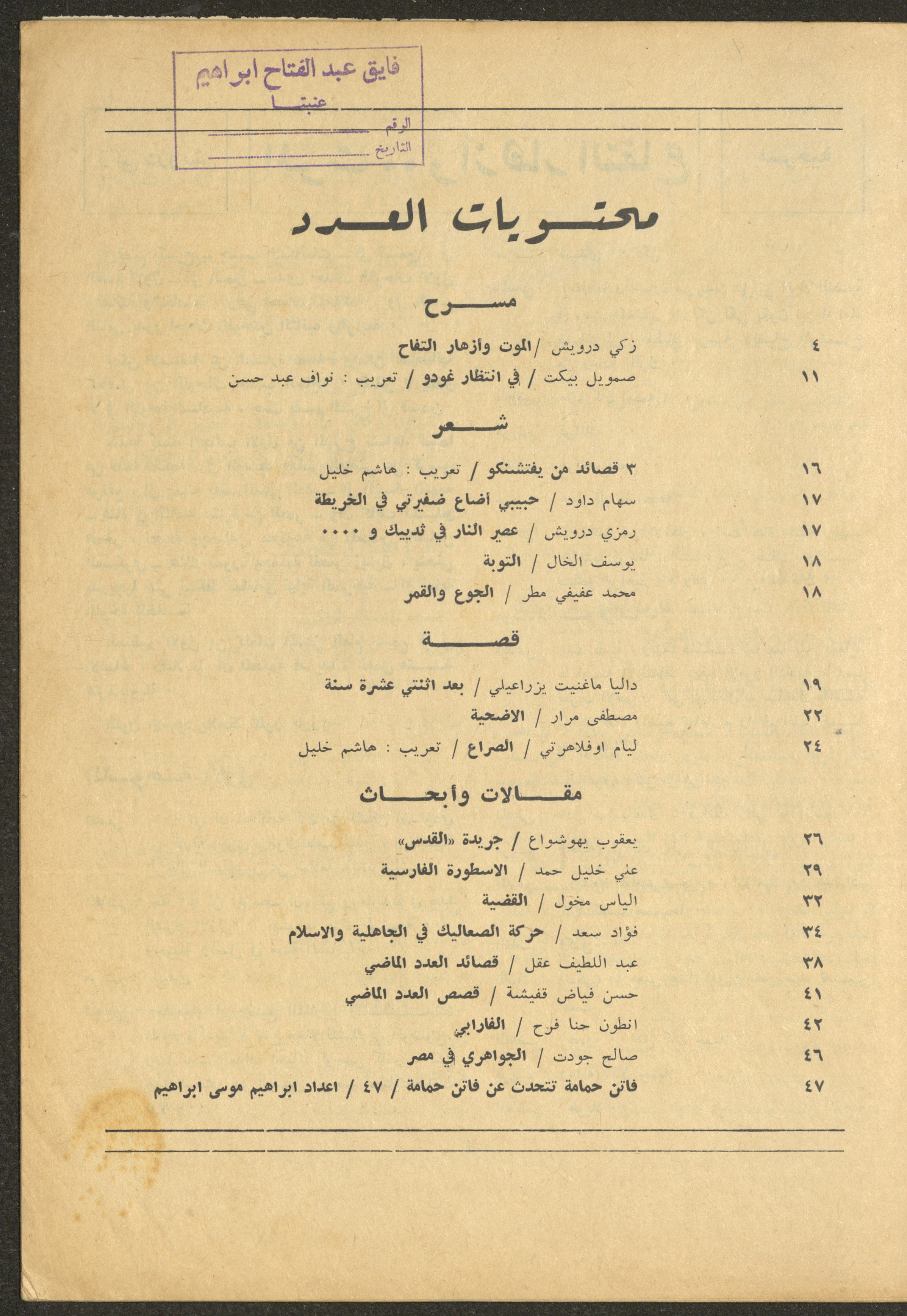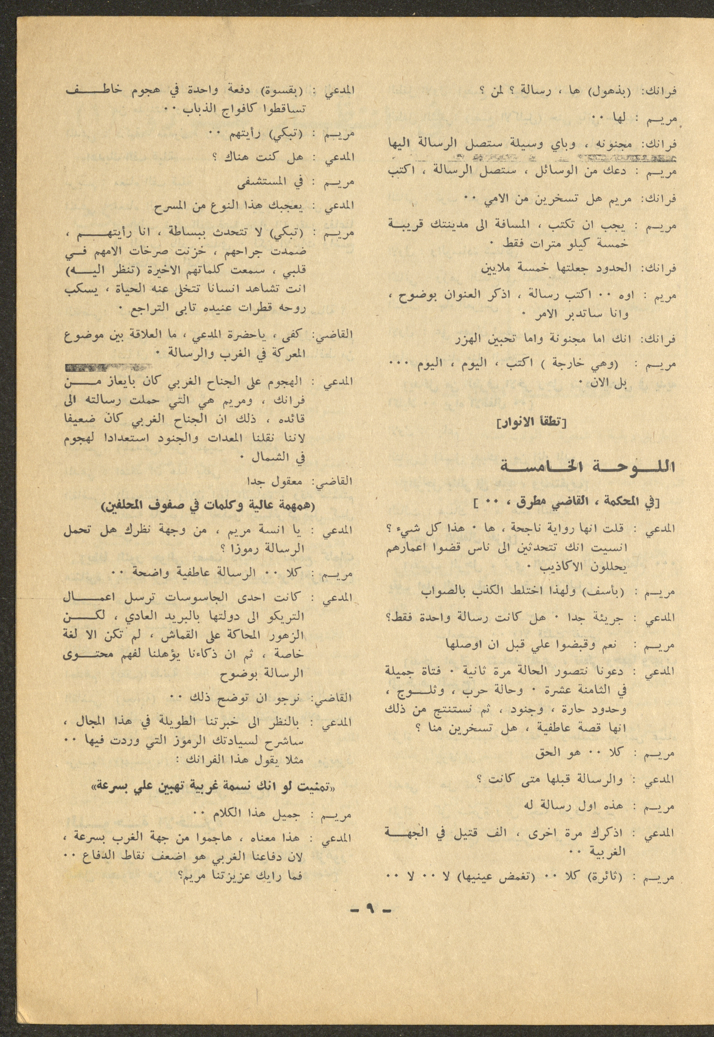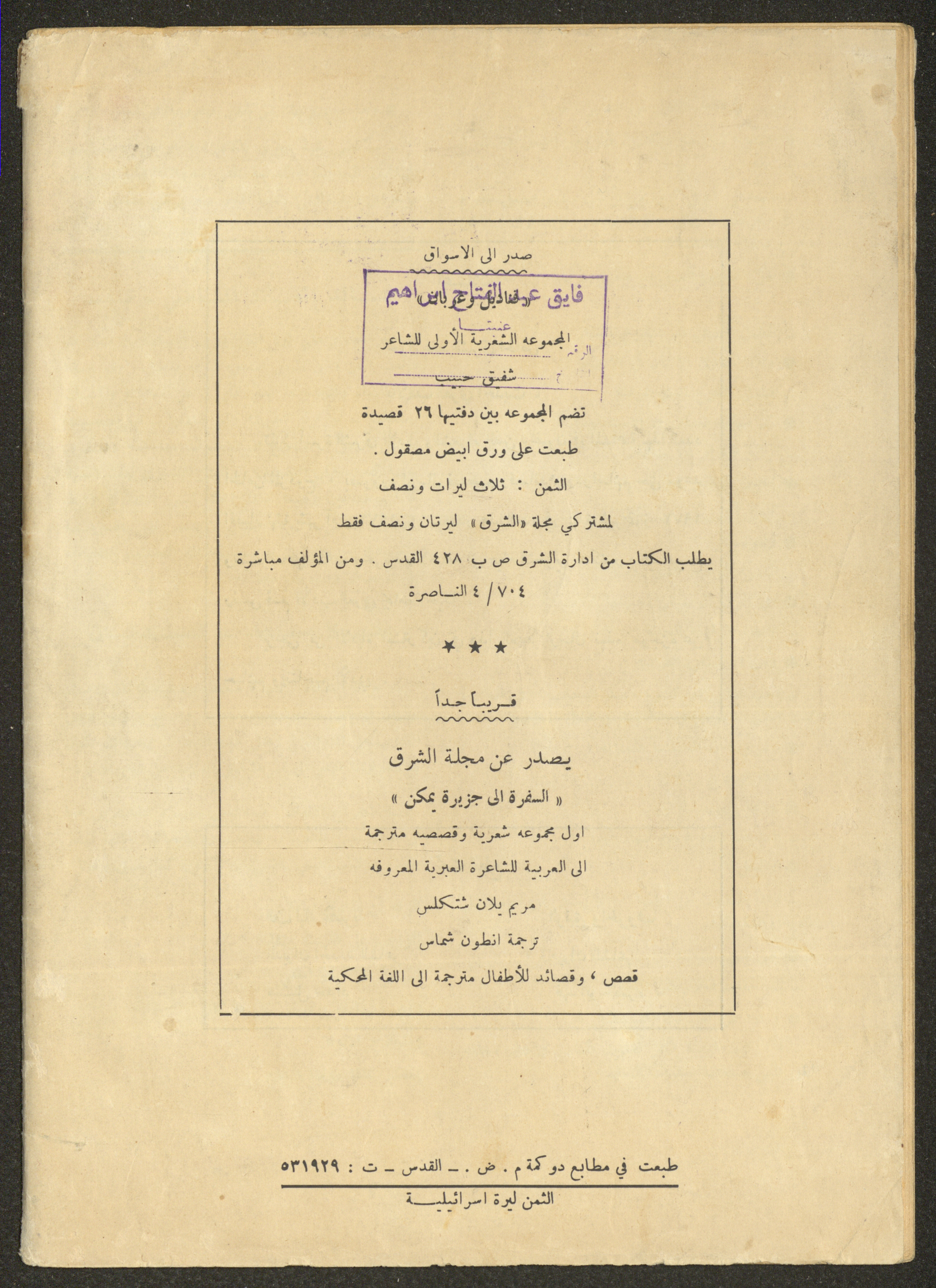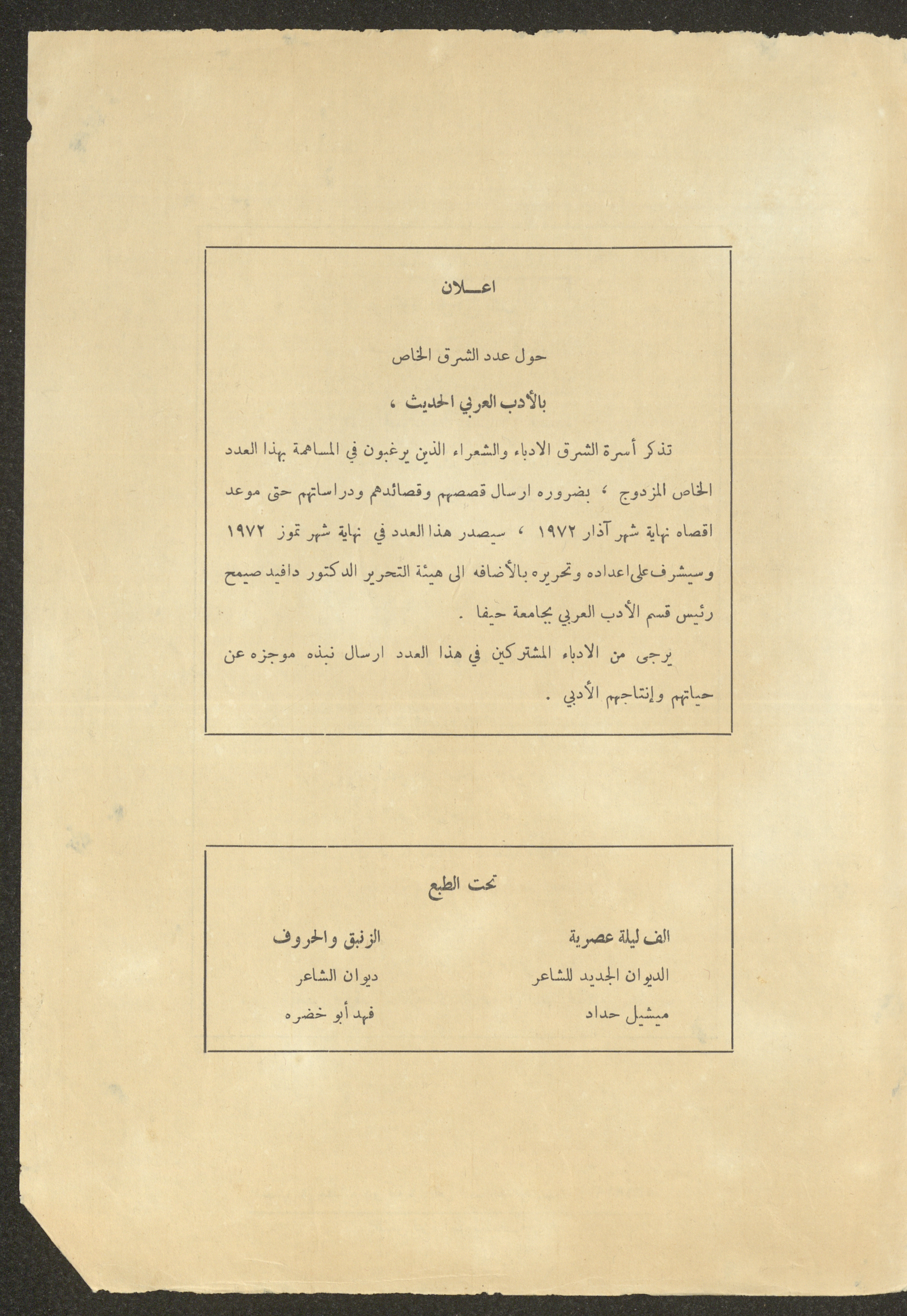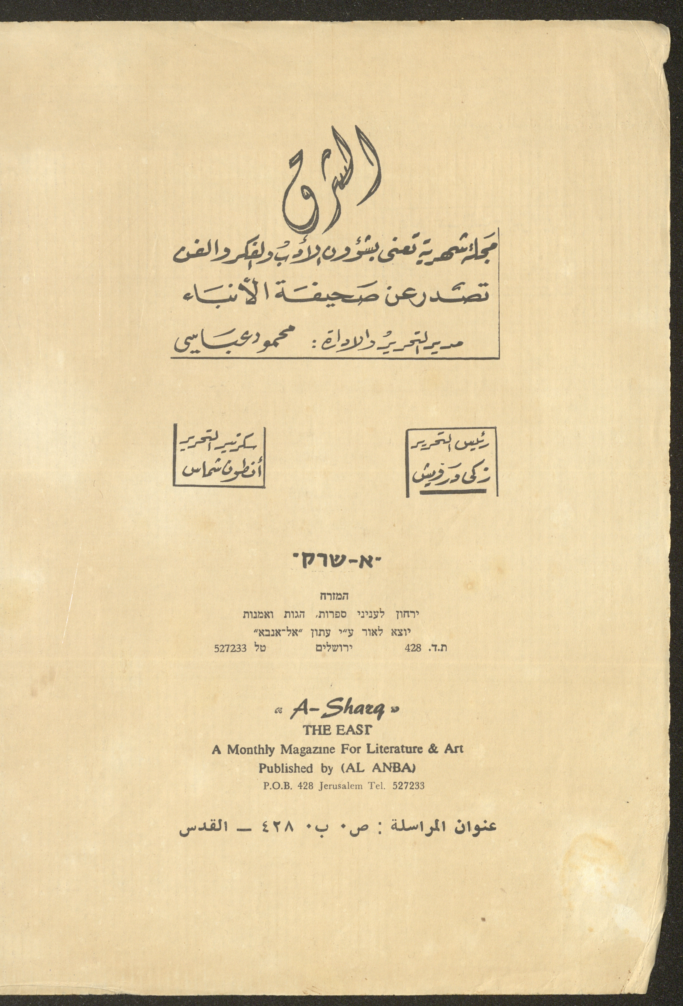 وثيقة مطبوعة باللغة العربية، مكونة من 50 صفحة، تتضمن العدد التاسع من مجلة الشرق الصادر في شهر شباط عام 1972، وهي مجلة شهرية تعنى بشؤون الأدب والفكر والفن، كانت تصدر عن صحيفة الأنباء تحت إشراف مدير التحرير محمود عباسي، وطبعت في مطبعة دوكمة في القدس، إذ بلغ ثمن العدد ليرتان وتضمنت صورًا ومقالات وأبحاث وأشعار وقصص، منها: - "في انتظار جودو"، مسرحية بقلم صمويل بيكت وتعريب نواف عبد حسن. - "الموت وأزهار التفاح"، مسرحية بقلم زكي درويش. - "حبيبي أضاع ضفيرتي في الخريطة"، قصيدة بقلم سهام داود. - "عصير النار في ثدييك"، قصيدة بقلم رمزي درويش. - "بعد اثنتي عشرة سنة"، قصة بقلم داليا ماغنيت يزراعيلي. - "الأضحية"، قصة بقلم مصطفى مرار. - "الأسطورة الفارسية"، بحث من إعداد علي حمد. - "القضية"، مقال قلم الياس مخول.