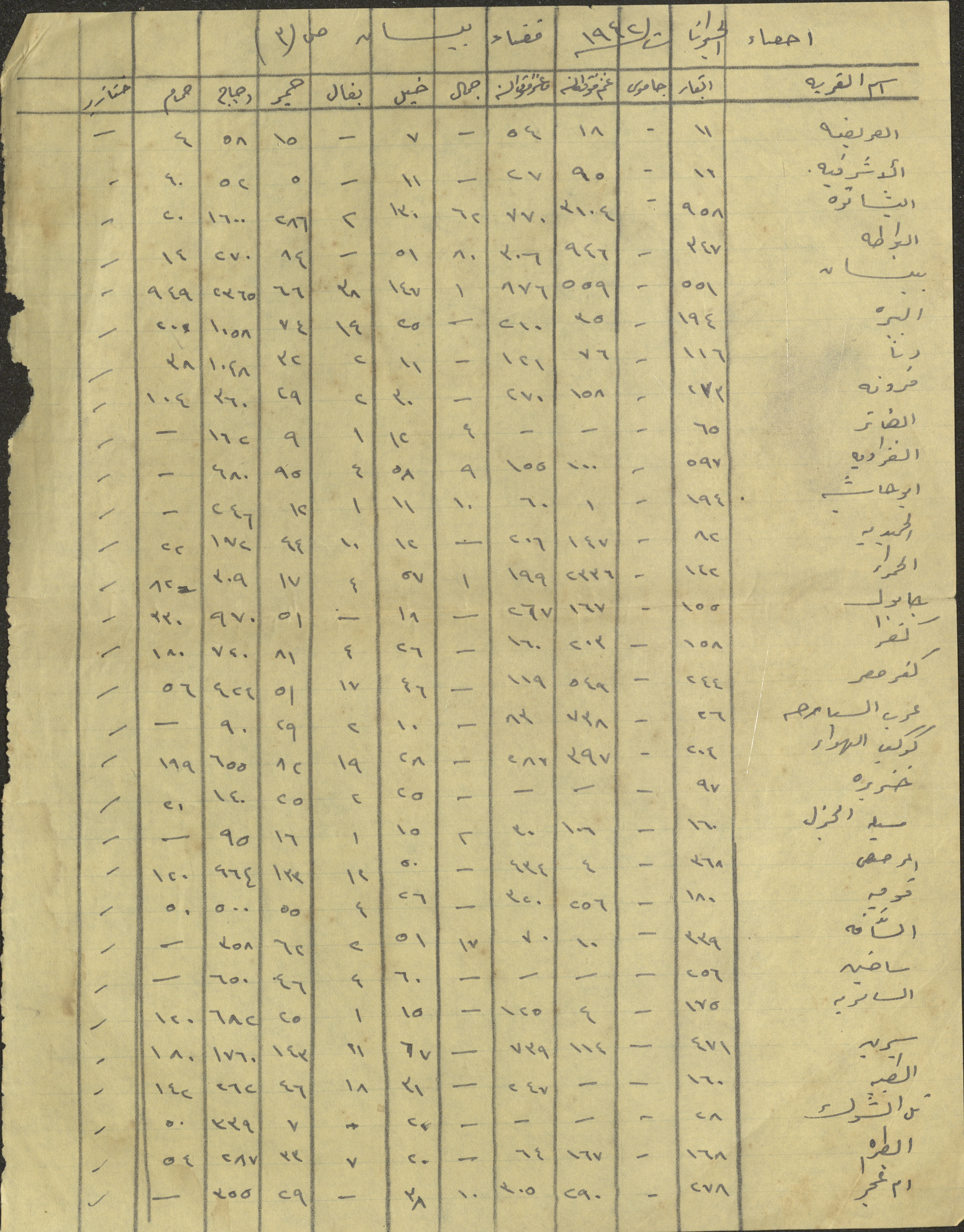 Found in the Wajih Abdel-Baqi Collection and handwritten in Arabic, this 1-page document shows a census of domesticated animals in the district of Bisan City in 1942, which contained a list of the names and numbers of animals in the mentioned area. Among these villages were the villages of al-Ghazzawiyya and al-Ashrafiyya and among the animals were cows, goats, camels, donkeys and others.