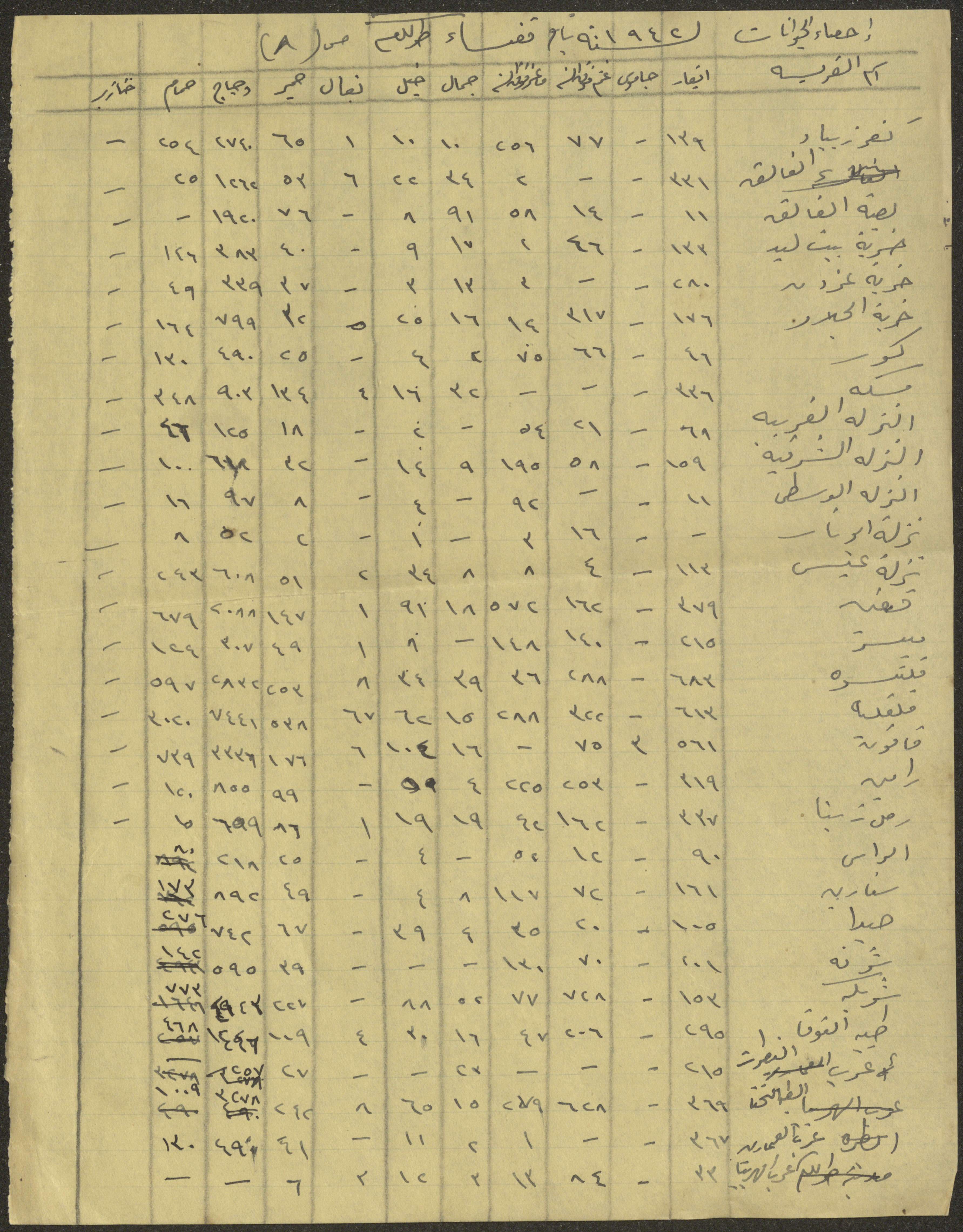 Found in the Wajih Abdel-Baqi Collection and handwritten in Arabic, this 1-page document shows a census of domesticated animals in the district of Tulkarm City in 1942, which contained a list of the names and numbers of animals in the mentioned area.
