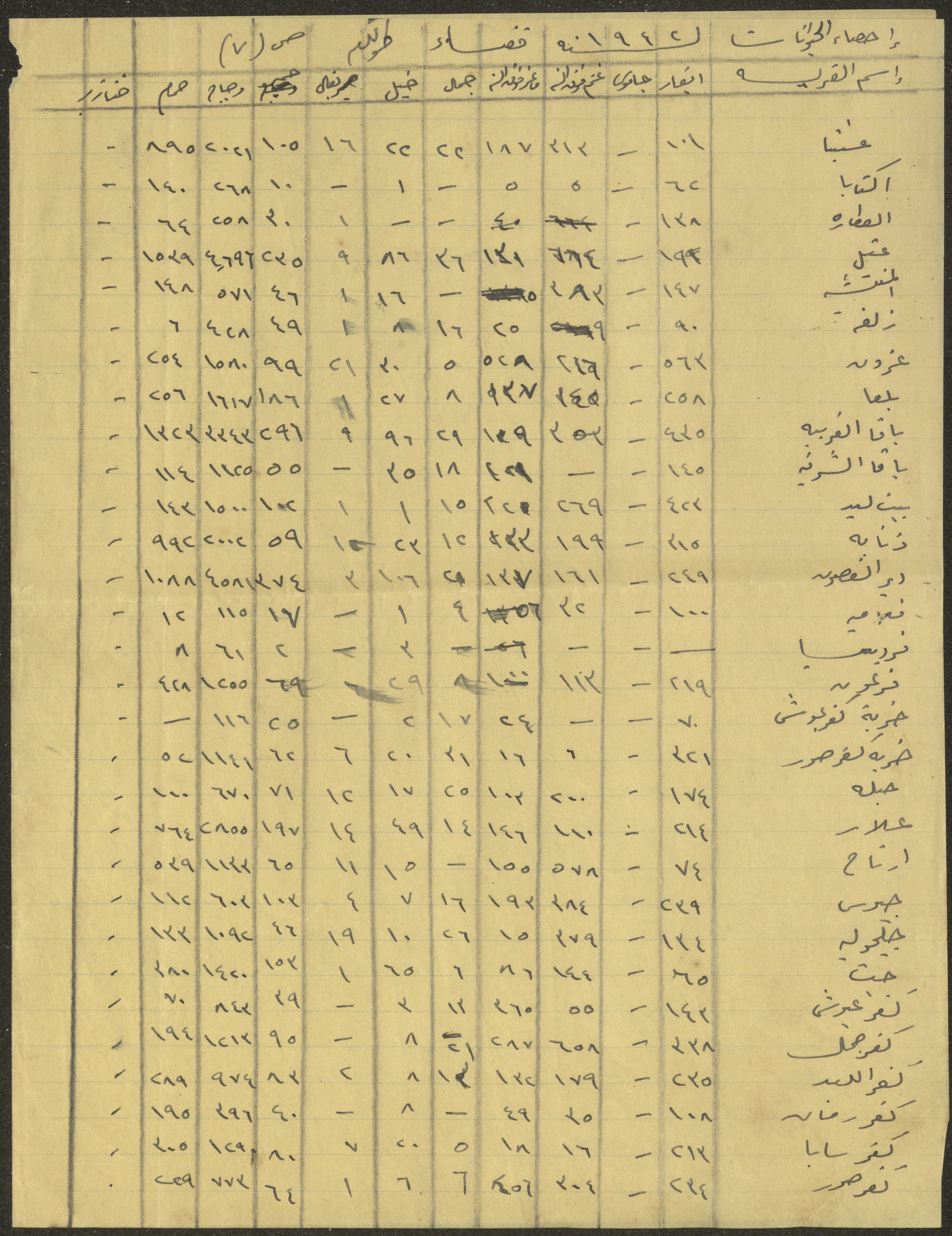 Found in the Wajih Abdel-Baqi Collection and handwritten in Arabic, this 1-page document shows a census of domesticated animals in the district of Tulkarm City in 1942, which contained a list of the names and numbers of animals in the mentioned area.