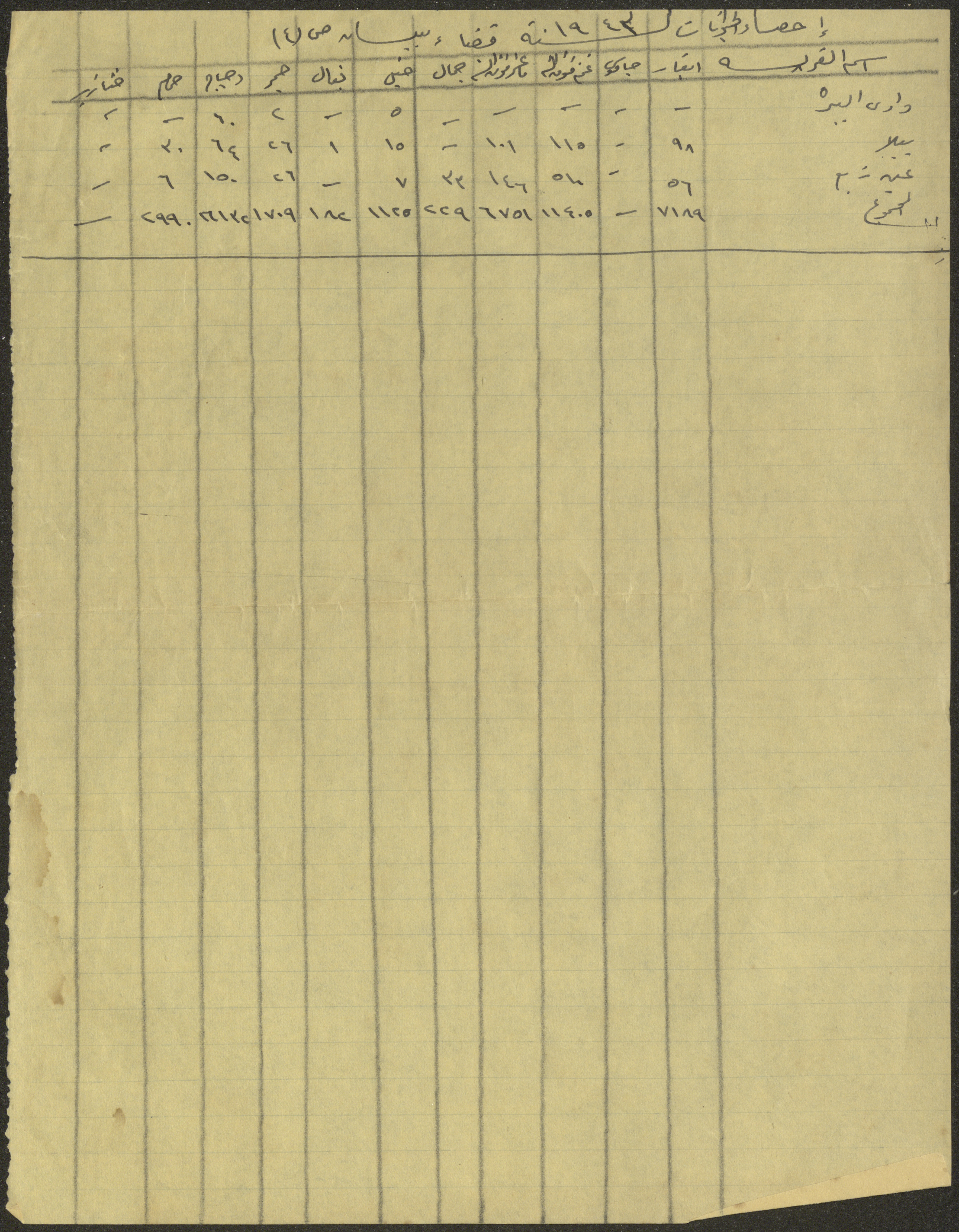 Found in the Wajih Abdel-Baqi Collection and handwritten in Arabic, this 1-page document shows a census of domesticated animals in the district of Bisan City in 1943, which contained a list of the names and numbers of animals in the mentioned area.