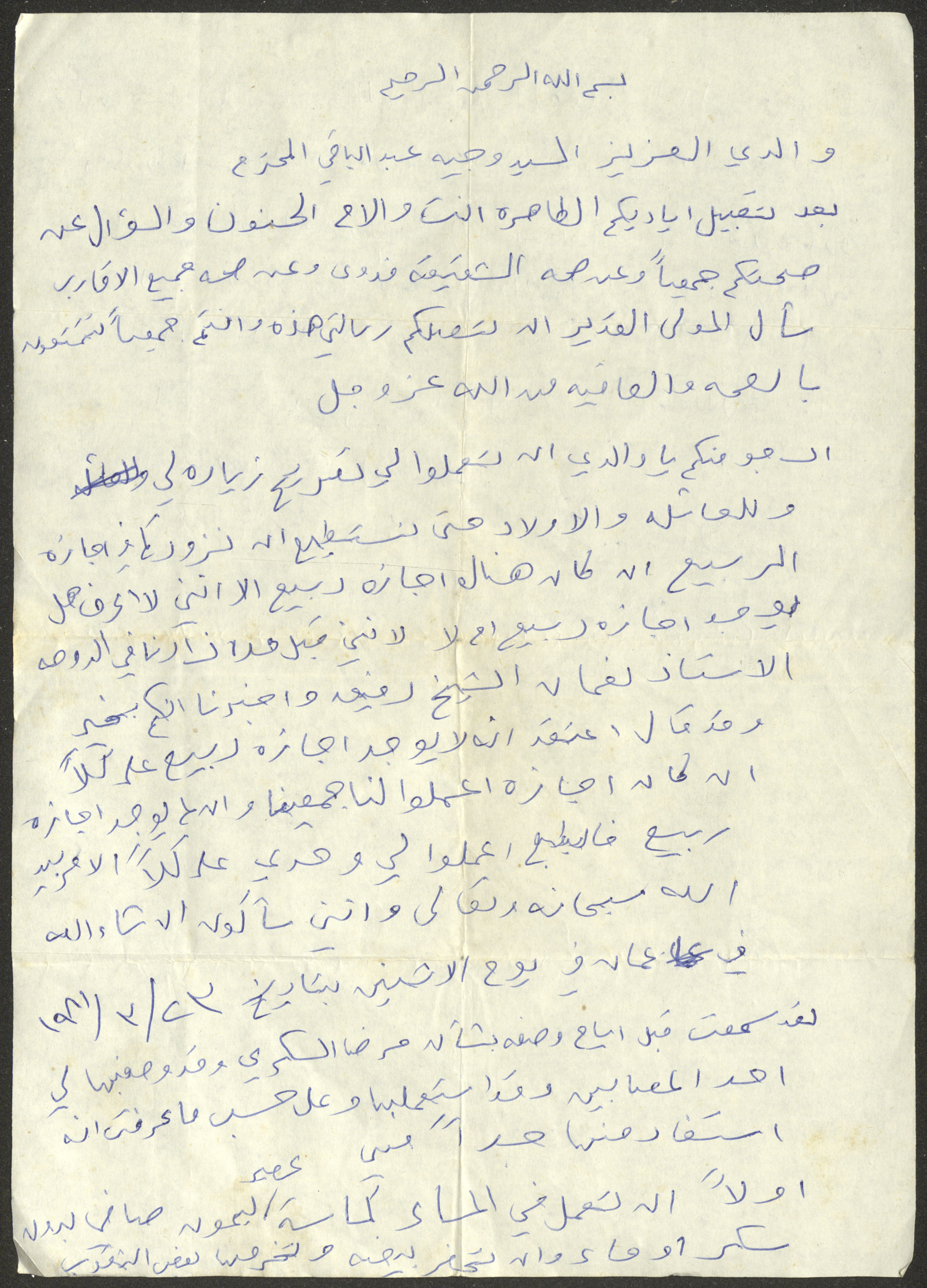 A Letter Addressed to Wajih Abdel-Baqi from His Son Mohammad Saeed