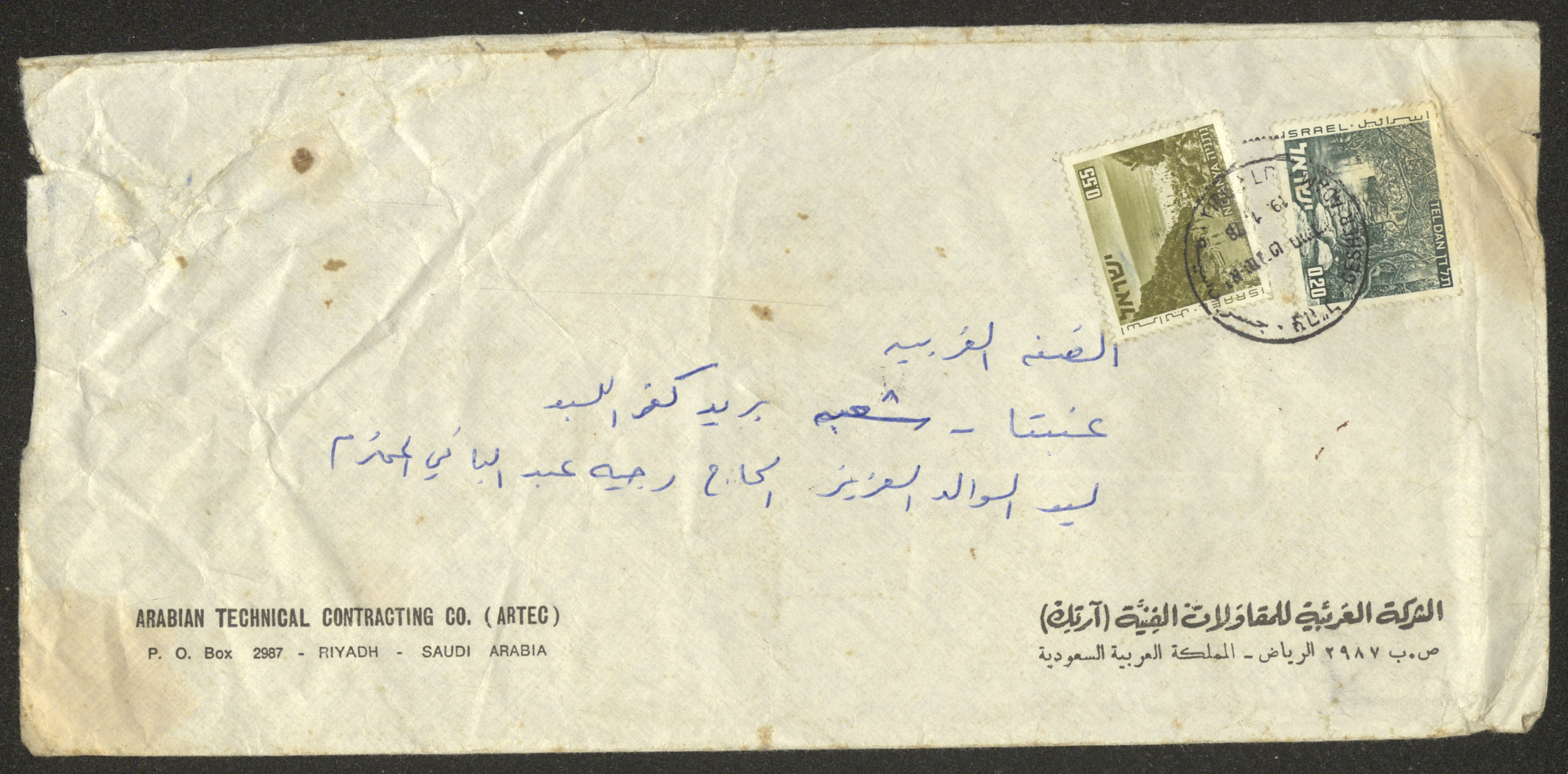 Printed in Arabic, this 2-page document shows a letter envelope addressed to Wajih Abdel-Baqi in Anabta- Nablus District from his son Nabil Abdel-Baqi in Riyadh- Saudi Arabia, where the envelope shows the name of the Arabian Technical Contracting Company (ARTEC).