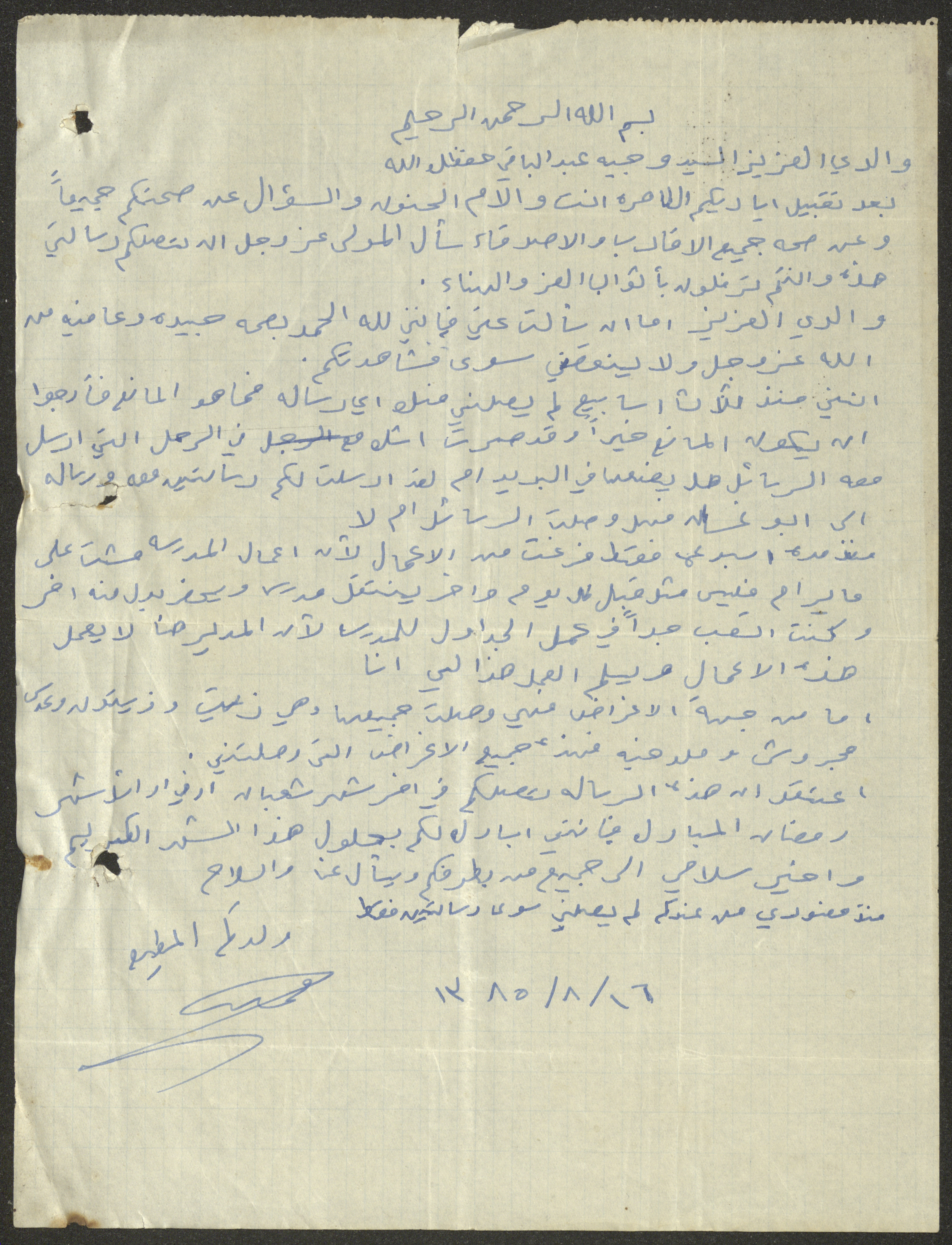 A Letter to Wajih Abdel-Baqi from His Son Mohammad, 16 August 1985