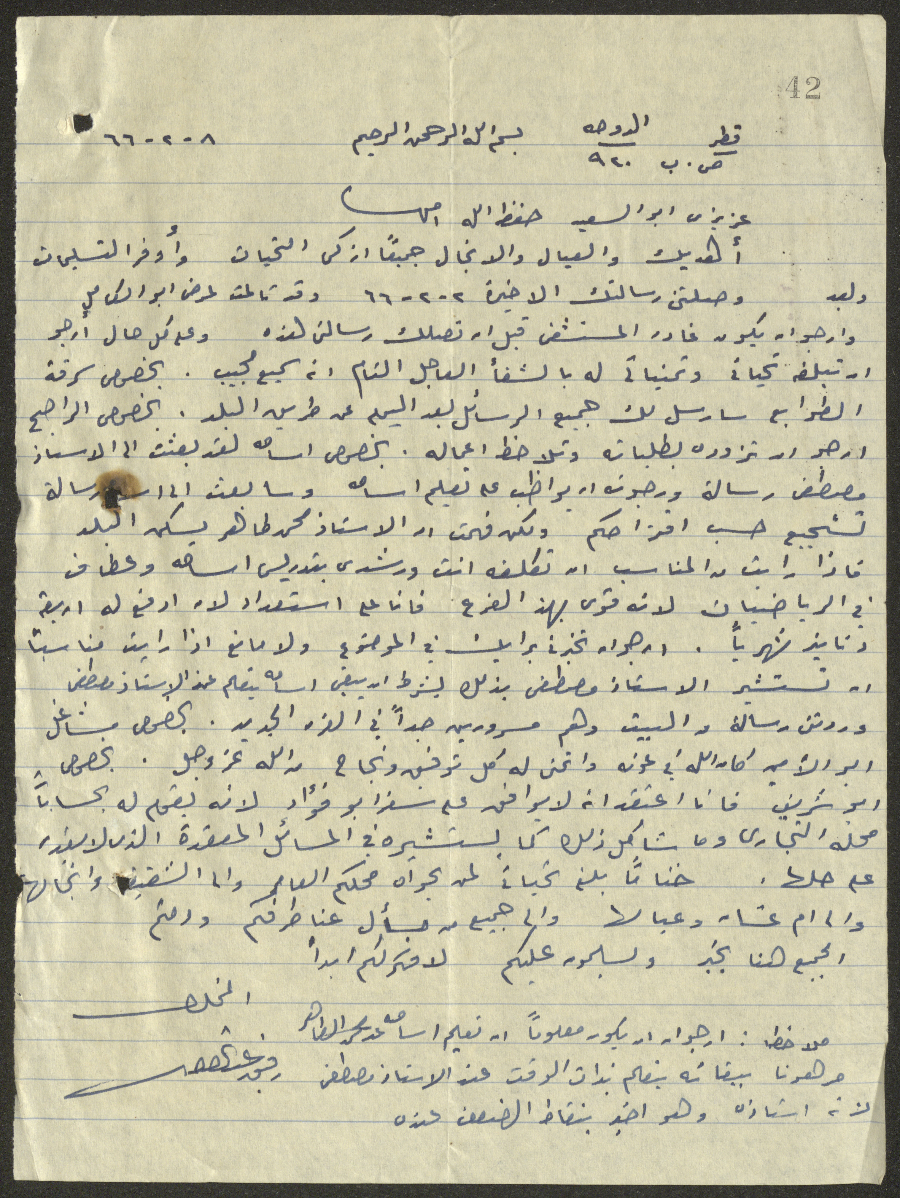 Handwritten in Arabic on 8 February 1966, this 1-page document shows a letter addressed to Wajih Abdel-Baqi from Doha, where the sender acquires after the health and well-being of family and friends and informs him that they will be sending him a collection of stamps.