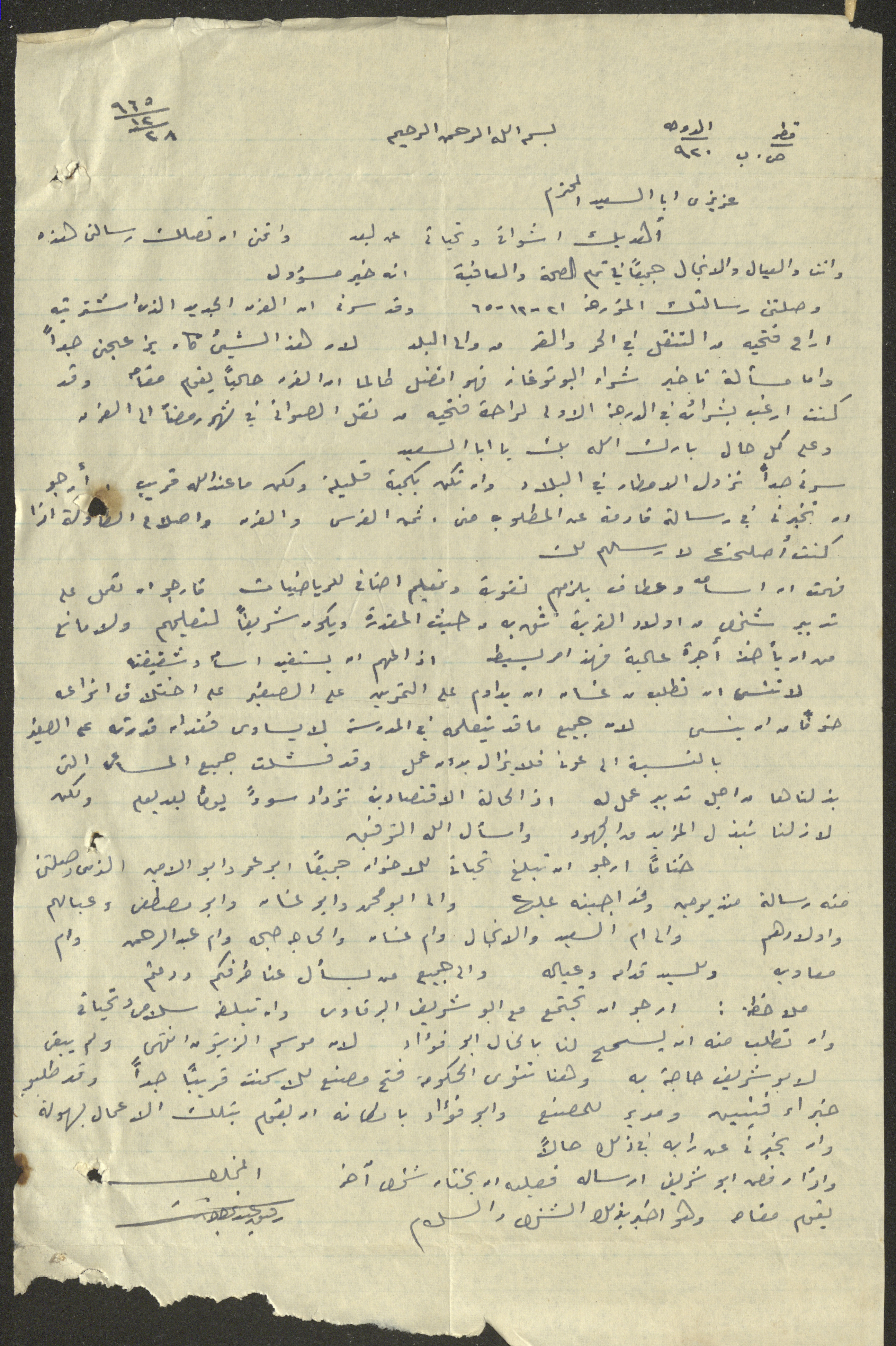 Handwritten in Arabic on 28 January 1965, this 1-page document shows a letter addressed to Wajih Abdel-Baqi from Doha, where the sender acquires after the health and well-being of family and friends and assures him of their well-being.