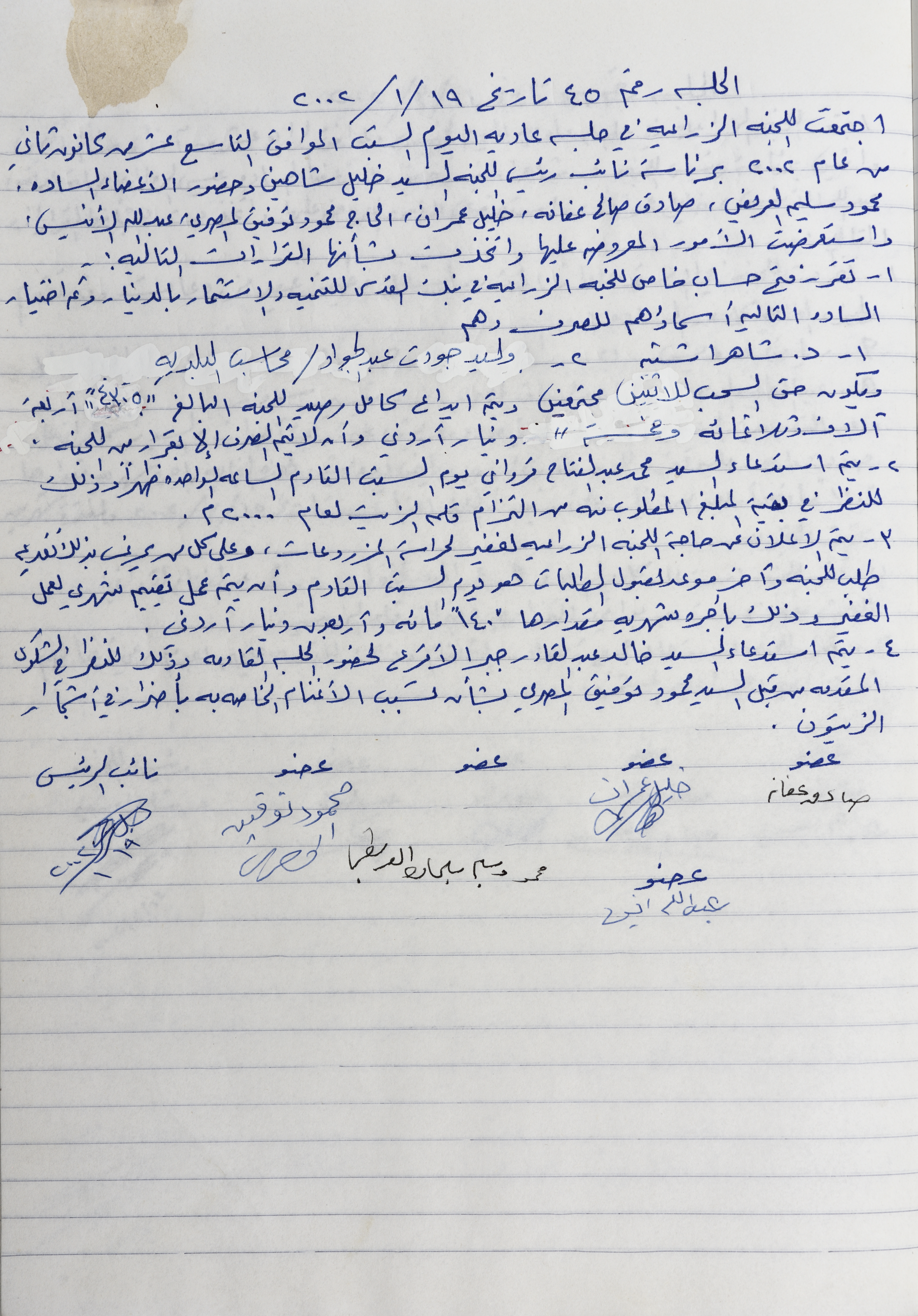 وثيقة تتضمن محضر جلسة اللجنة الزراعية في سلفيت رقم 45، حيث عقدت اللجنة جلسة بتاريخ 19/1/2002 وتناولت الجلسة الوضوعات الآتية: انشاء حساب للجنة الزراعية في بنك القدس ووضع أموال اللجنة فيه وتخويل رئيس البلدية ومحاسب البلدية بإدارة هذا الحساب كذلك قررت اللجنة مطالبة صاحب ضمان قلم الزيت بتسديد ما تبقى عليه من أموال عن ضمان ستة 2000، قررت اللجنة أيضا استدعاء صاحب مواشي في البلدة قدم أحد المزراعين شكوى ضده لانه يقم برعي مواشيه في أراضي صاحب الشكوى